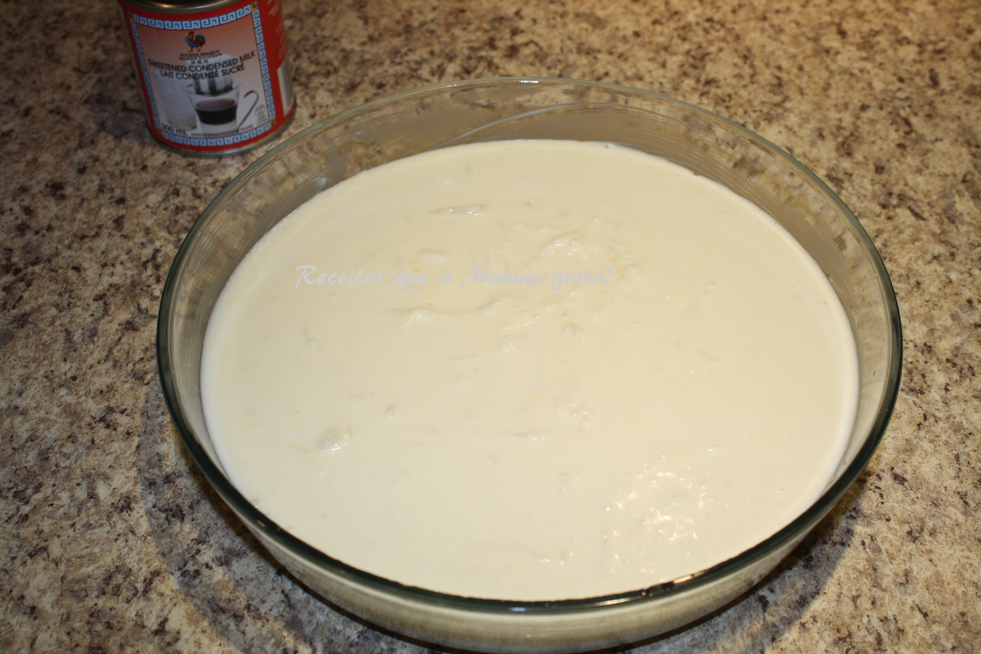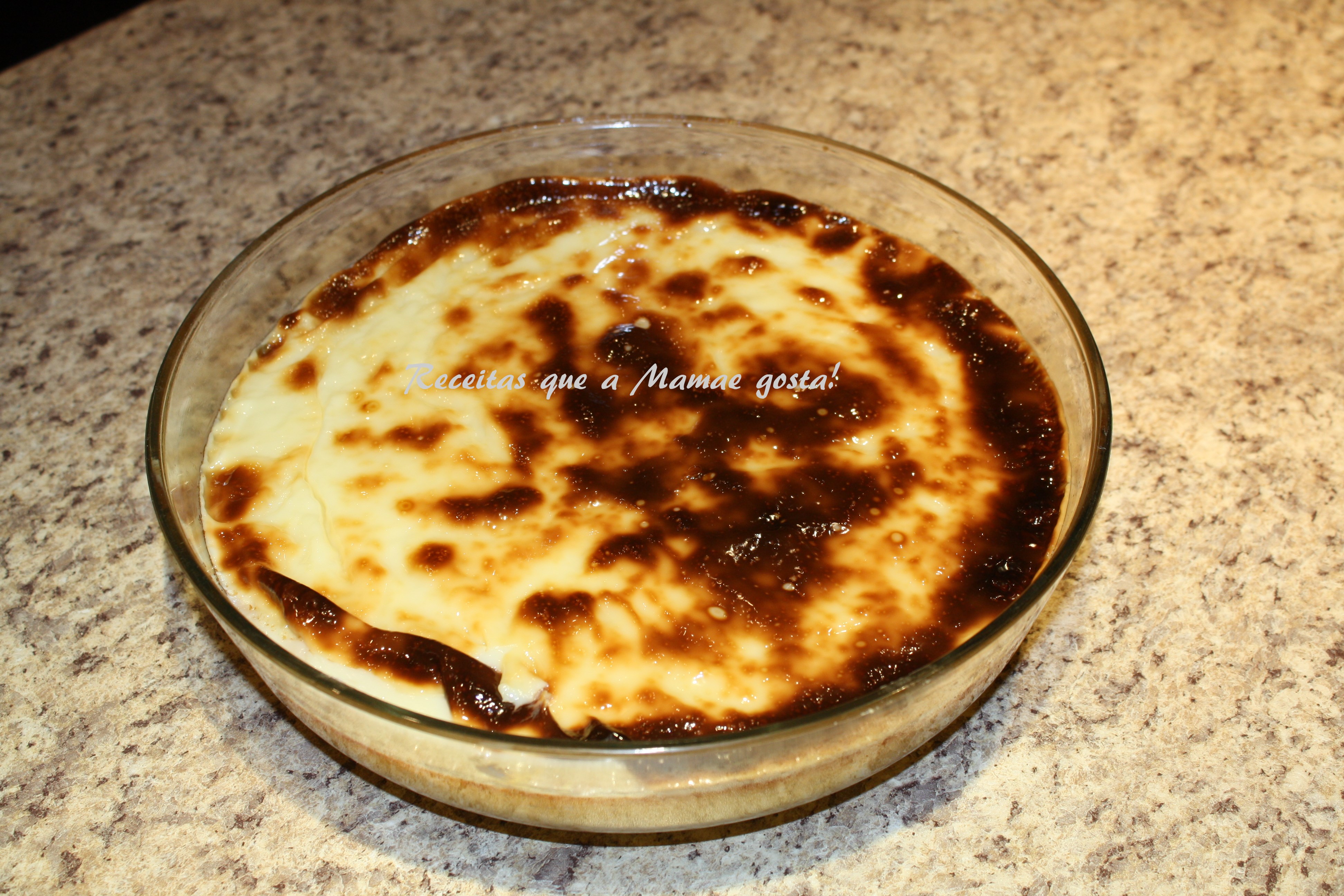 Quando esse pudim estiver cozido, retire do forno e esparrame por cima dele o leite condensado e leve novamente ao forno para grelhar. Fique de olho nessa hora para não passar do ponto e acabar queimando o leite condensado…