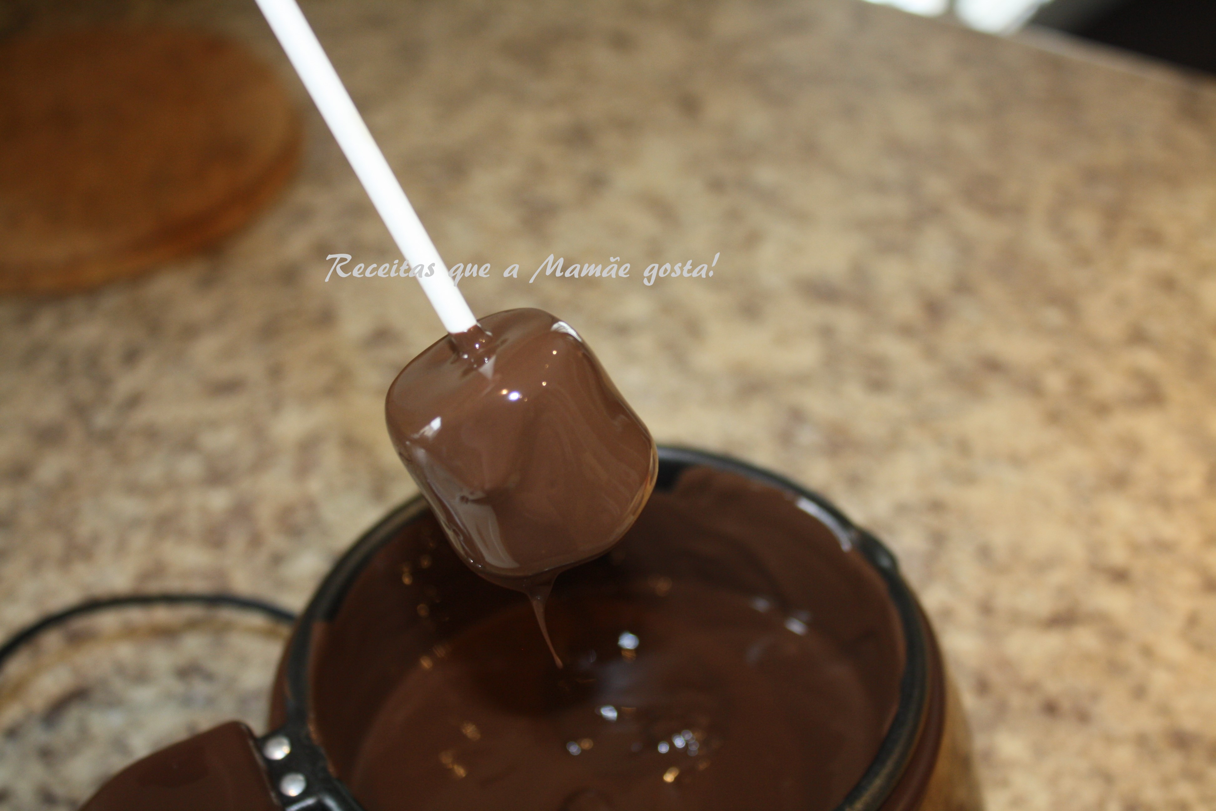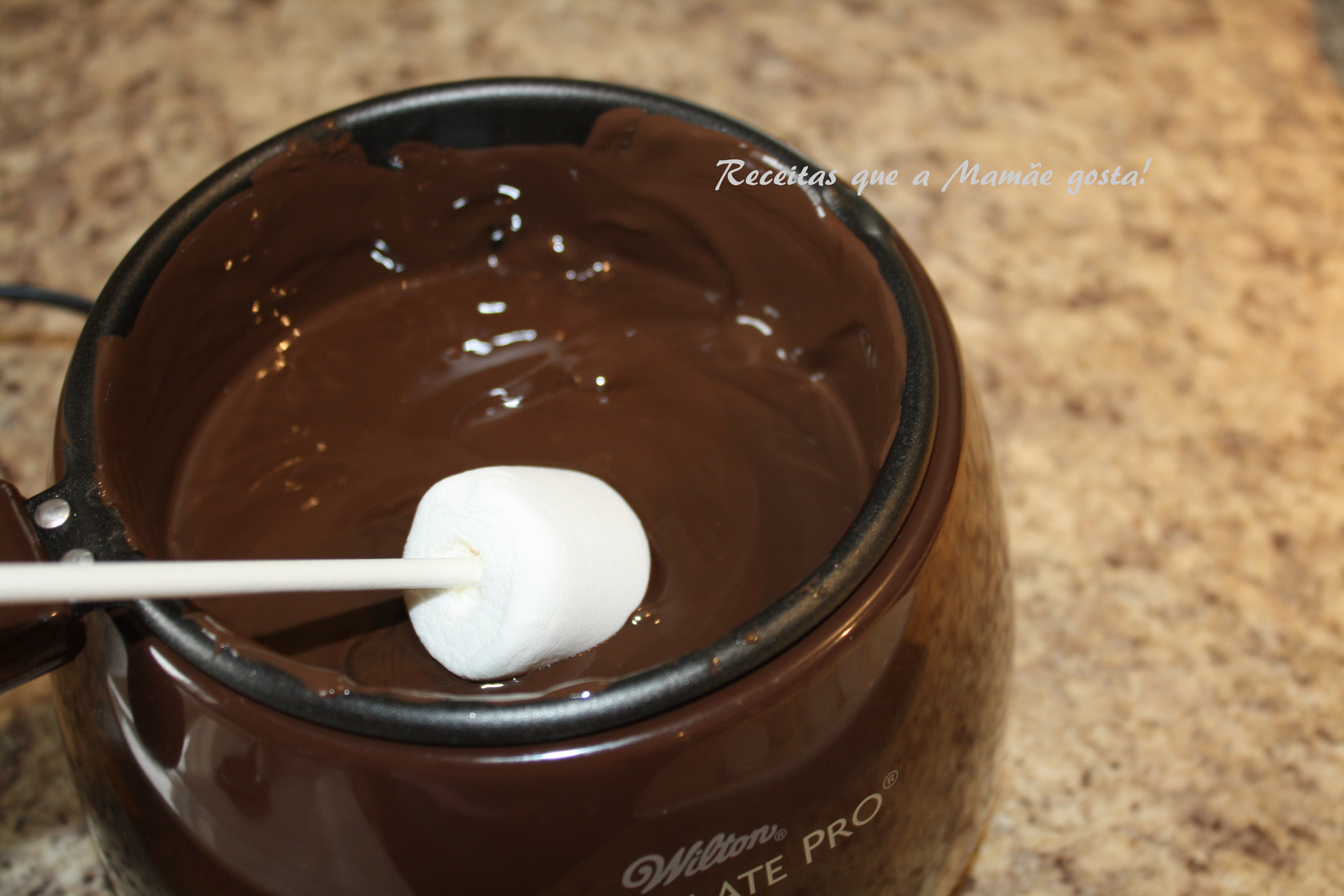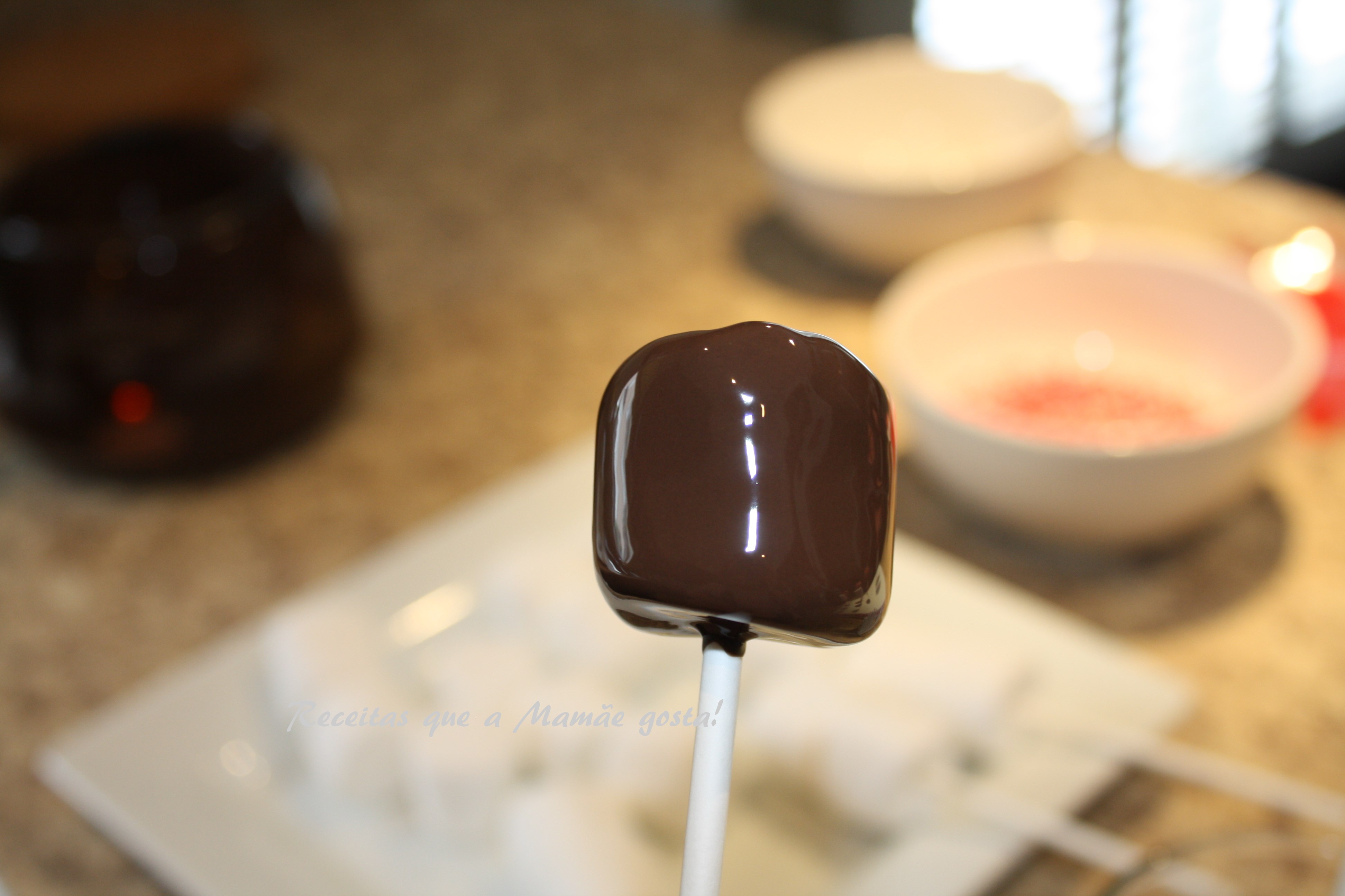 Quando o chocolate estava no ponto, mergulhei o marshmallow no chocolate derretido e deixei escorrer todo excesso.