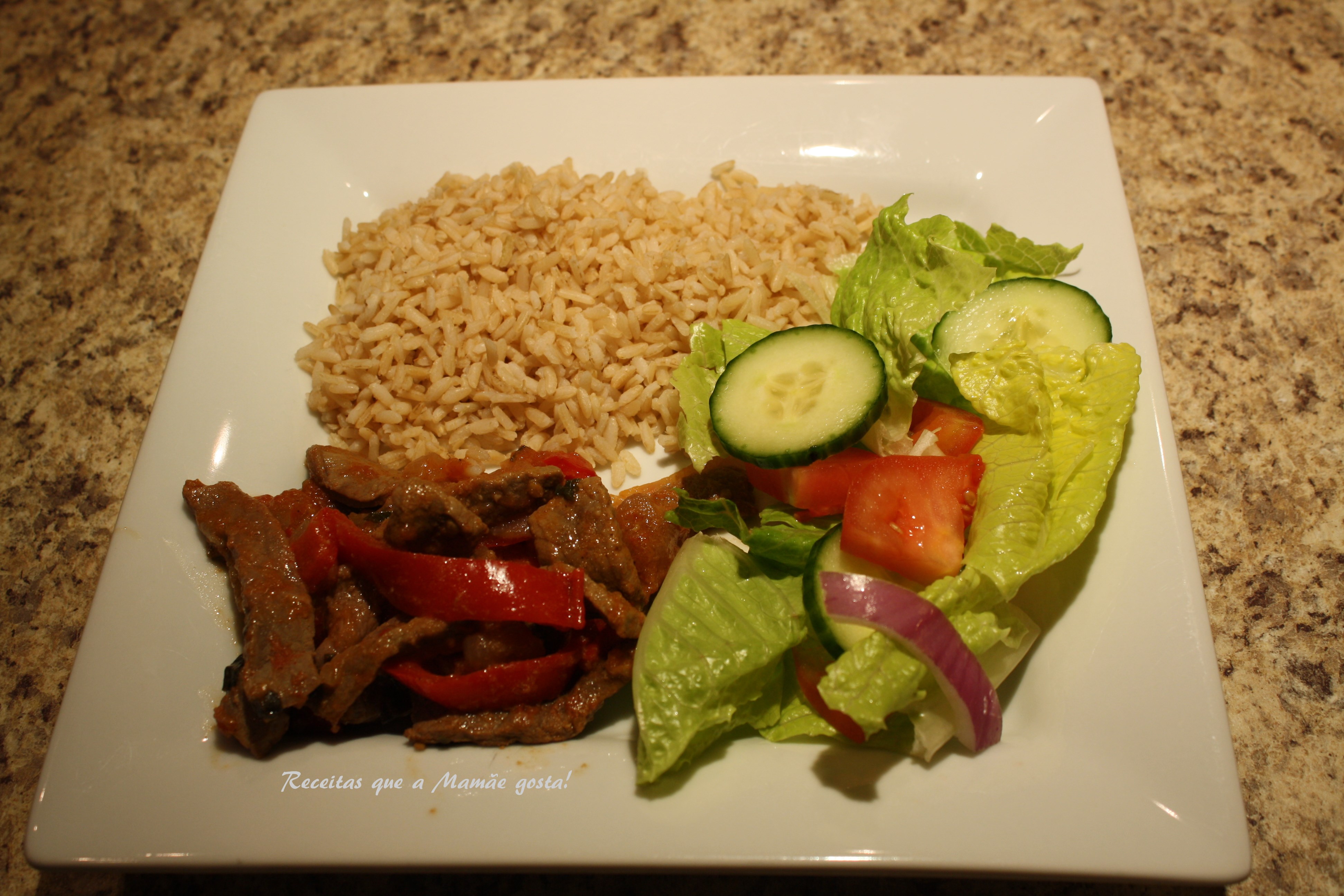 Cortar os bifes em tirinhas e temperar com o alho, sal, pimenta-do-reino e páprica (eu costumo colocar um pouco de vinagre também, mas é questão de gosto apenas) . Reserve