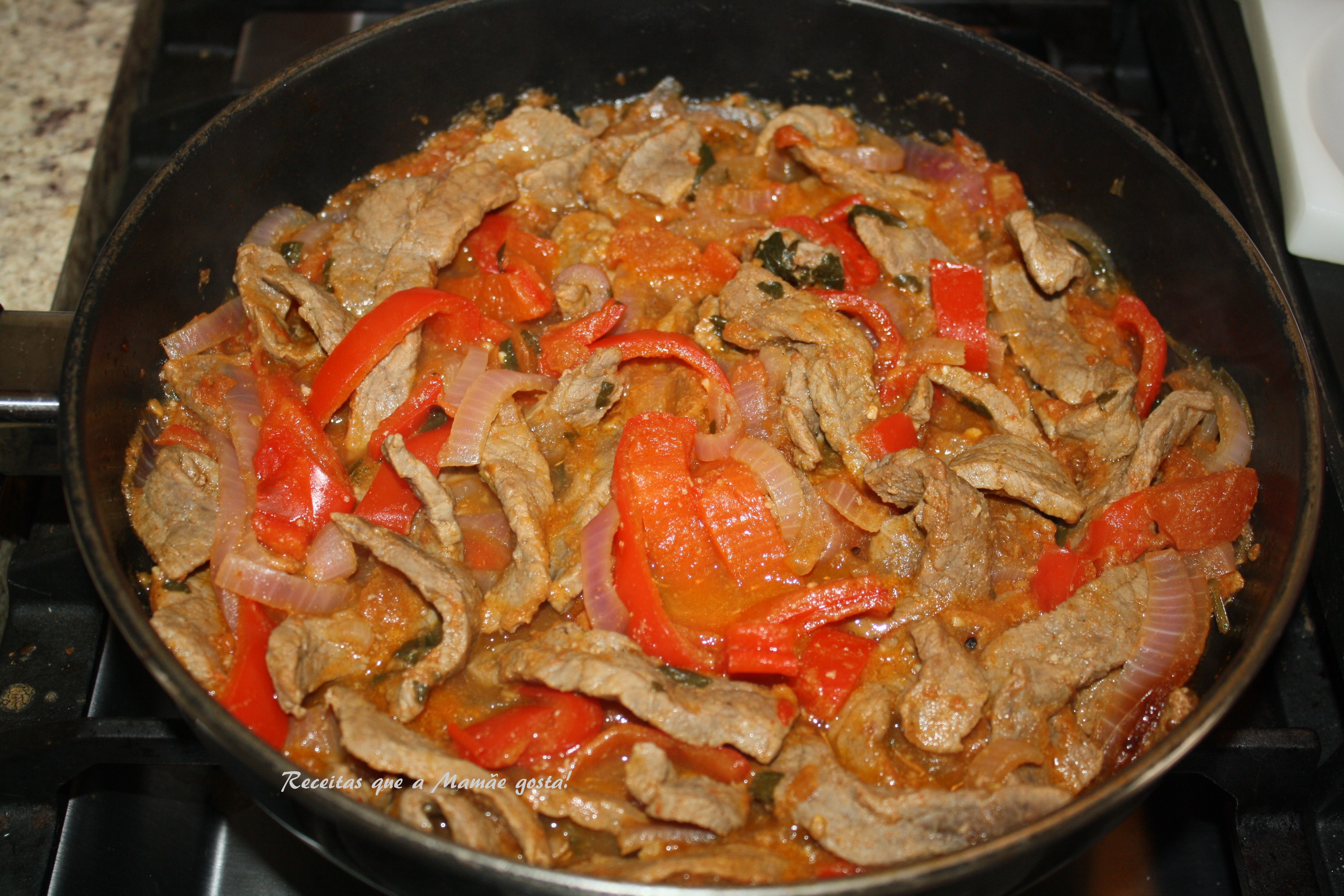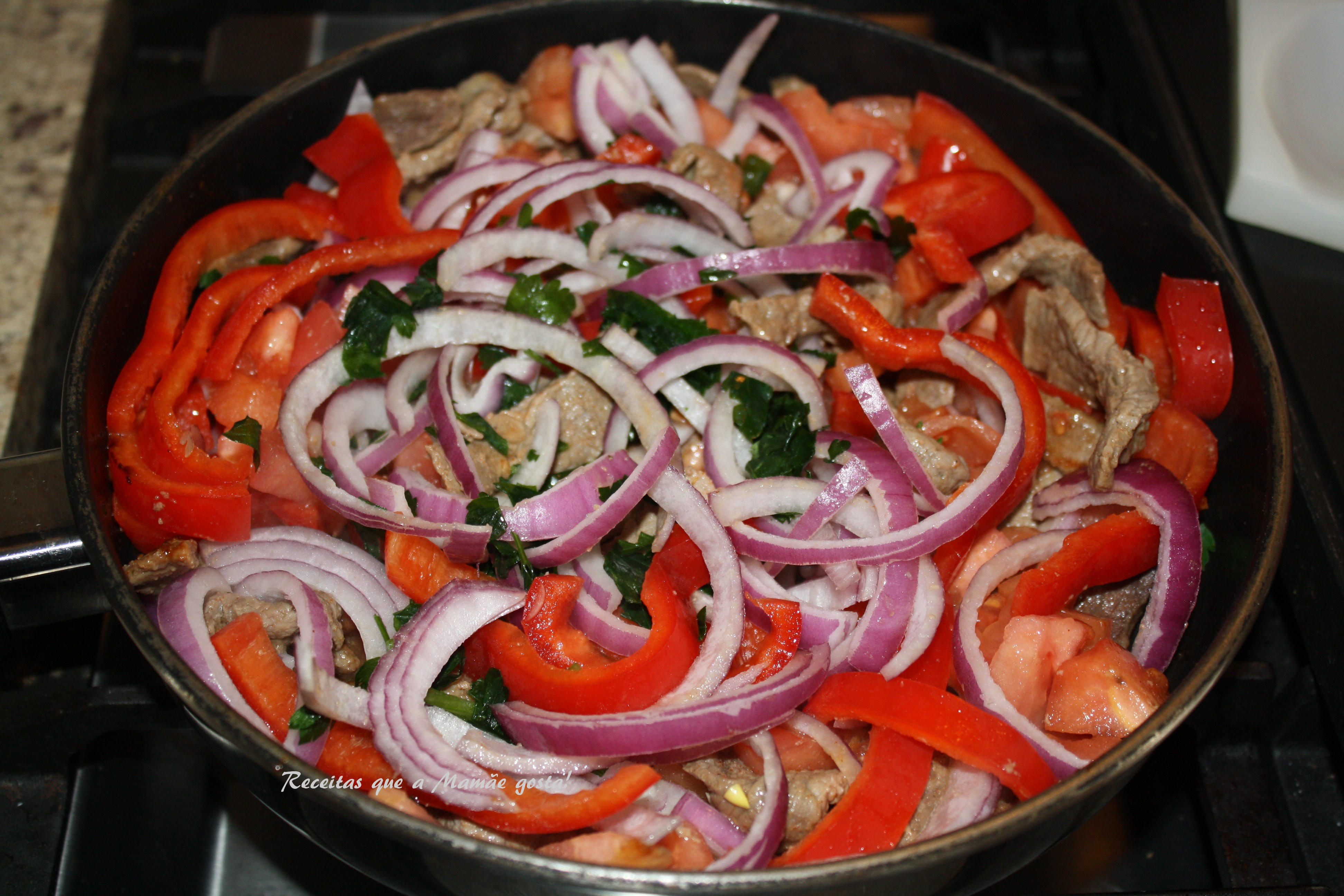 Coloque um pouco de óleo numa panela e quando o óleo estiver quente adicione os bifes em tirinhas, deixe dar uma fritadinha e adicione a água. Deixe cozinhar e quando essa água já estiver quase seca, adicionar os tomates, pimentão, cebola e salsinha. Tampe a panela, coloque em fogo baixo, pois o vapor que se formar terminará com o cozimento da carne e demais ingredientes.