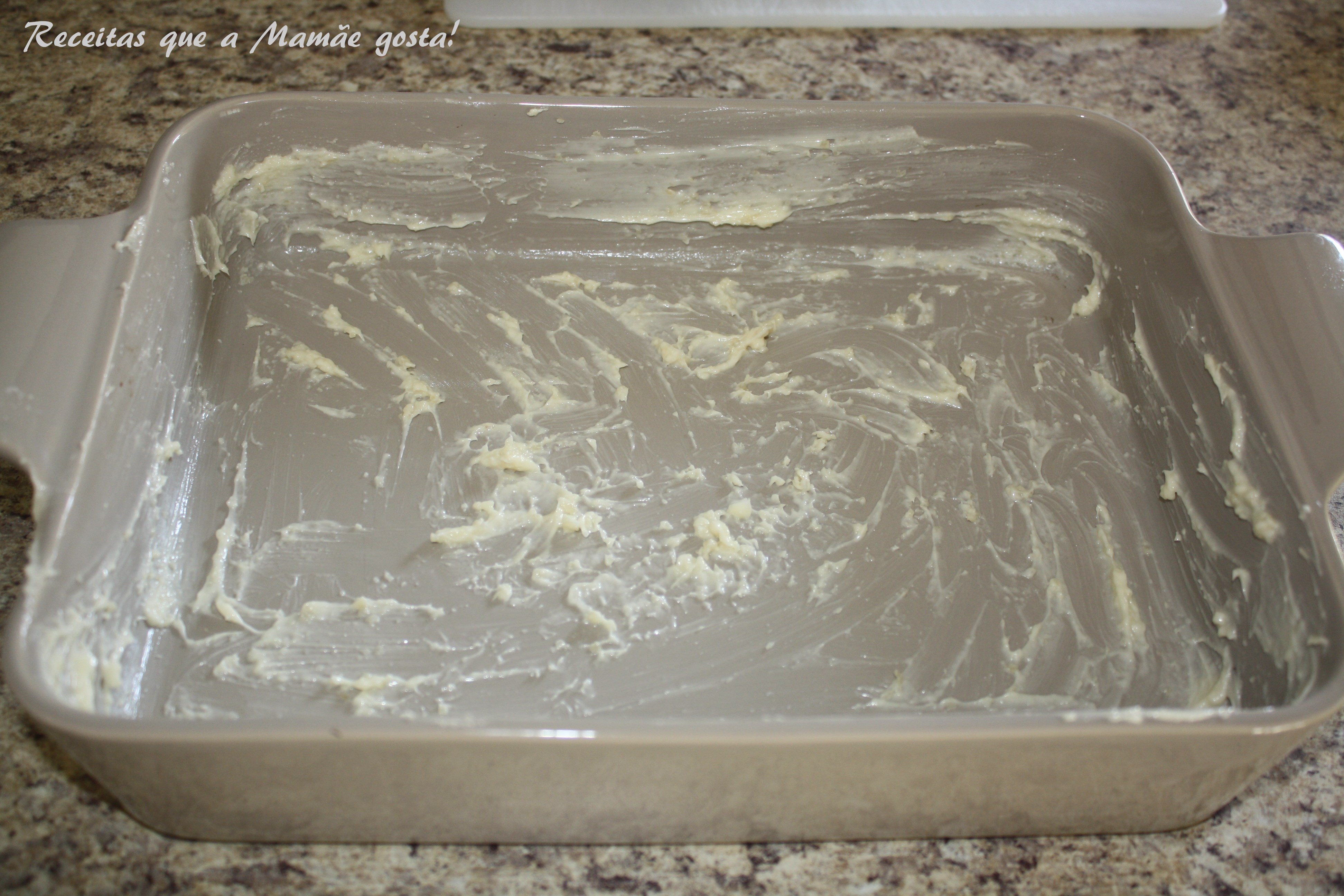 Misturar a margarina com o alho amassado. Passe essa mistura num refratário, untando todos os cantos.