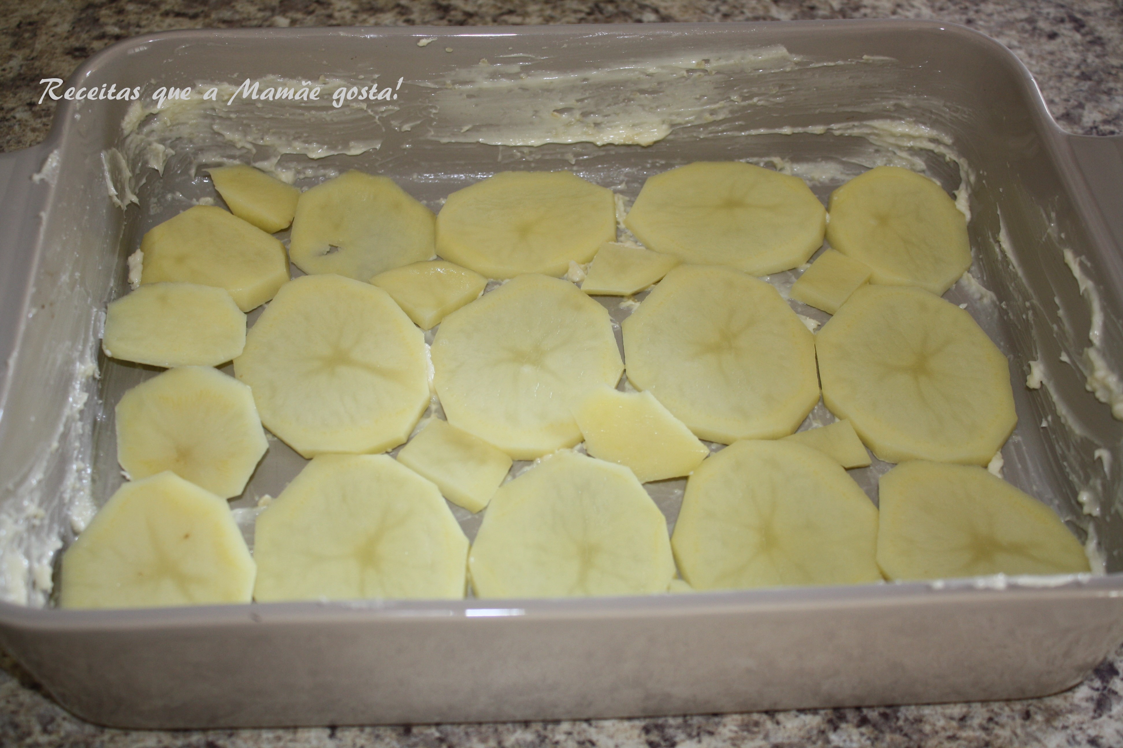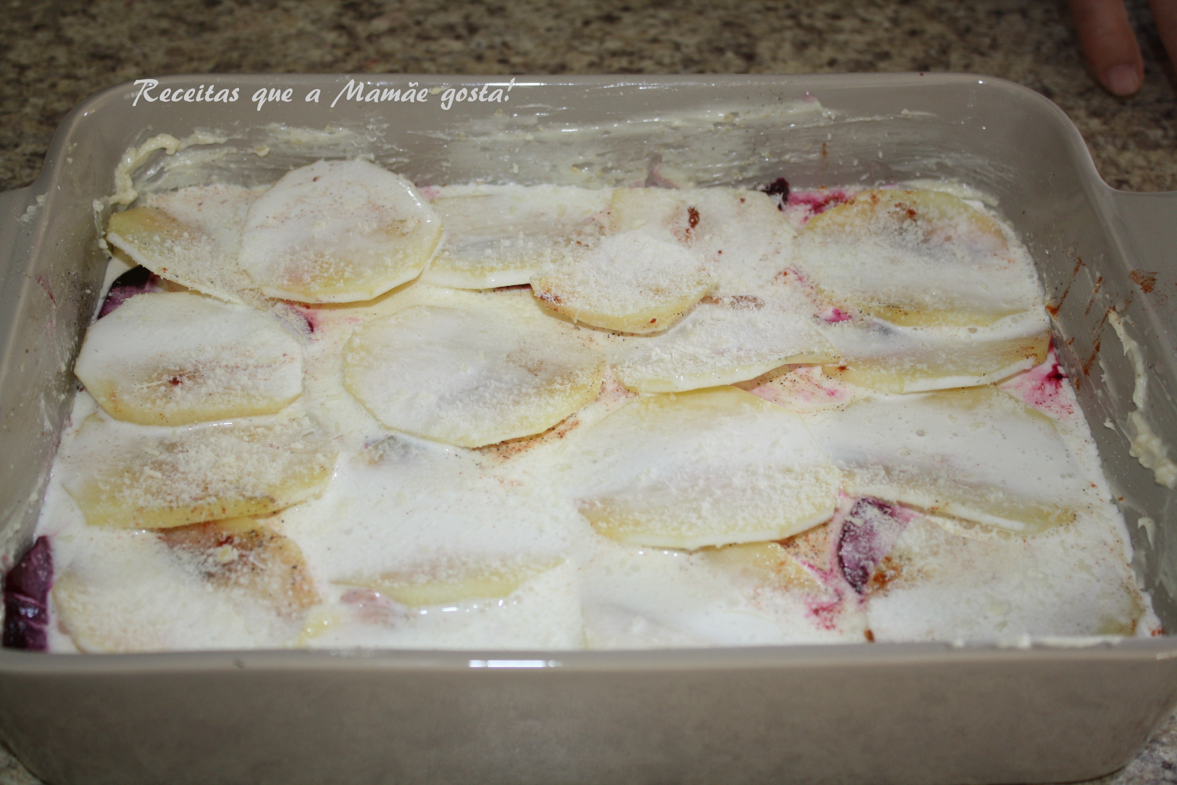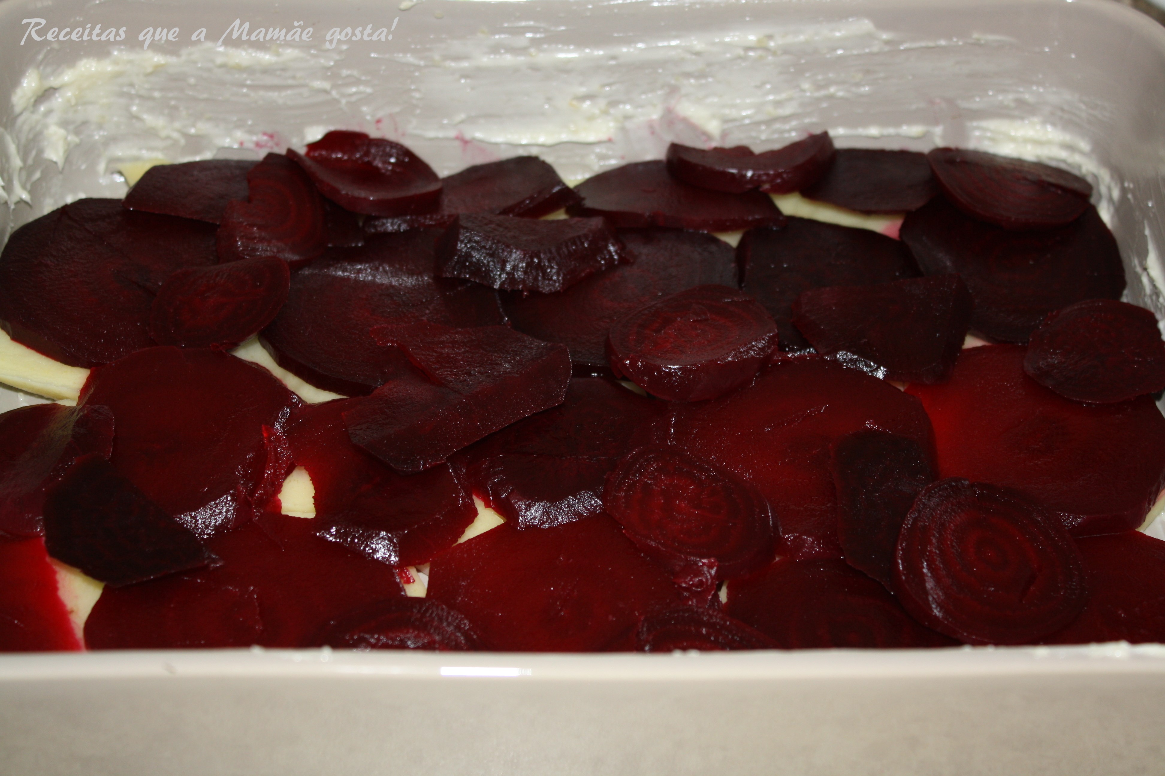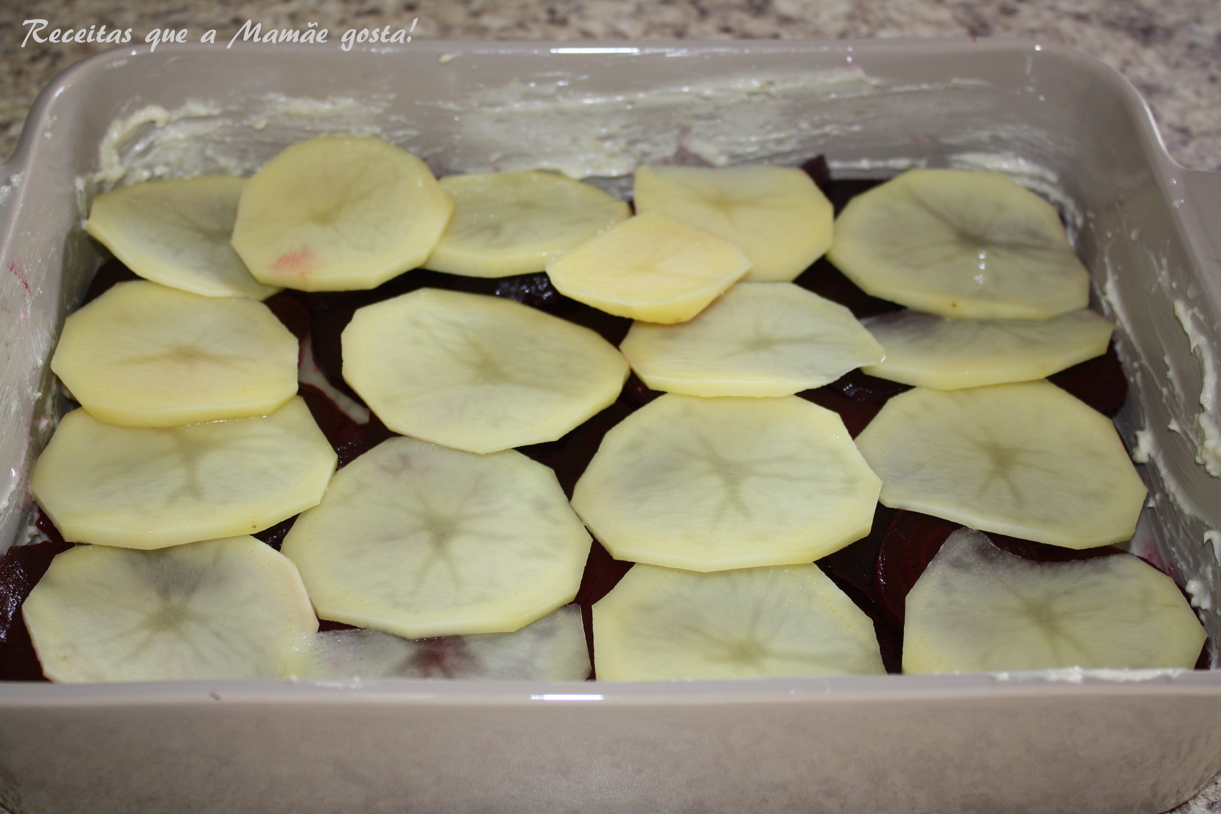 Coloque uma camada de batatas, uma camada de beterrabas e termine com outra camada de batatas.