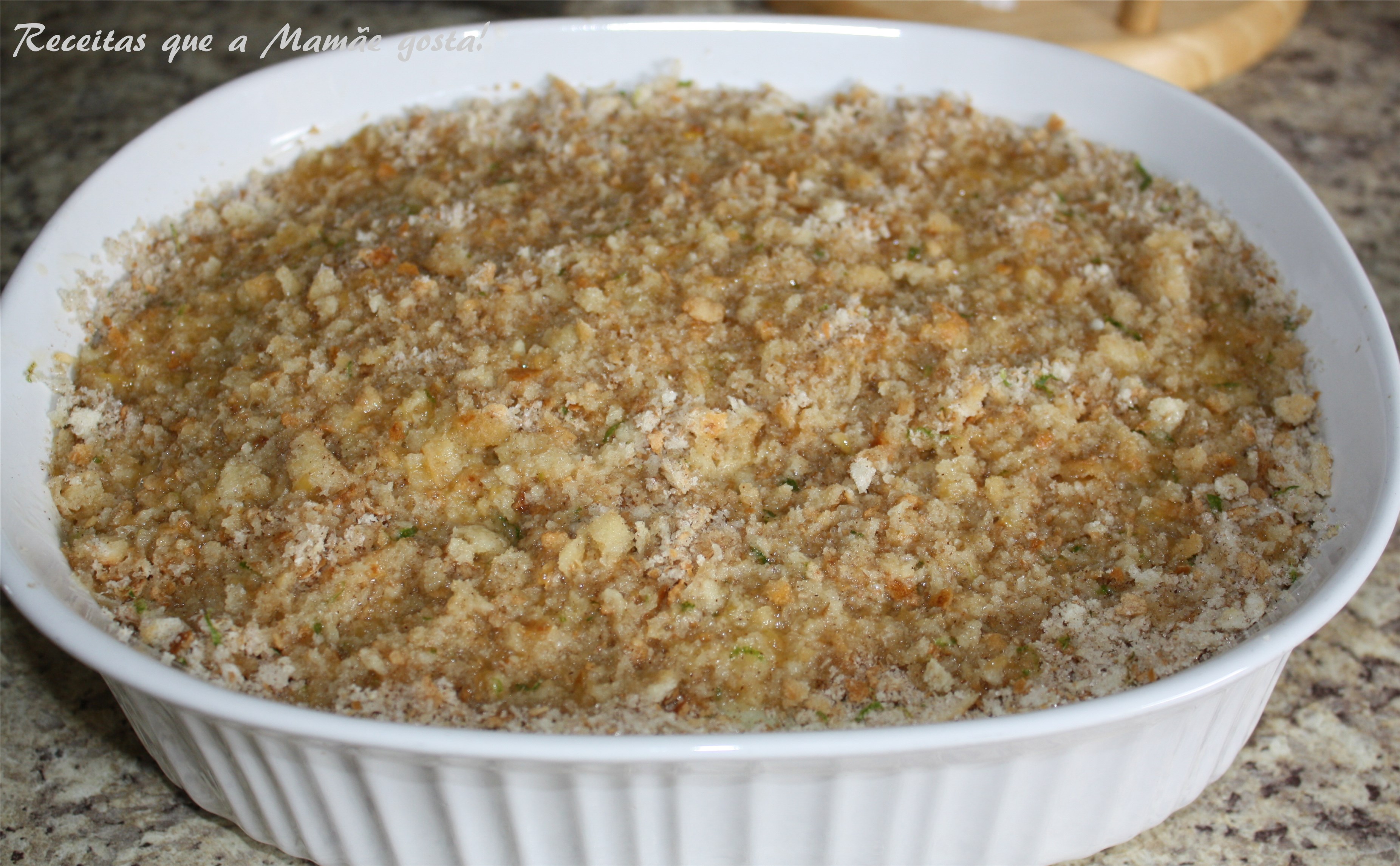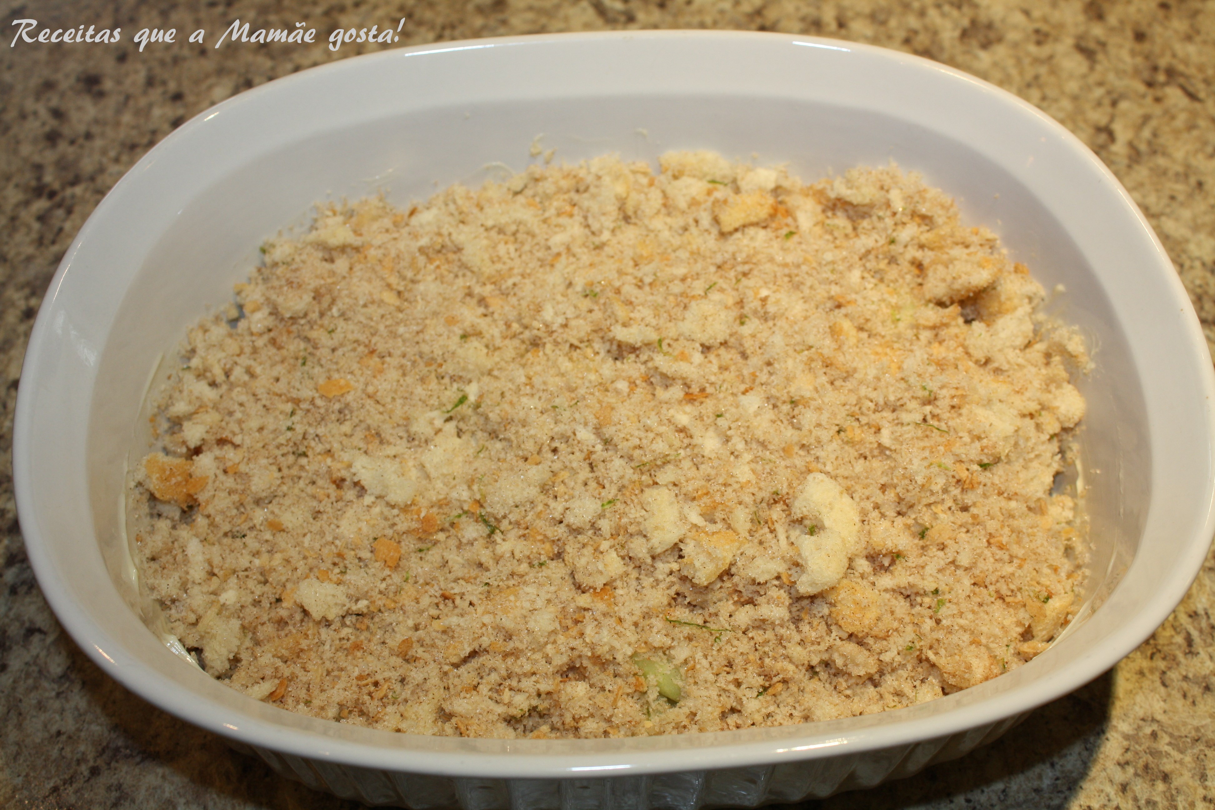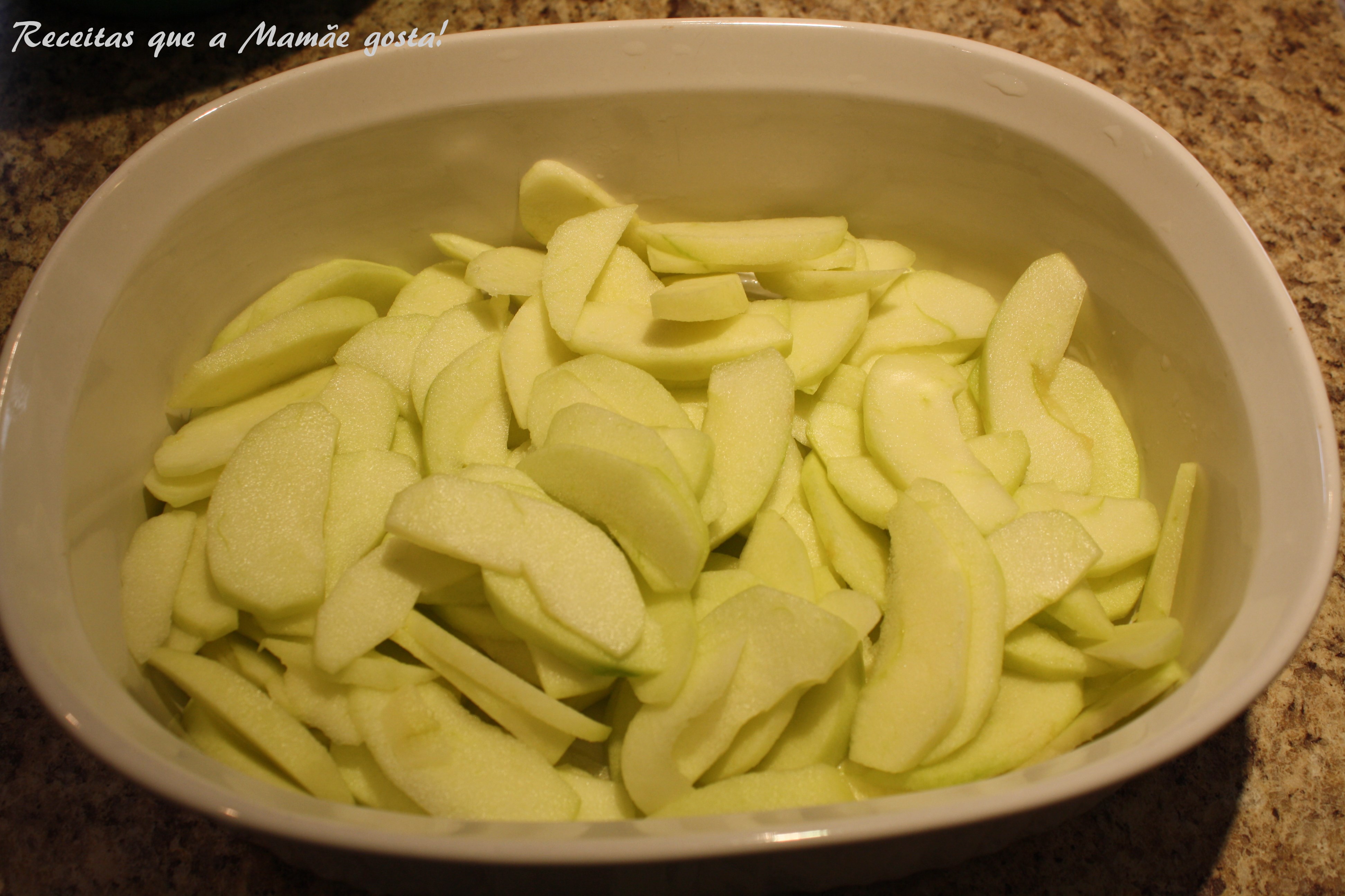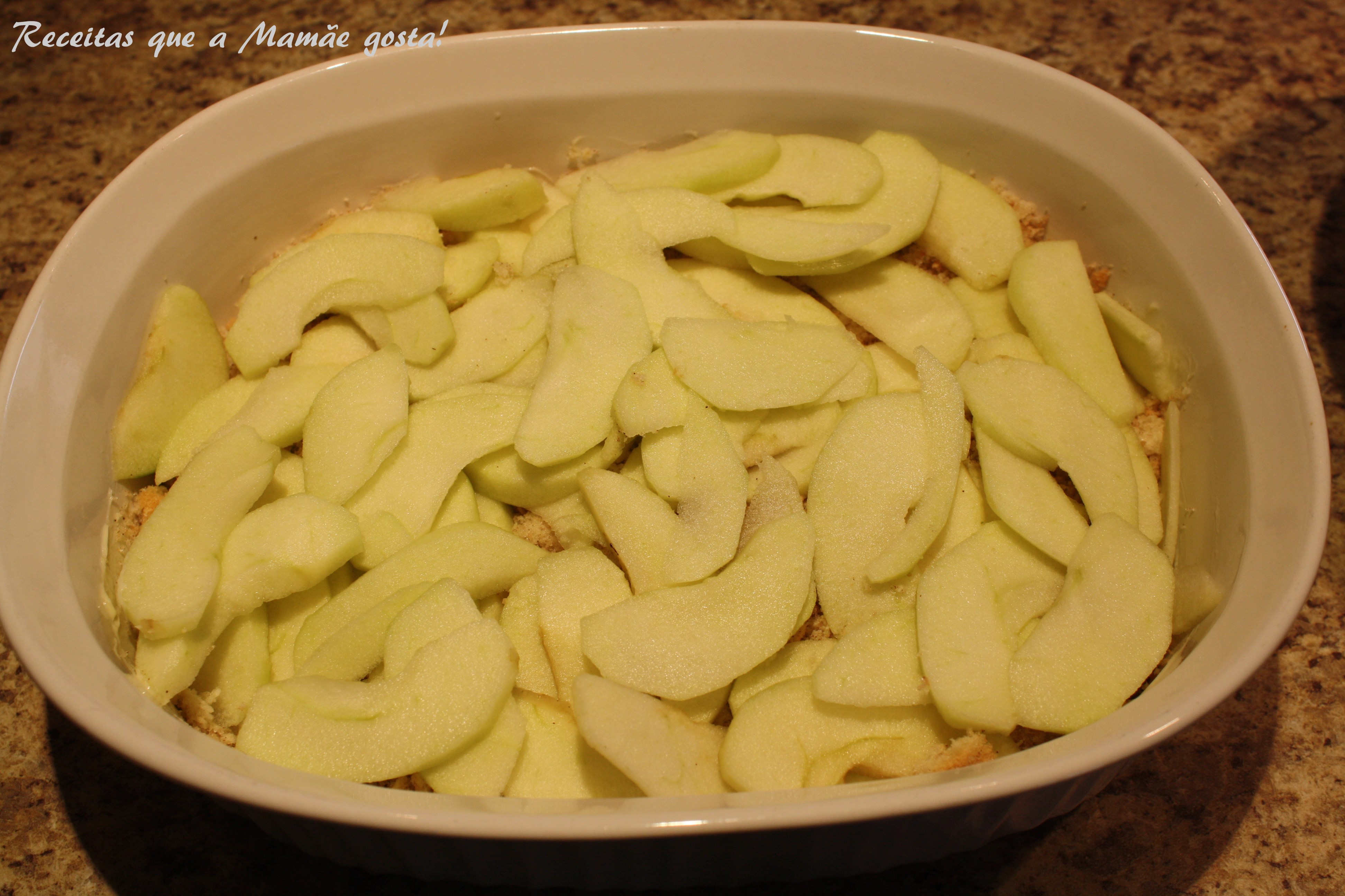 Num refratário untado com manteiga, colocar a metade da maça. Adidionar a metade da mistura do farelo de pão; colocar o restante da maça e por cima mais uma camada do farelo de pão.