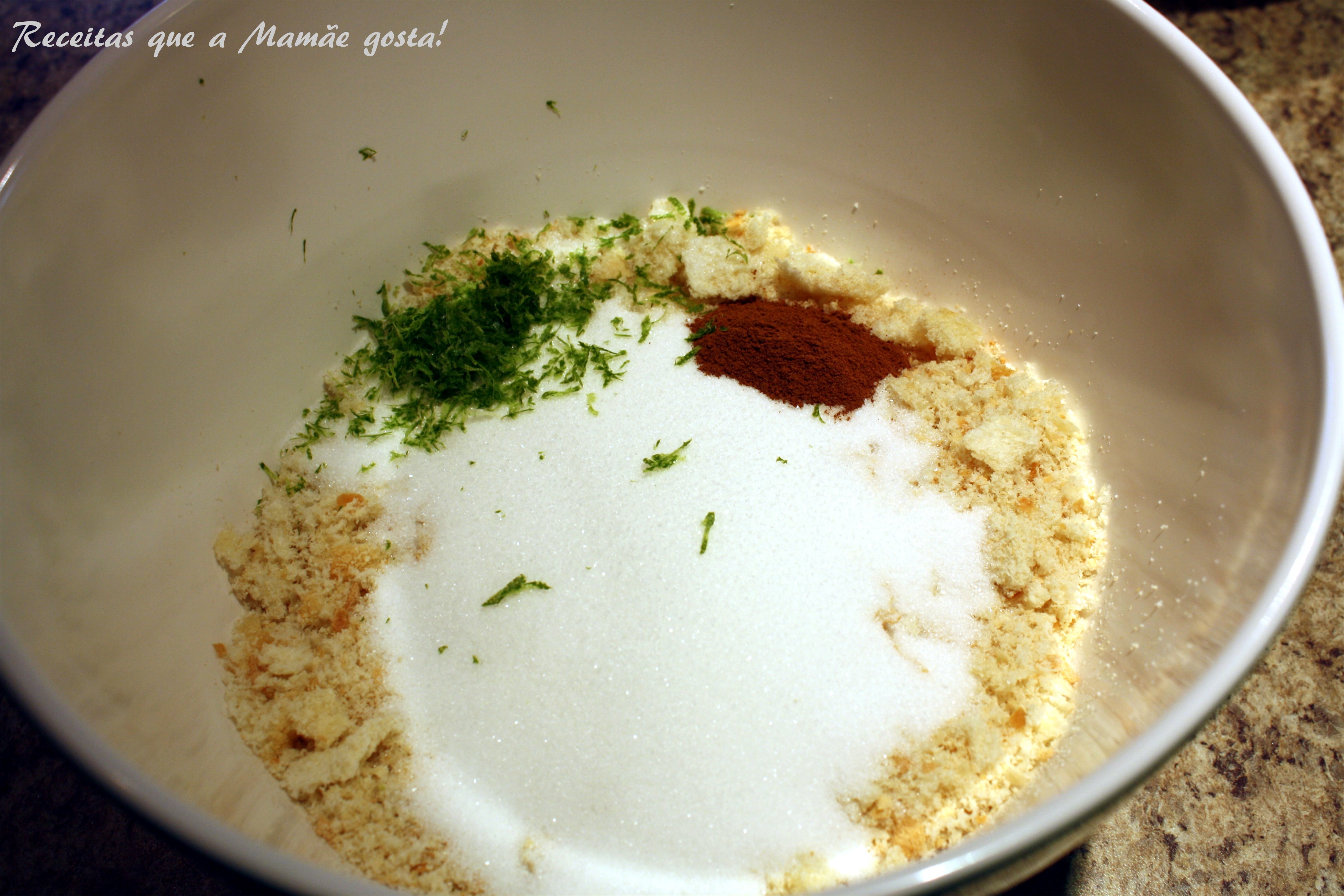Num recipiente, colocar o farelo de pão, açúcar, casca de limão e a canela em pó. Misture e reserve.
