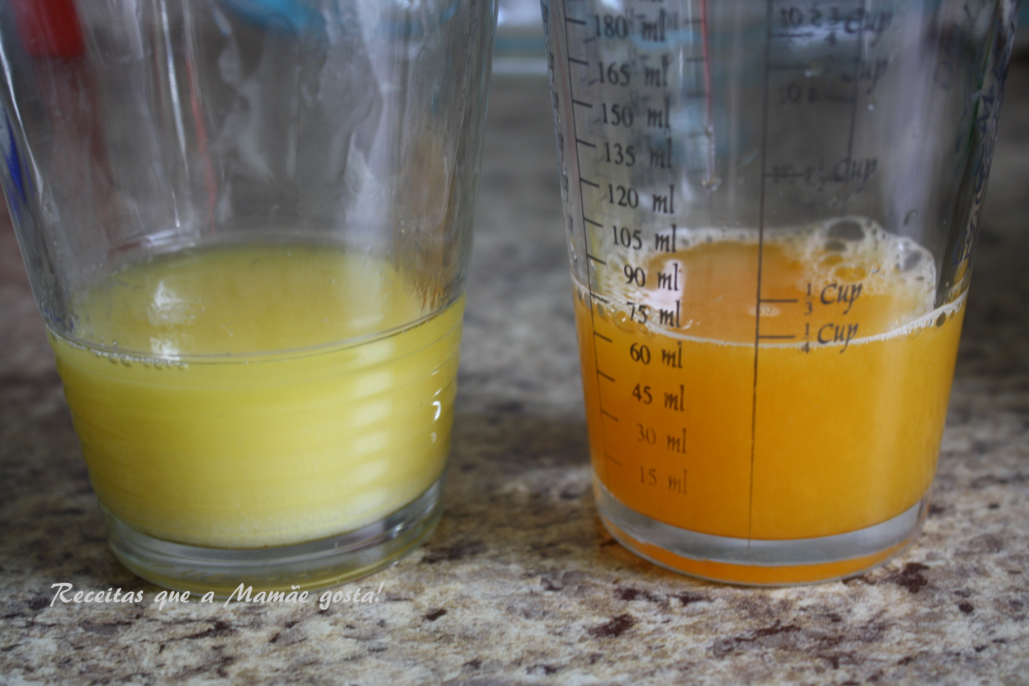 Misturar a manteiga com o suco de laranja e colocar aos poucos por cima do farelo, distribuindo por igual.