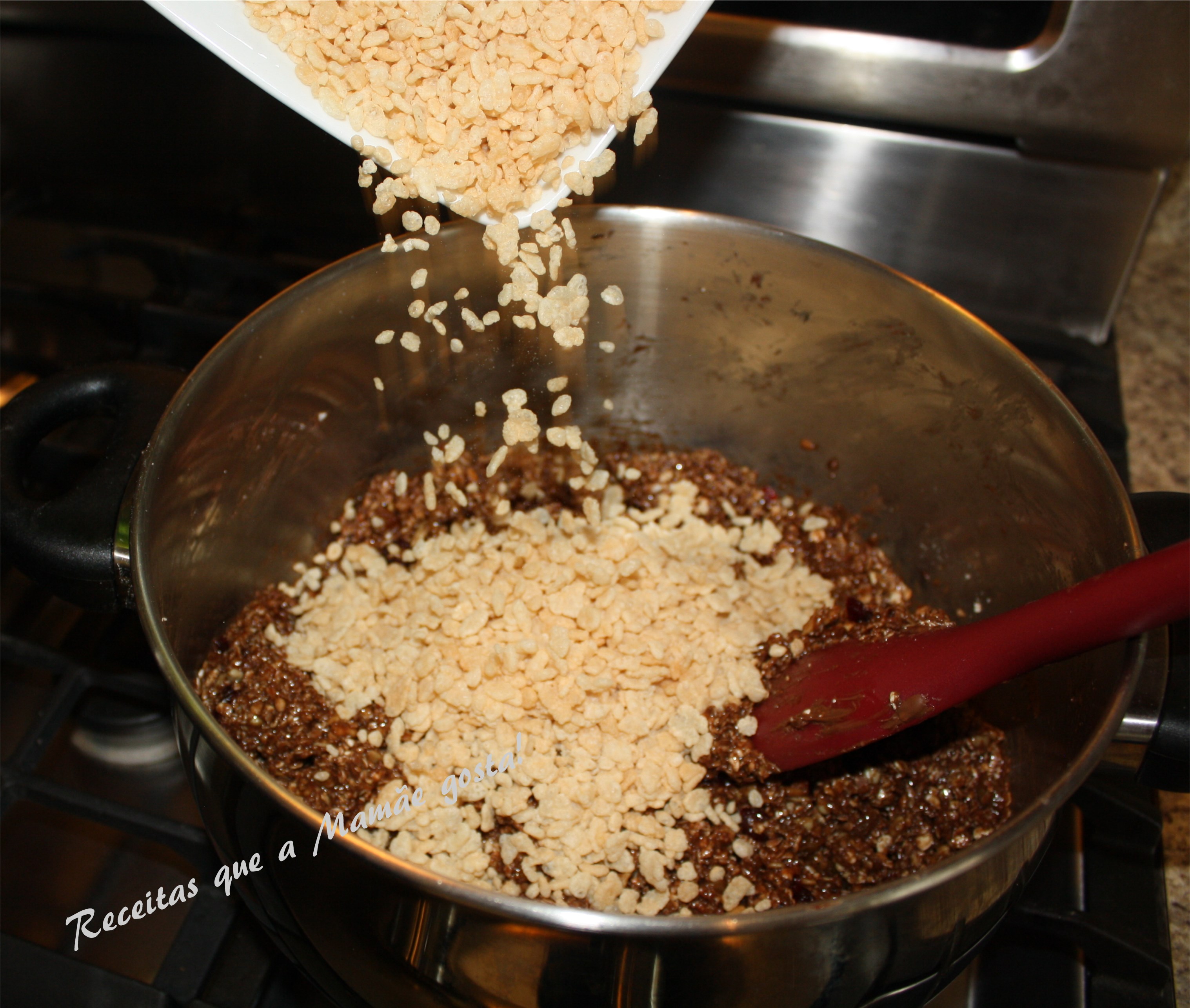 Retire do fogo, acrescente uma xícara de flocos de arroz e misture bem.