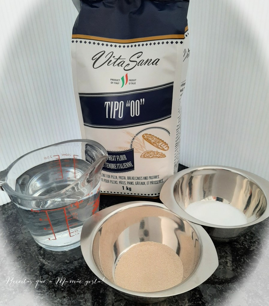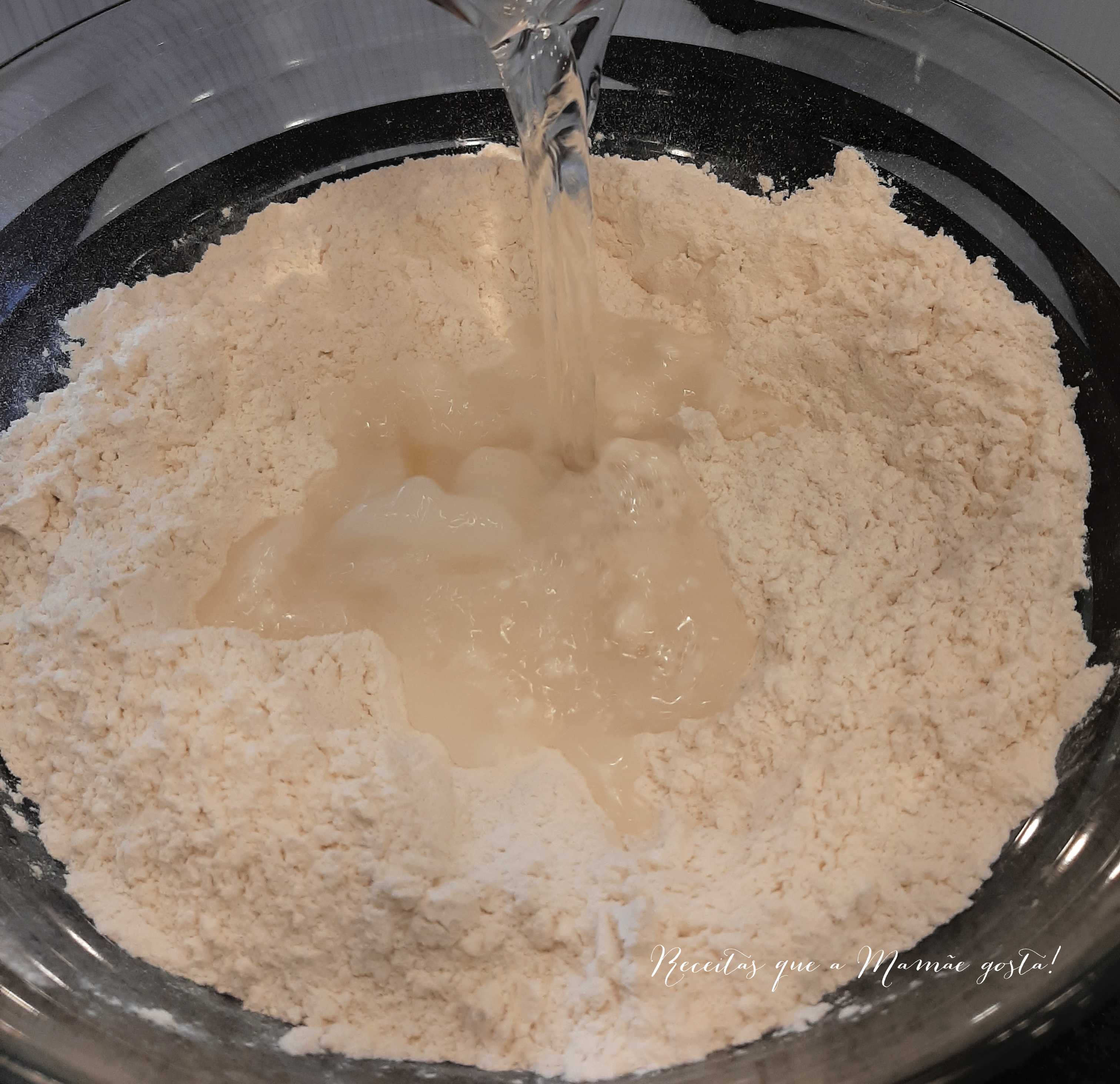 Numa tijela, coloque a farinha, o sal e o fermento; misture bem. Adicione a água