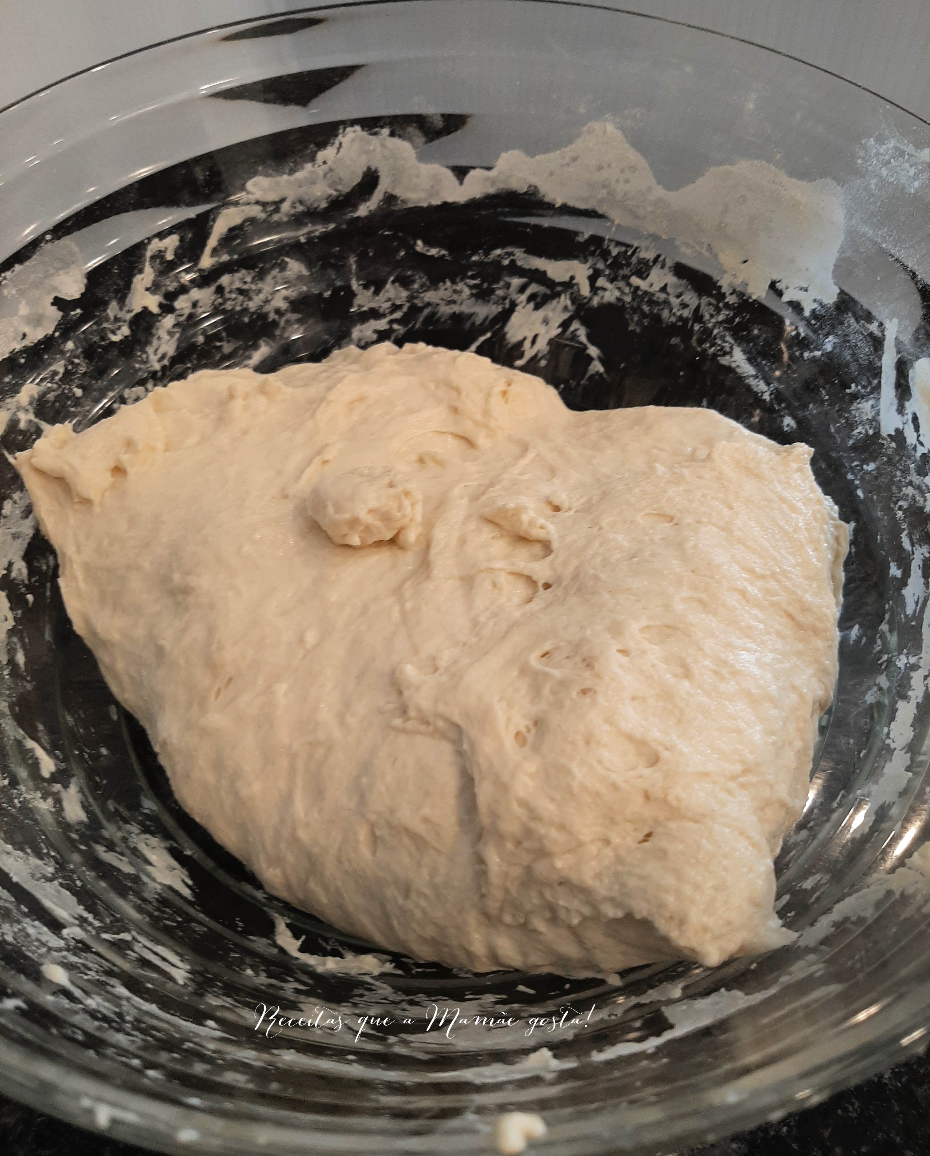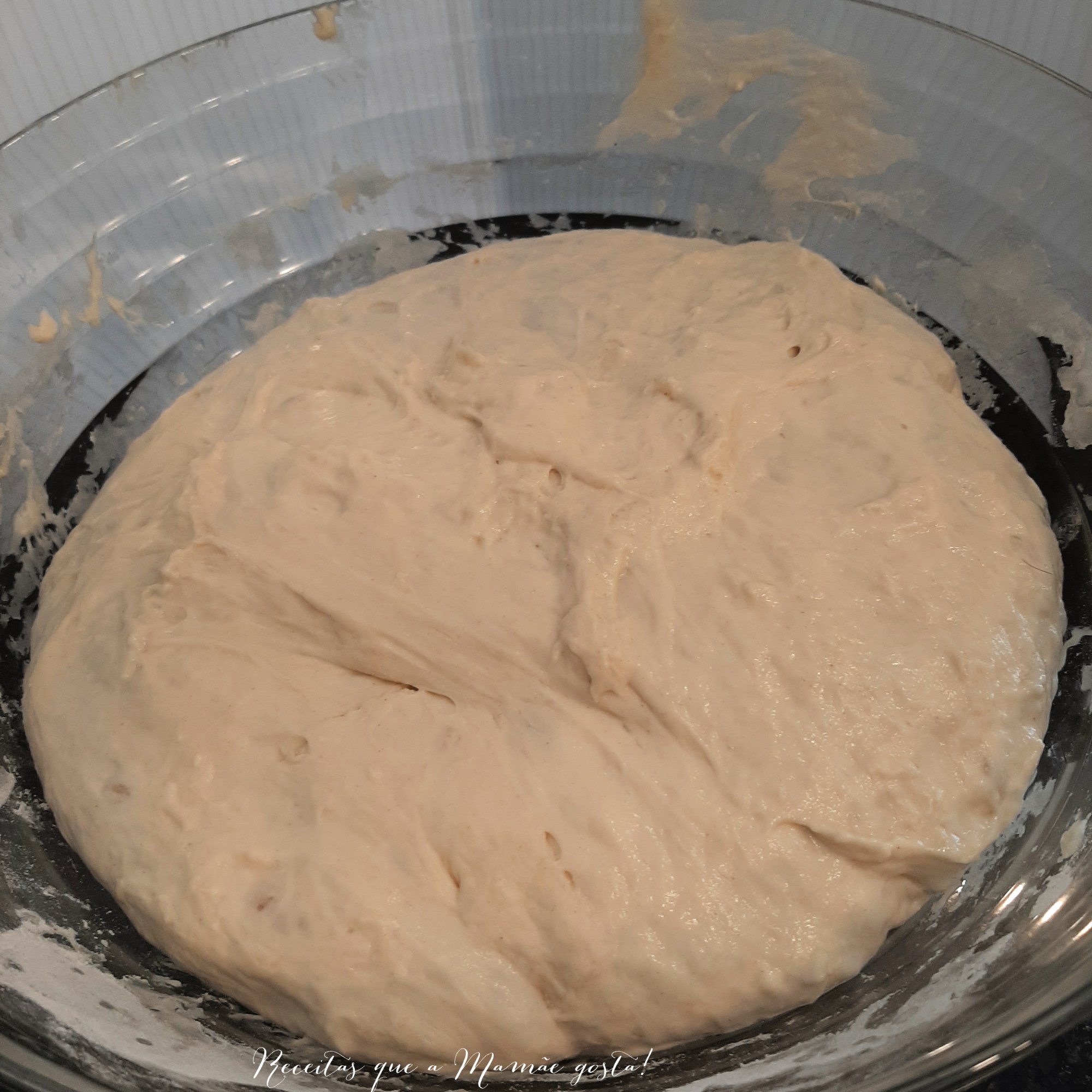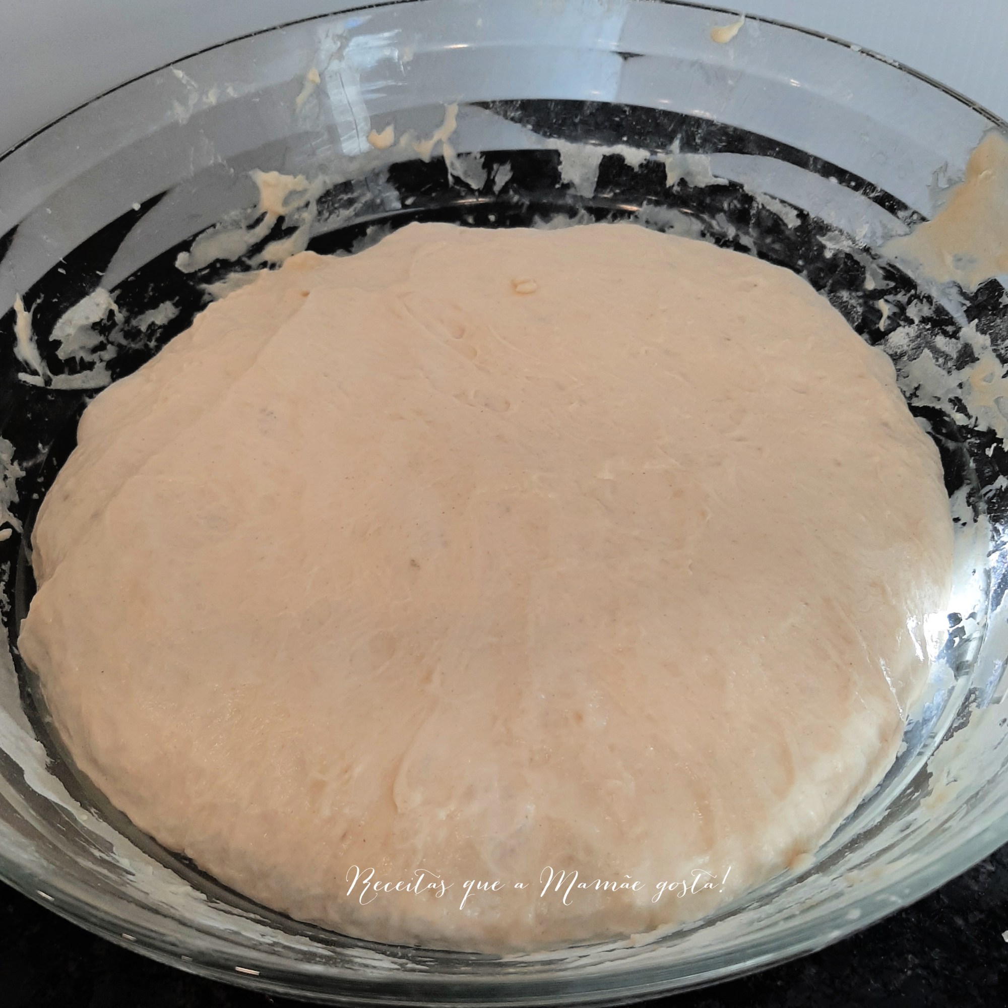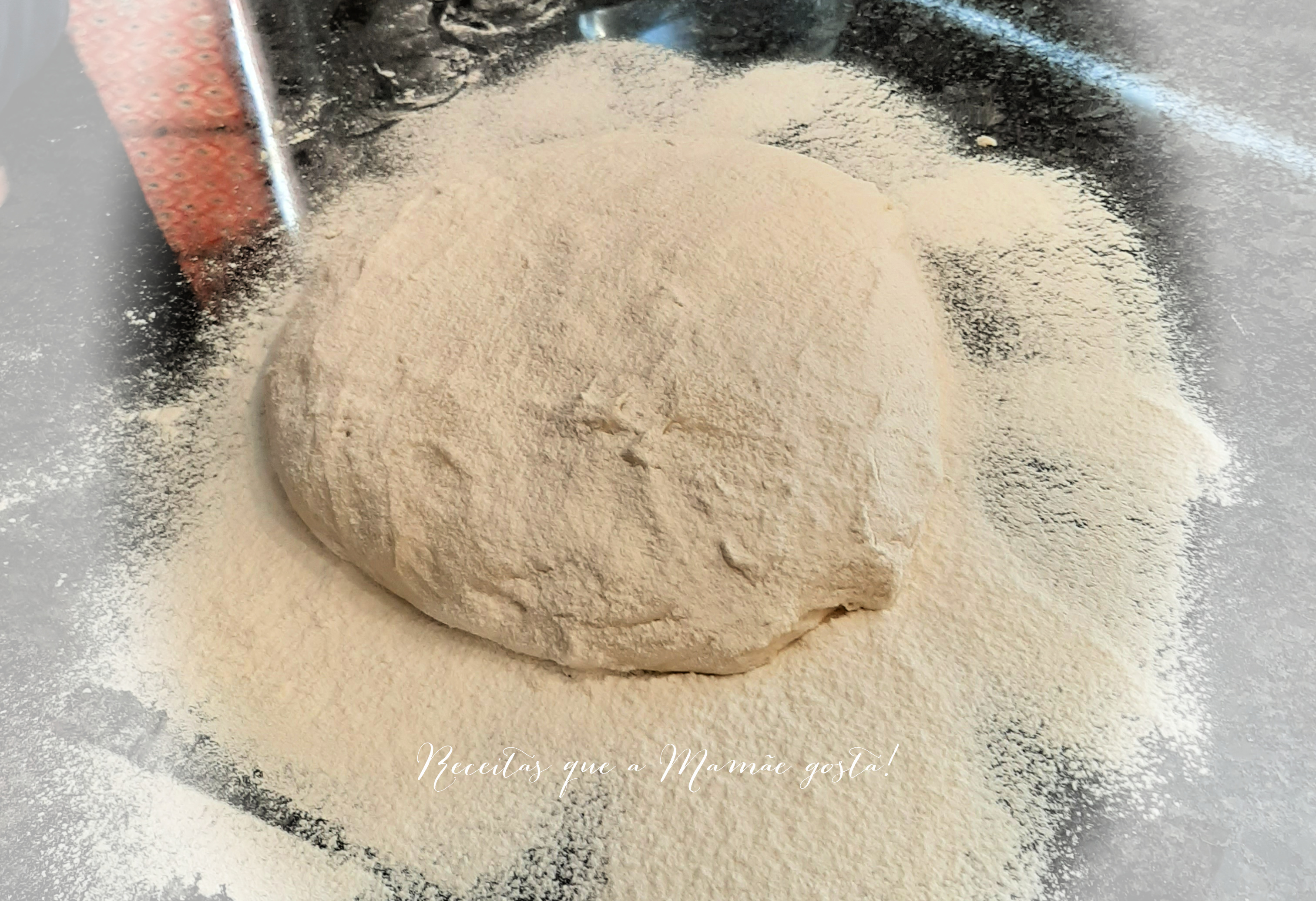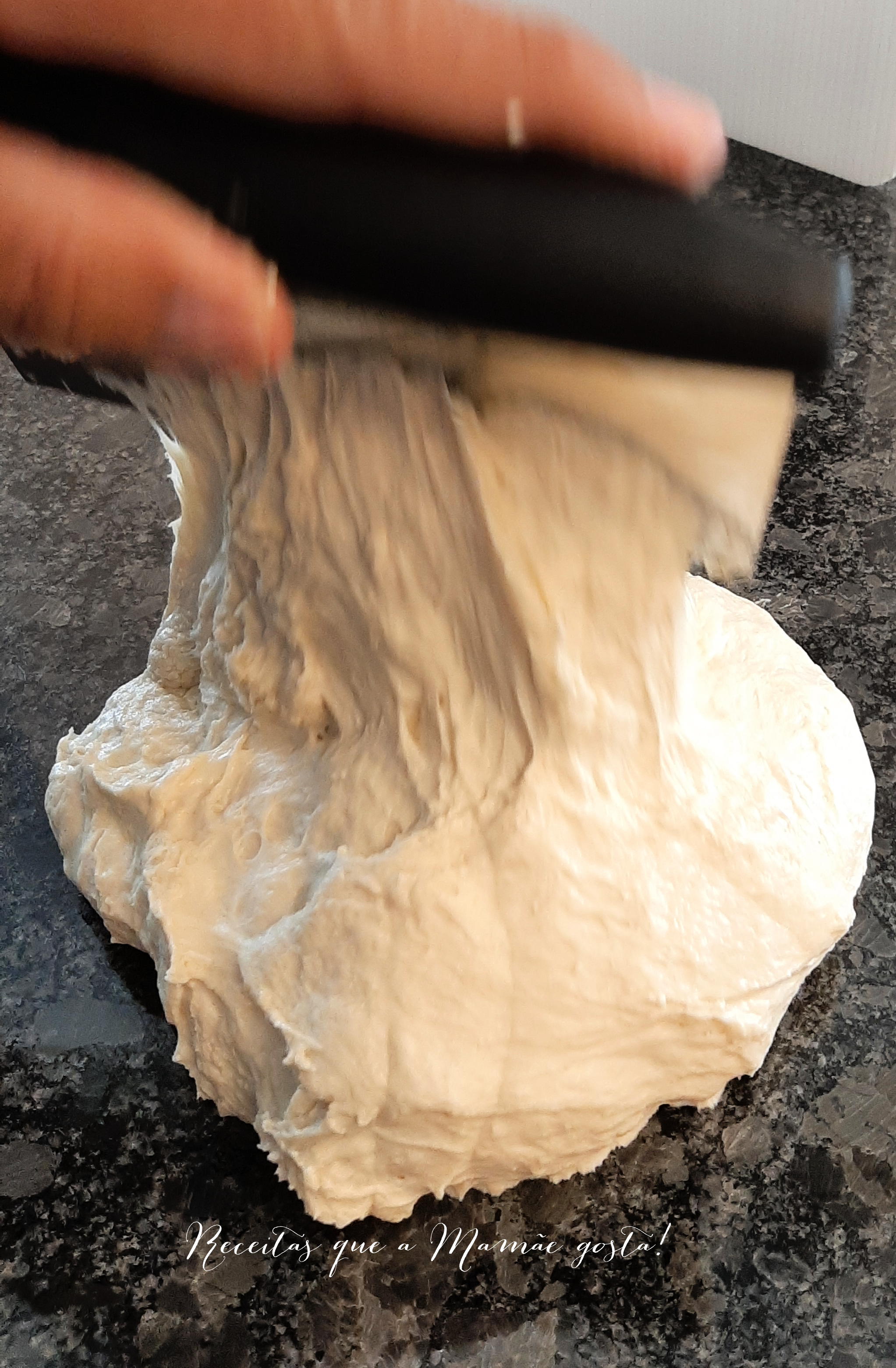 Após esse período, transfira a massa da tijela para uma superfície lisa e com o auxílio de uma espátula, vire a massa, dobrando de fora para dentro, em toda sua volta e coloque-a novamente na tijela