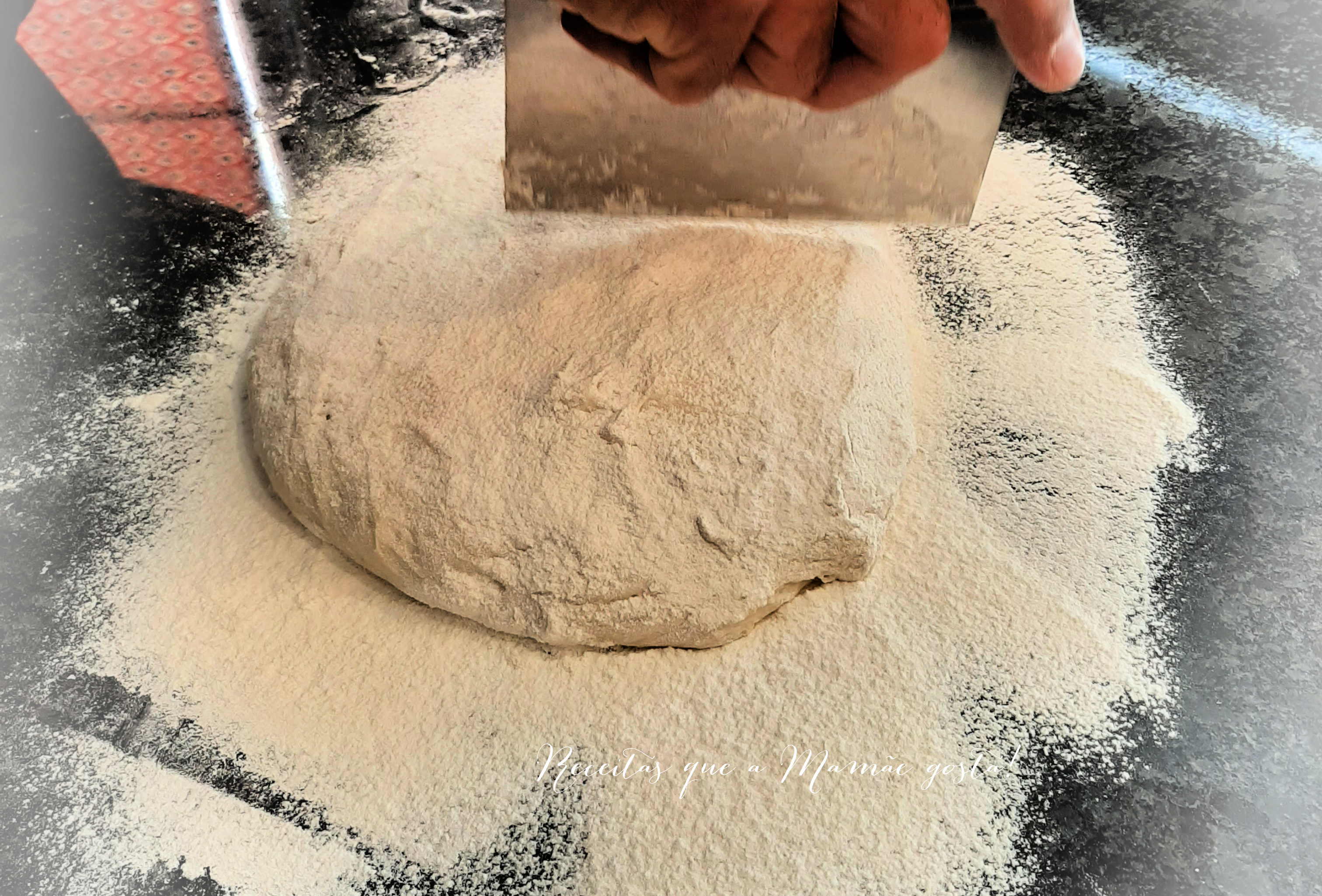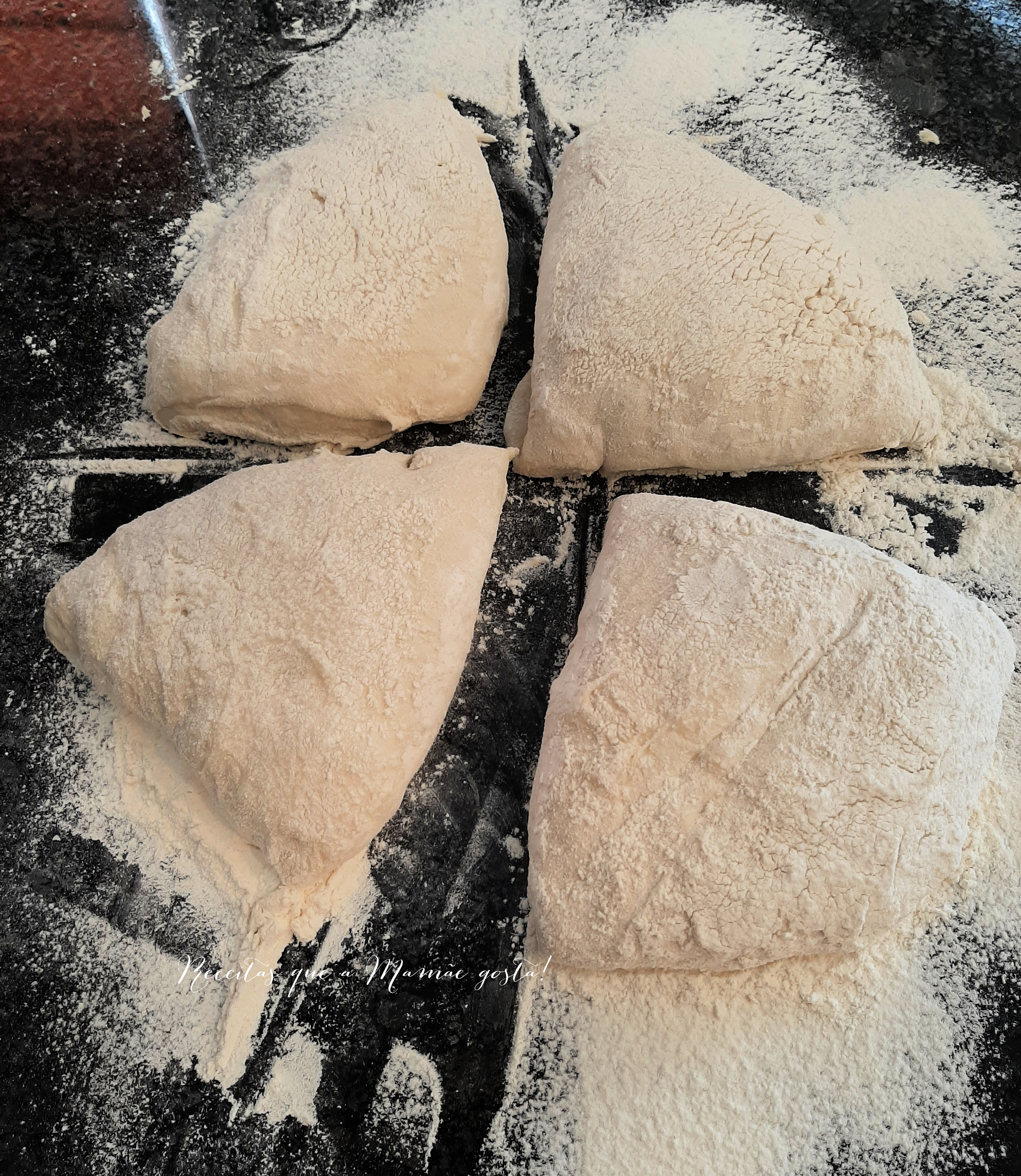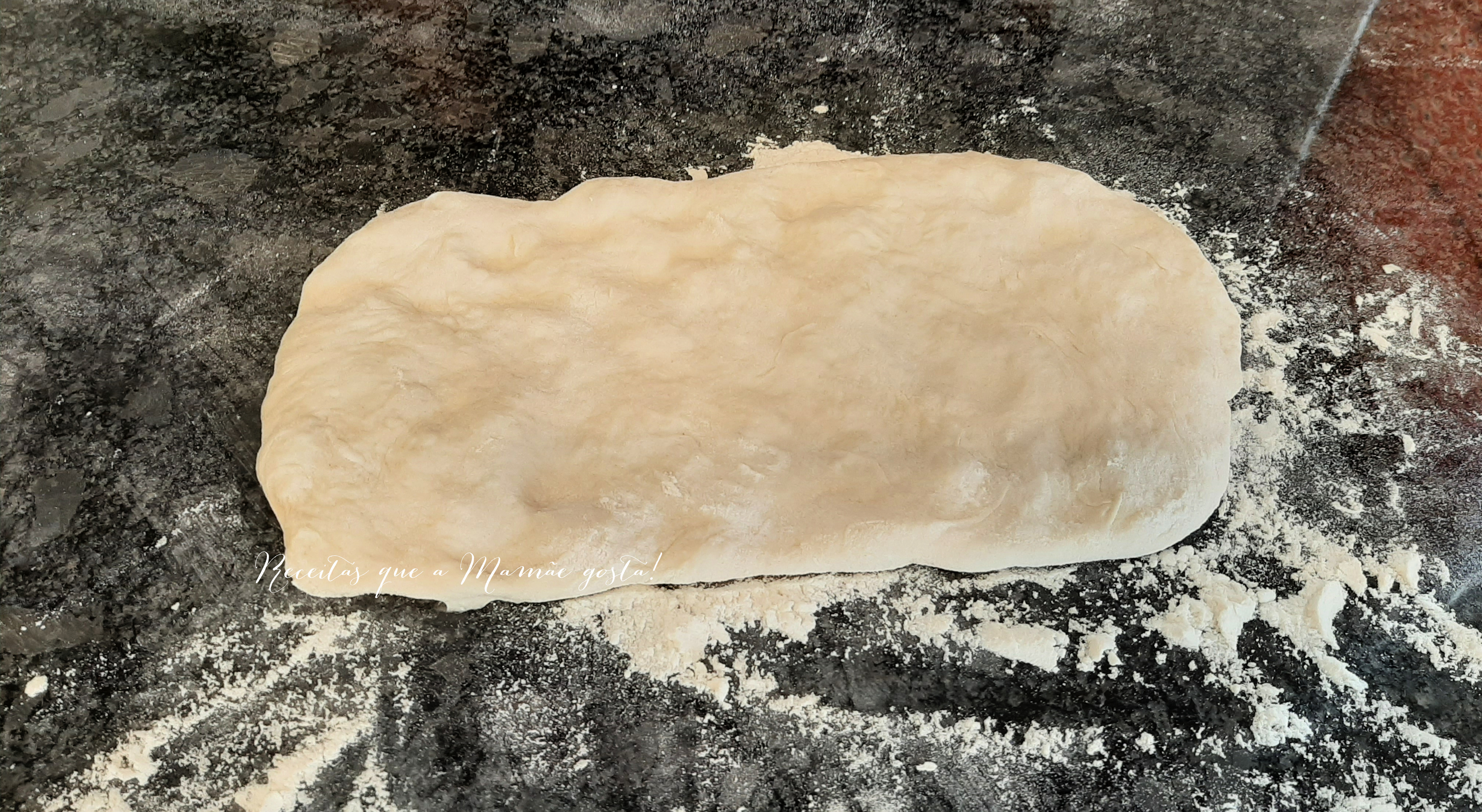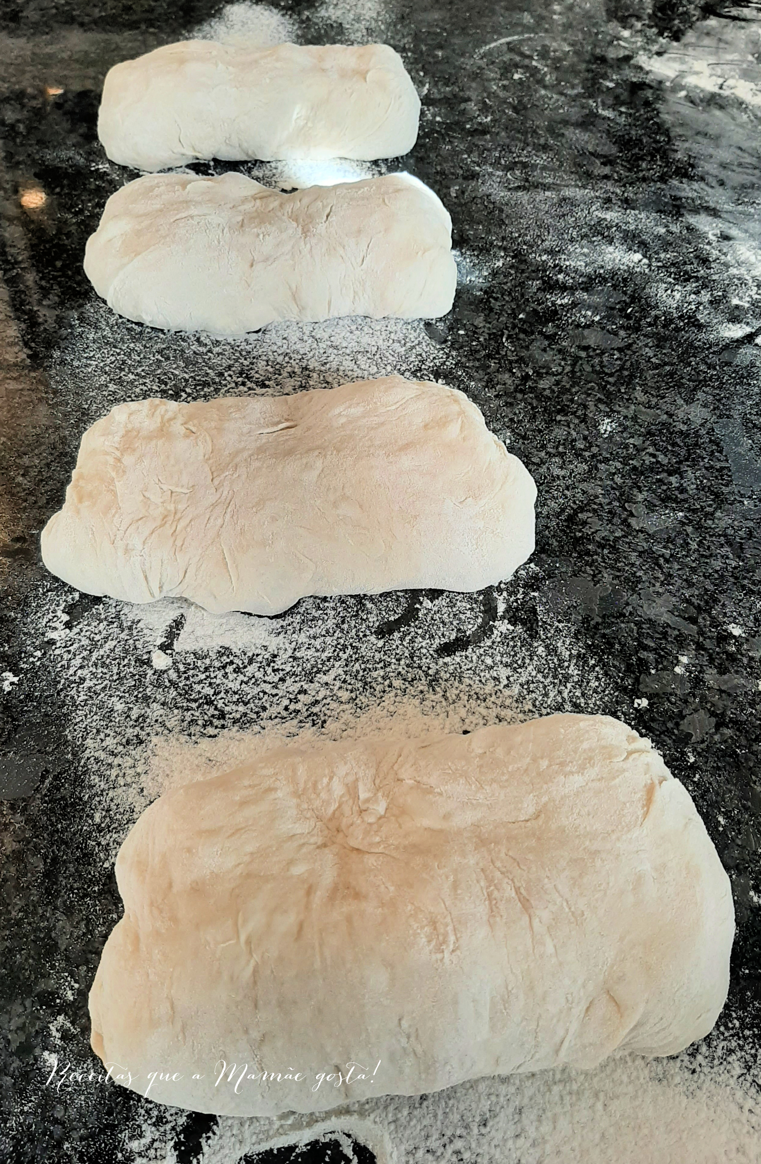 Após o último processo de crescimento, transfira a massa para uma superfície enfarinhada e a divida em 4 partes iguais. Dê uma pré-modelada nas massas deixando-as descansar por 15 minutos