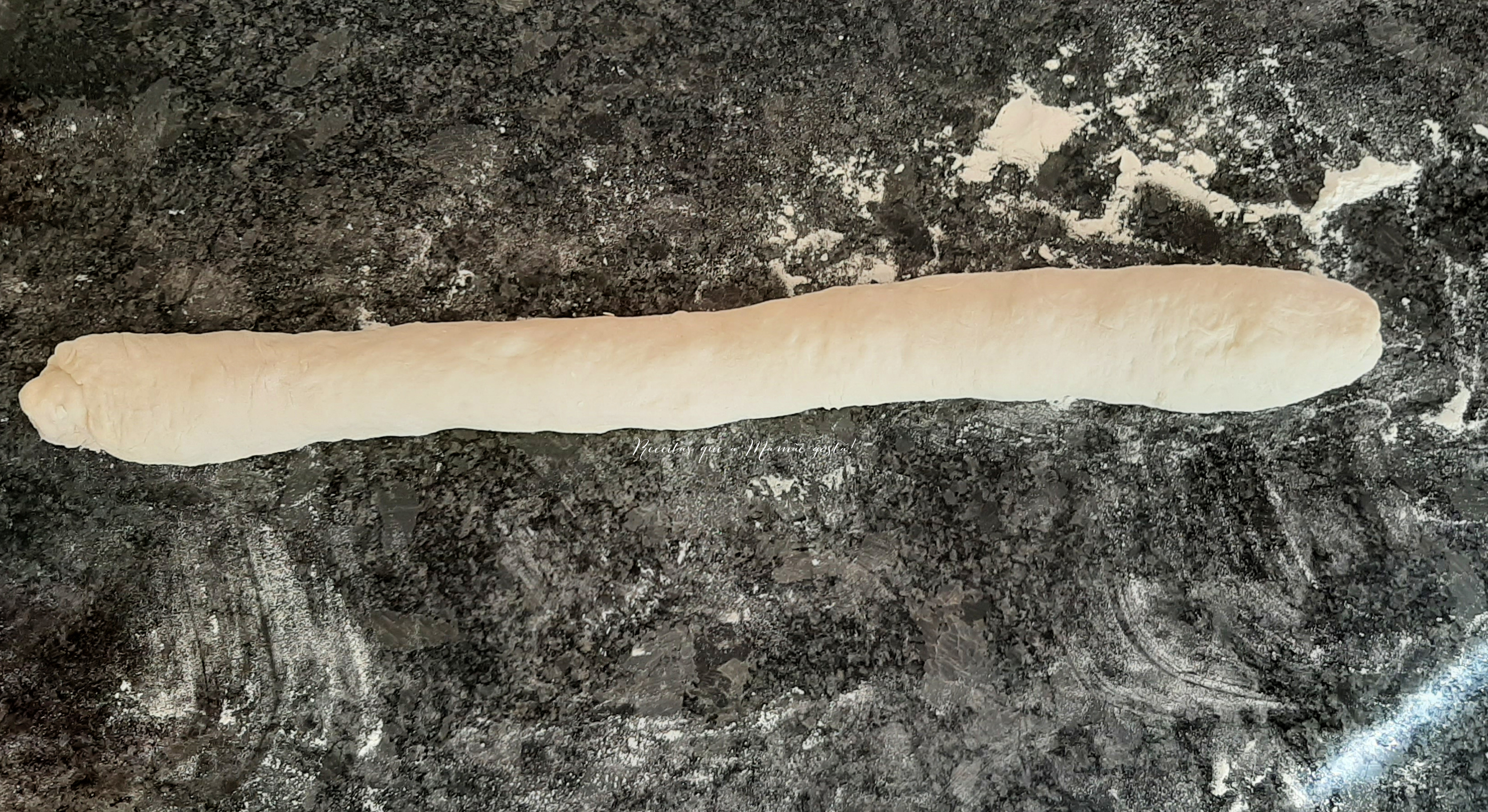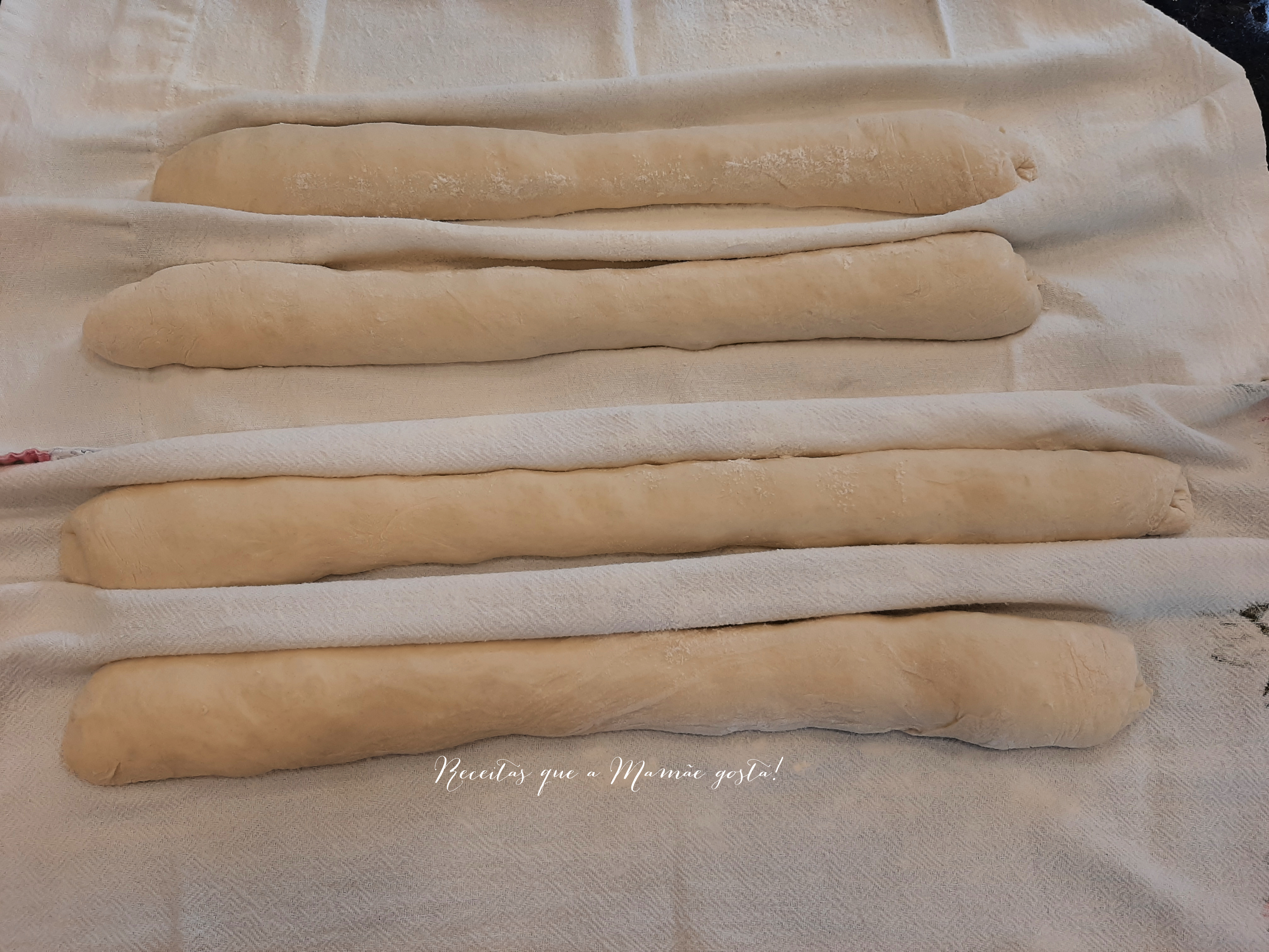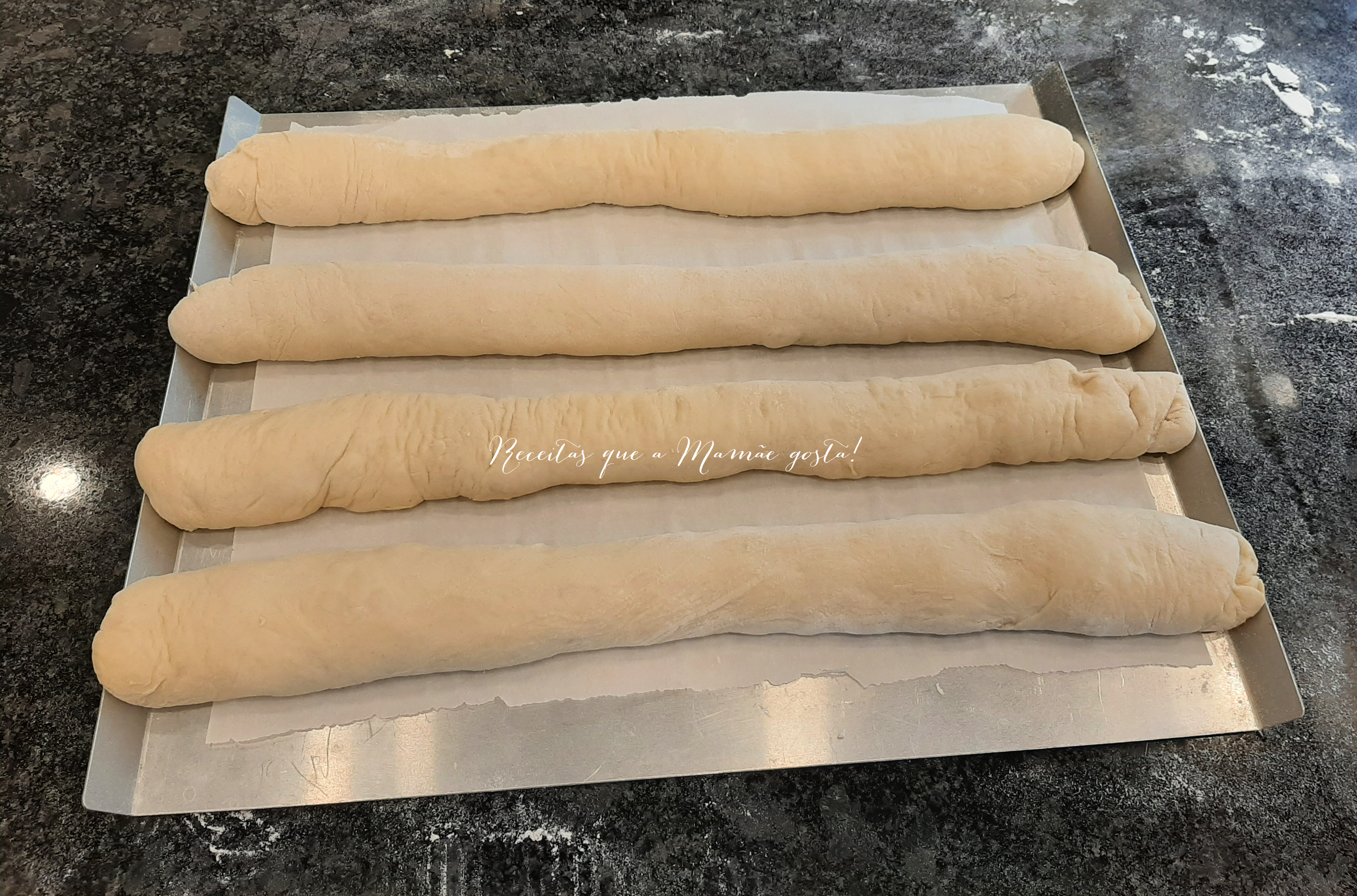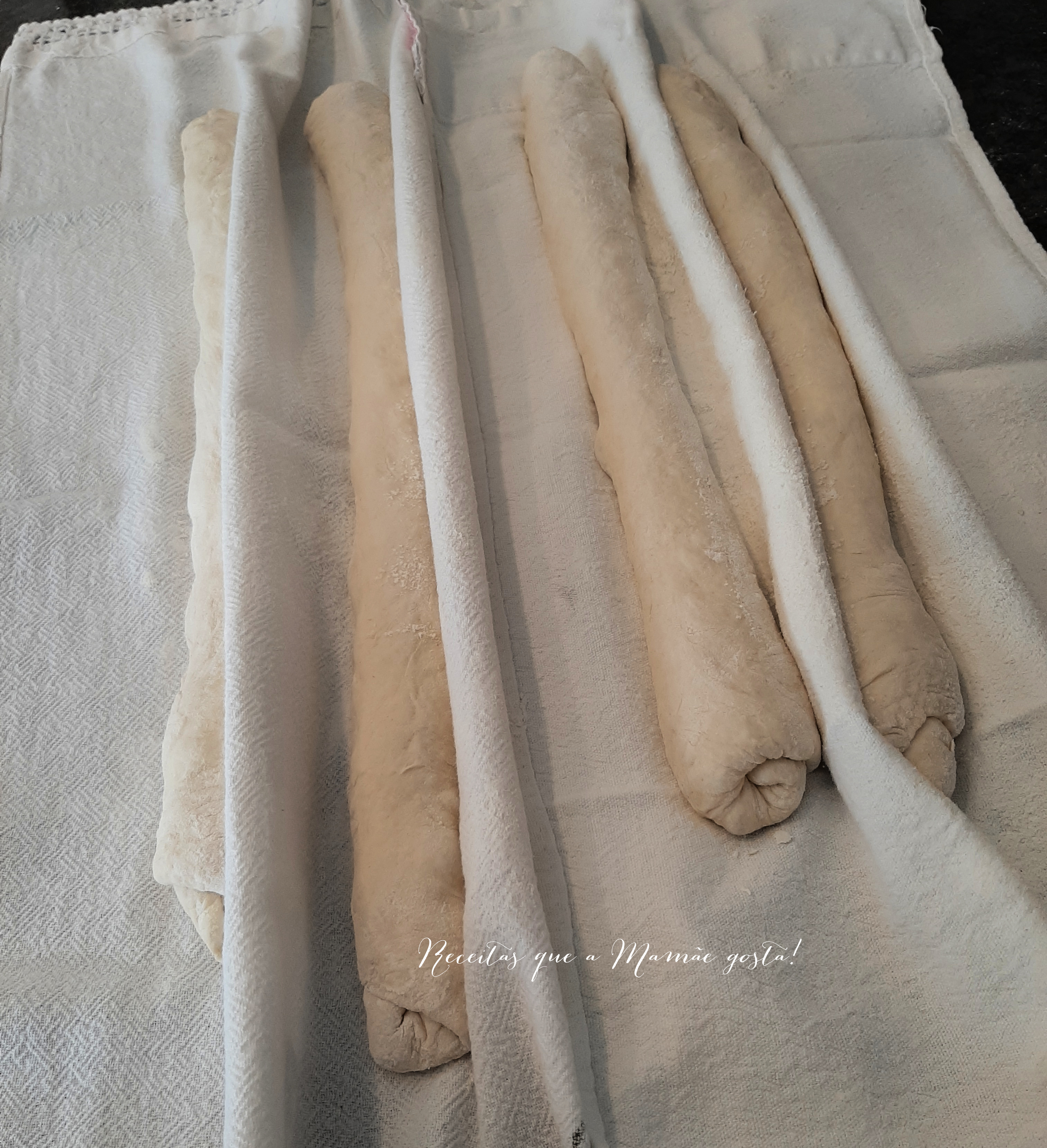 Após passados os 15 minutos, abra as massas e as enrole dando o formato do baguete para cada pedaço. Coloque-os sobre um pano enfarinhado, cubra e deixe descansar por mais 20 minutos.