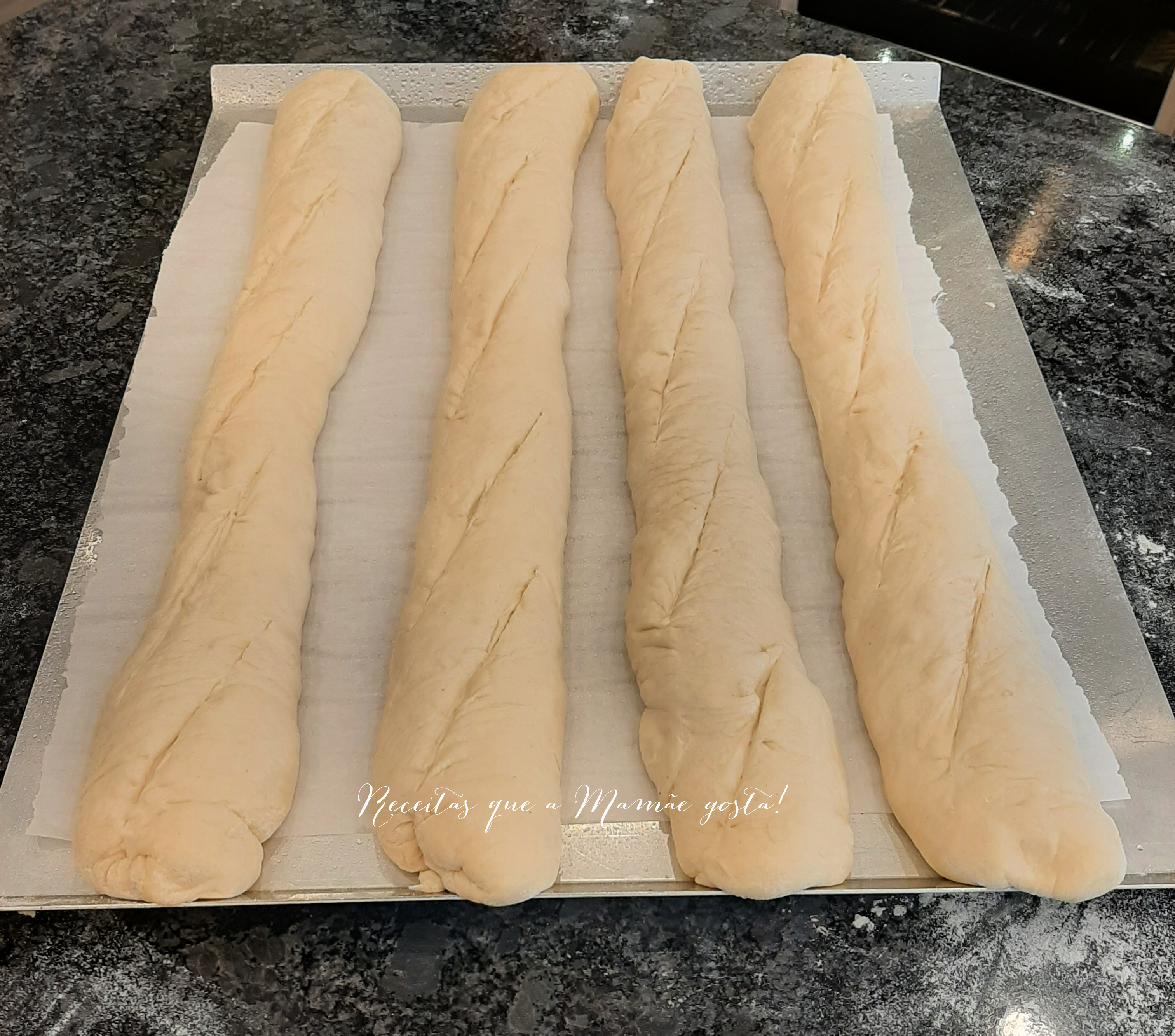 Após os 20 minutos, transfira os baguetes para uma assadeira untada com óleo ou papel manteiga (com o mínimo possível de manuseio). Cubra e deixe descansar por mais 10-12 minutos. Ligue o forno.