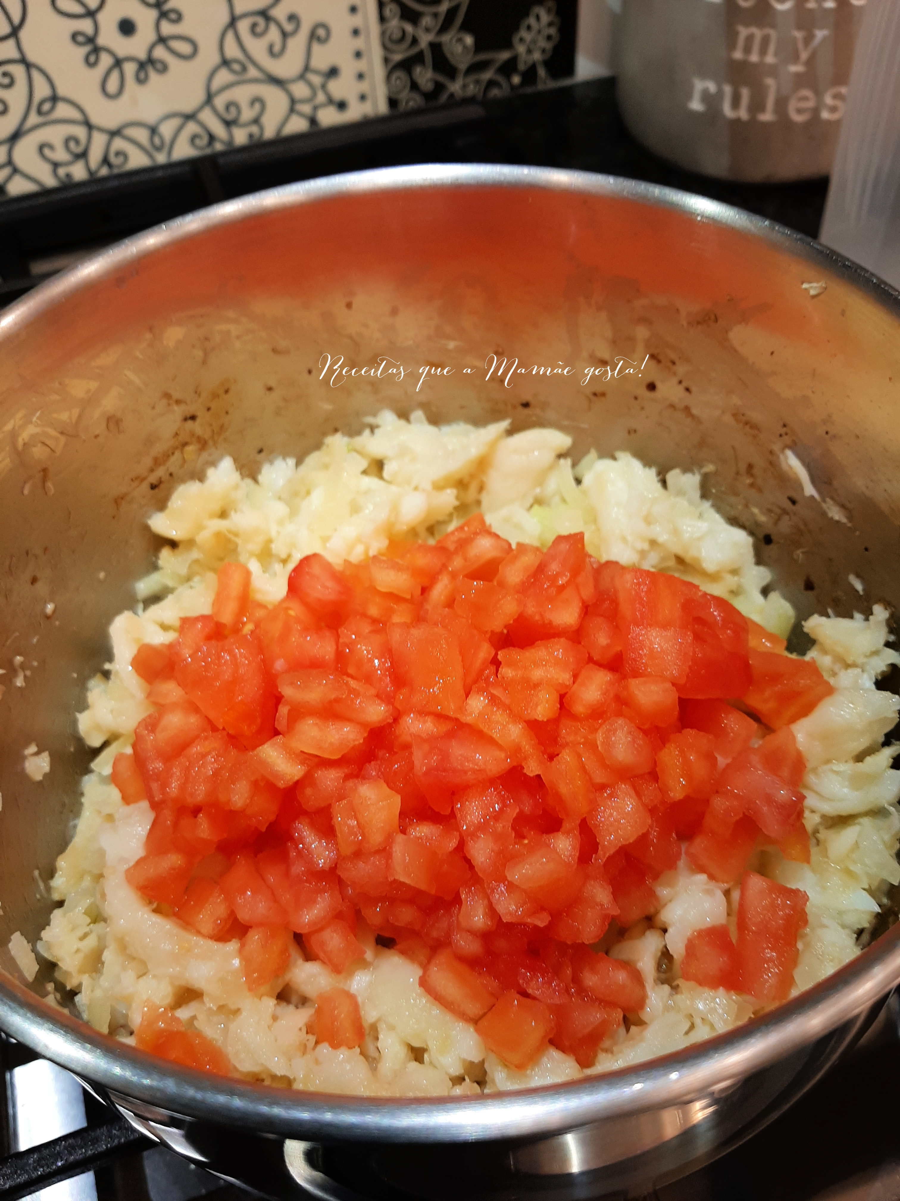 Adicione o tomate, o sal, a pimenta, o louro e cubra com um pouco de água. Tampe a panela e quando o refogado estiver consistente apague o fogo e reserve.