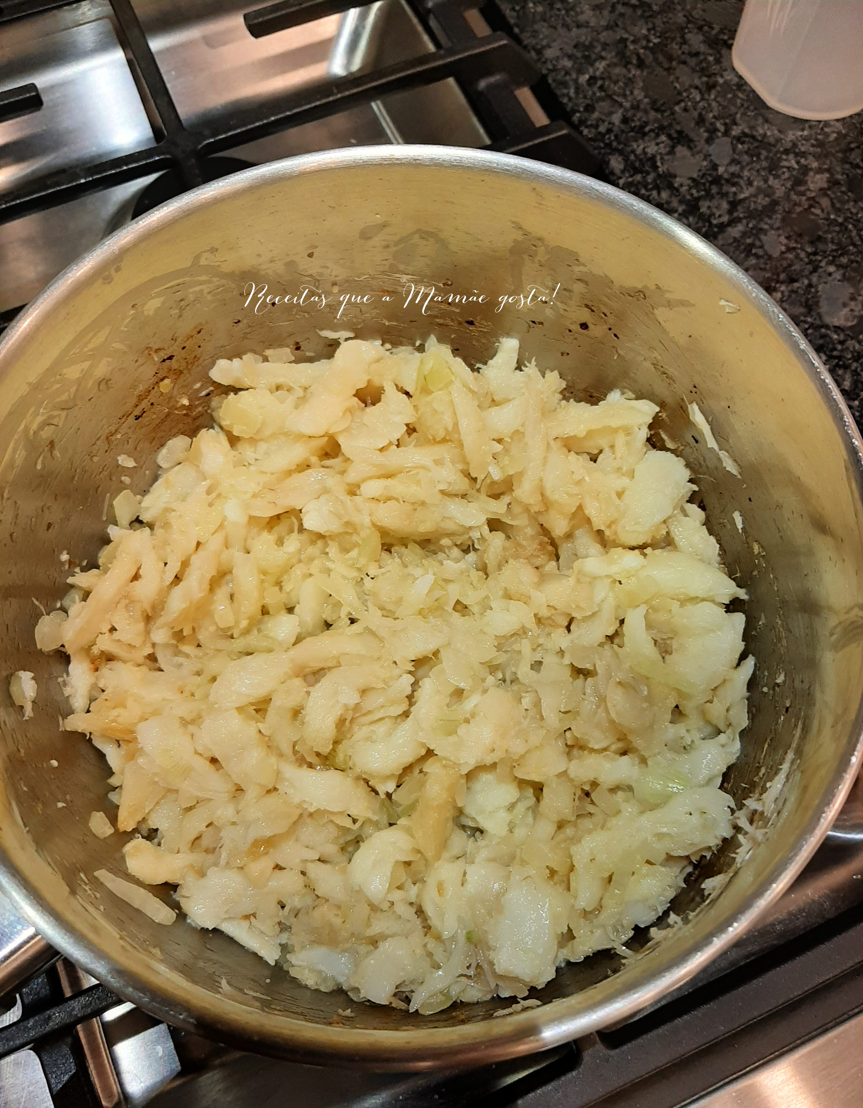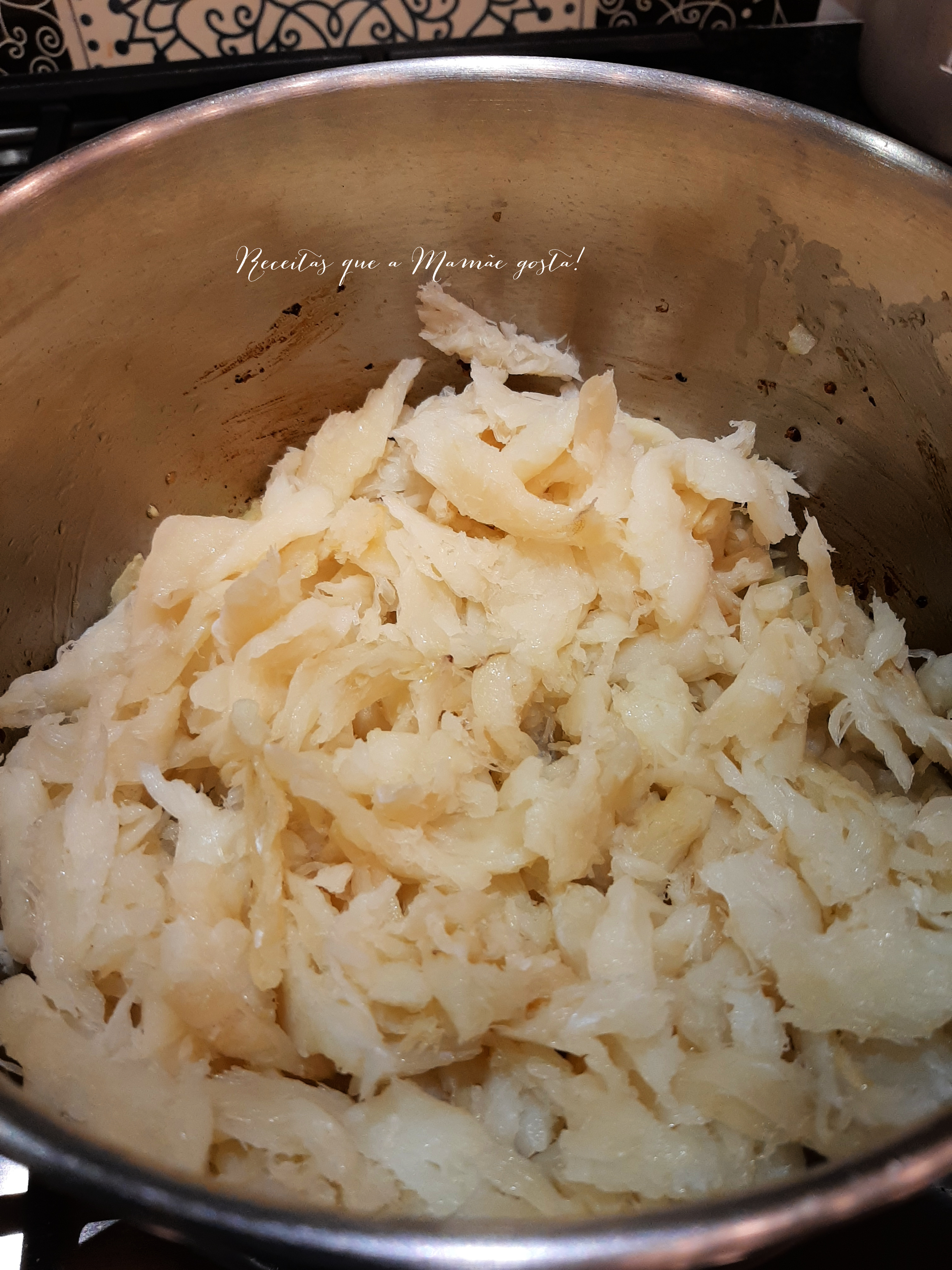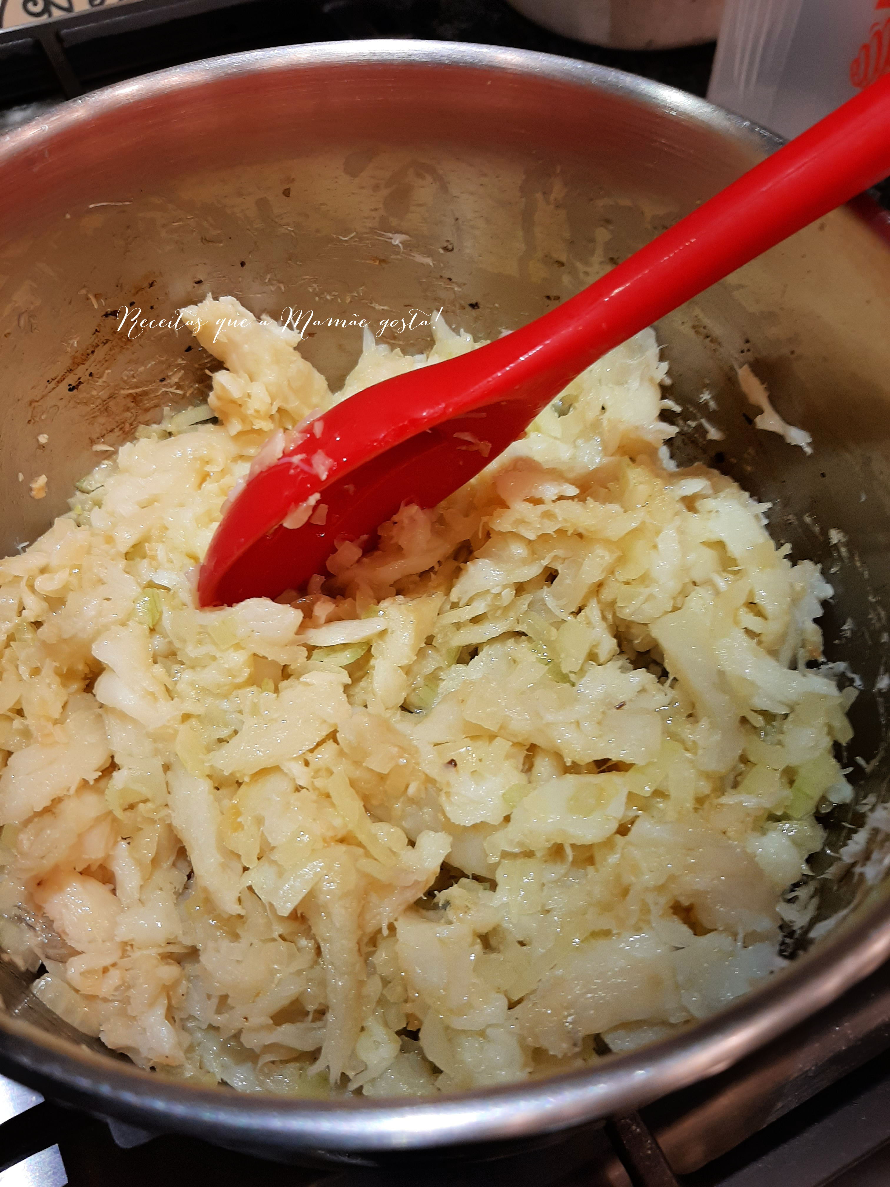 Numa panela em fogo médio, coloque um pouco de óleo e doure a cebola e o alho. Adicione o bacalhau e mexa….