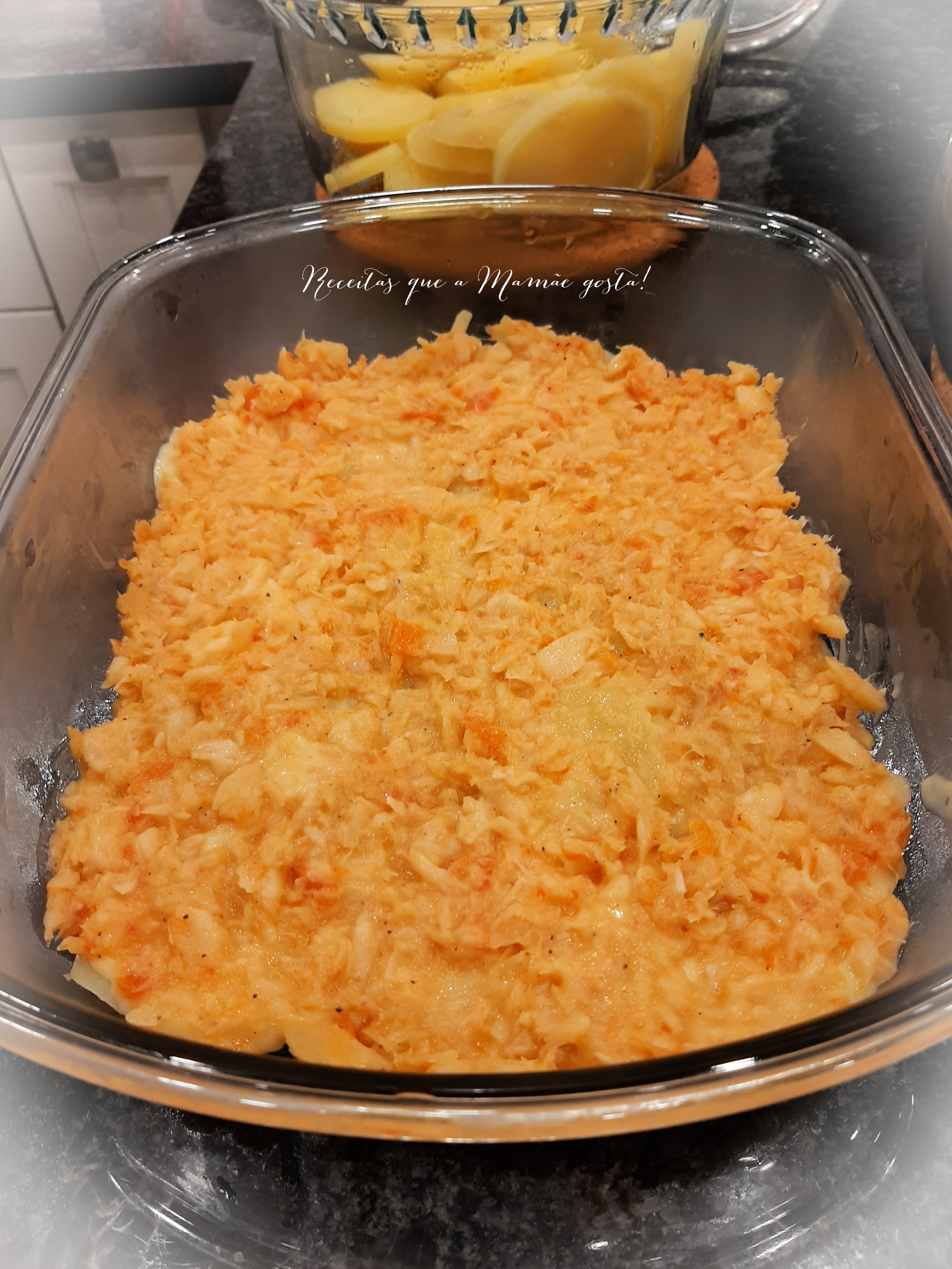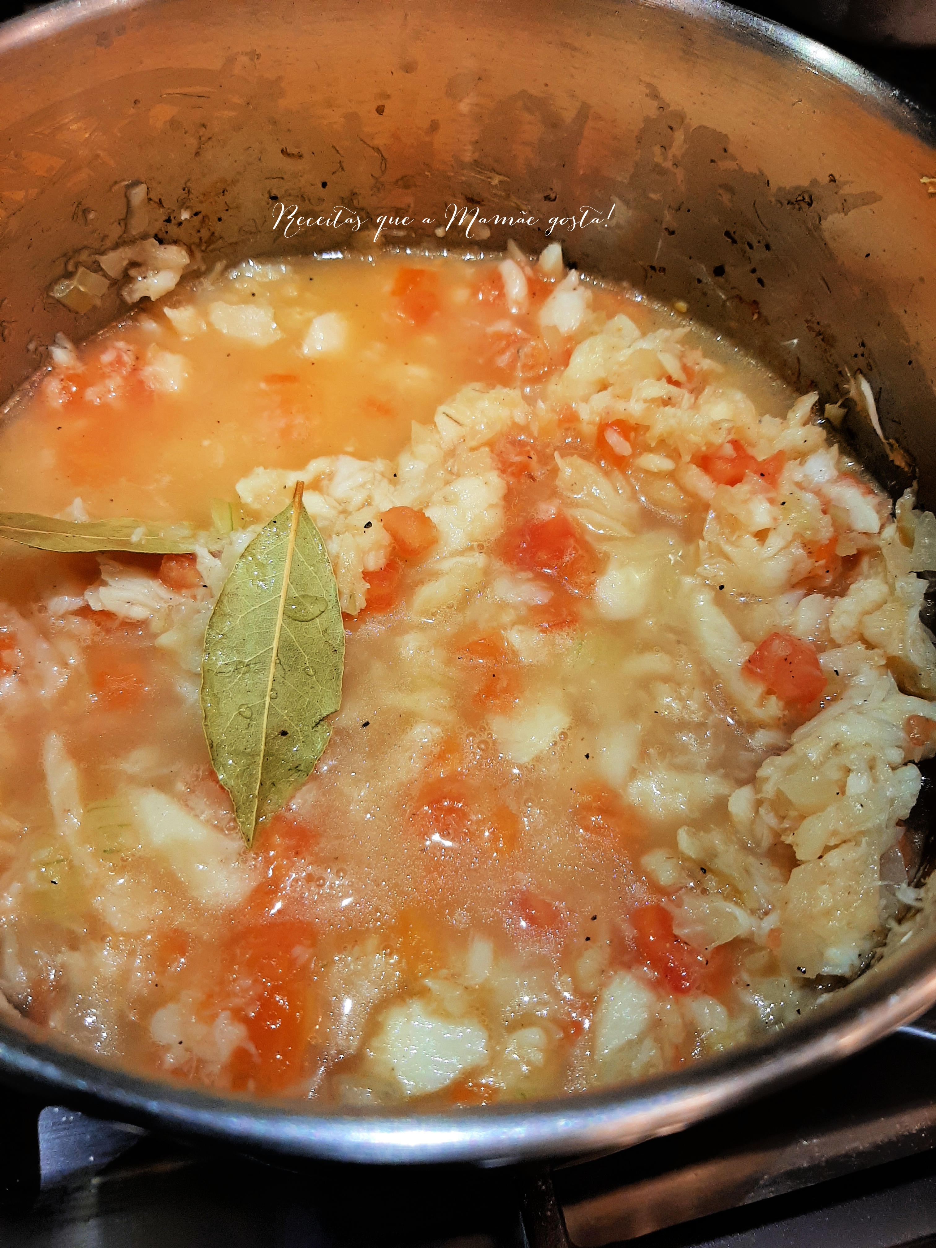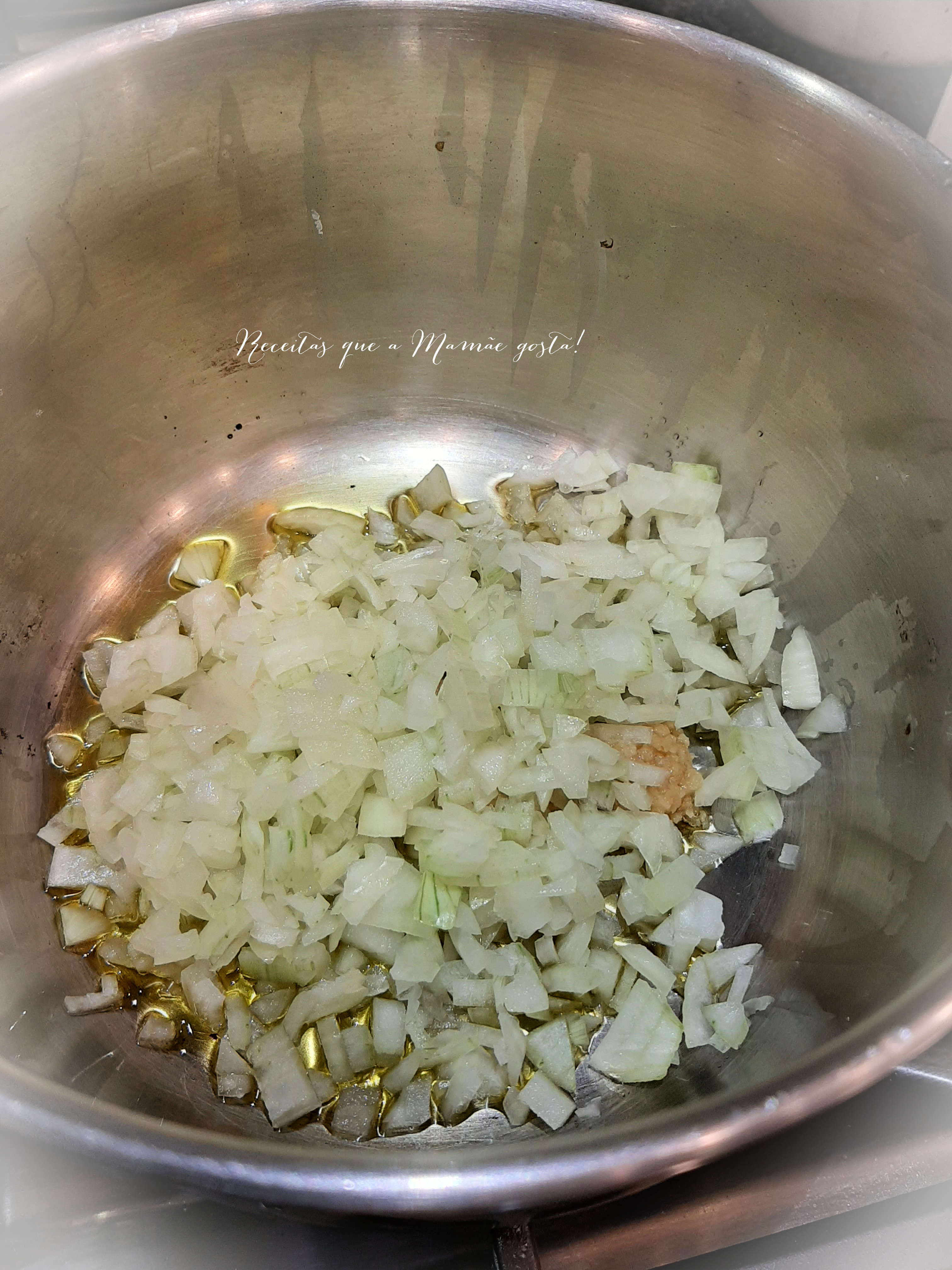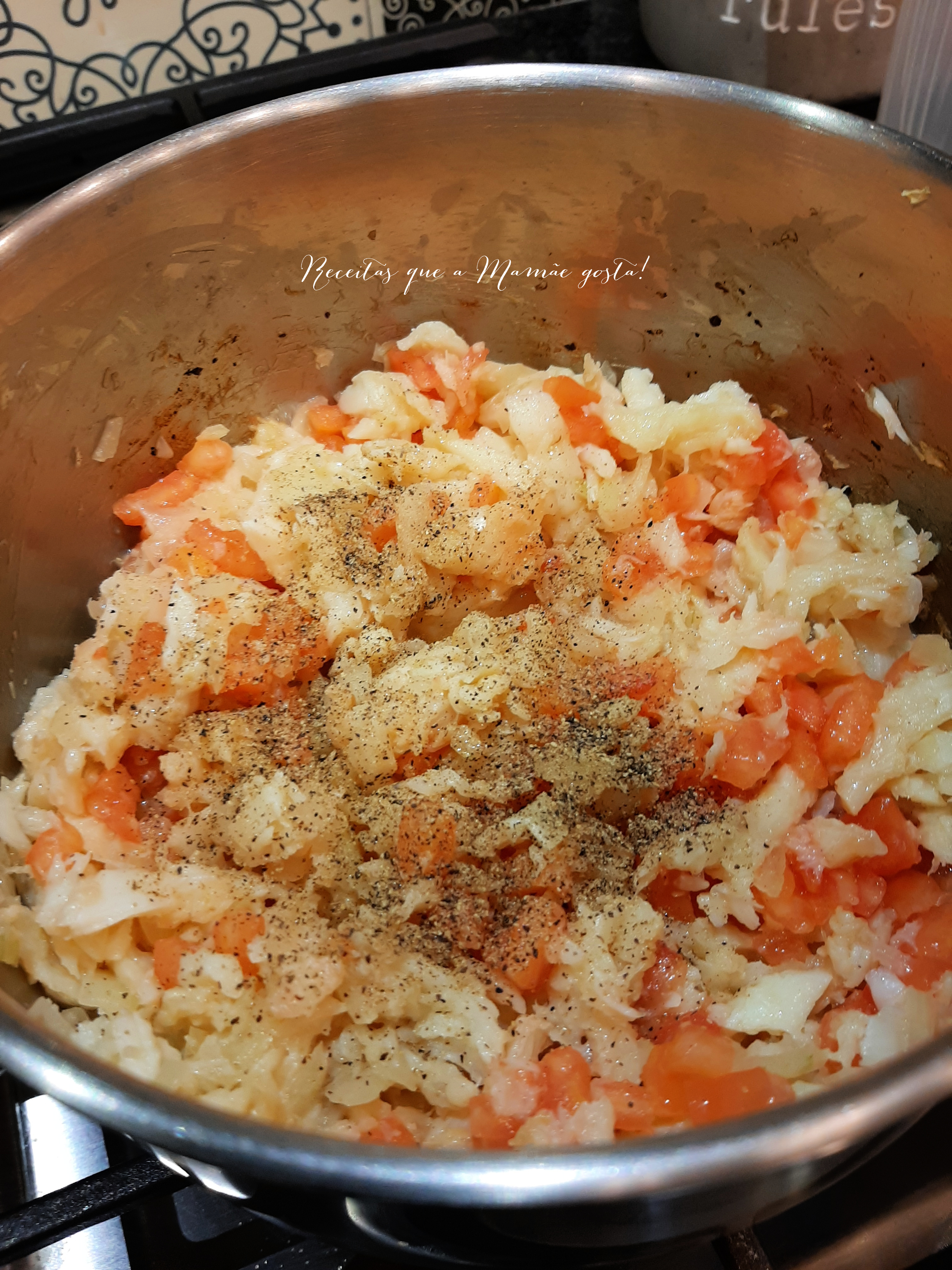 Numa panela em fogo médio, coloque um pouco de óleo e doure a cebola e o alho. Adicione o bacalhau e mexa….