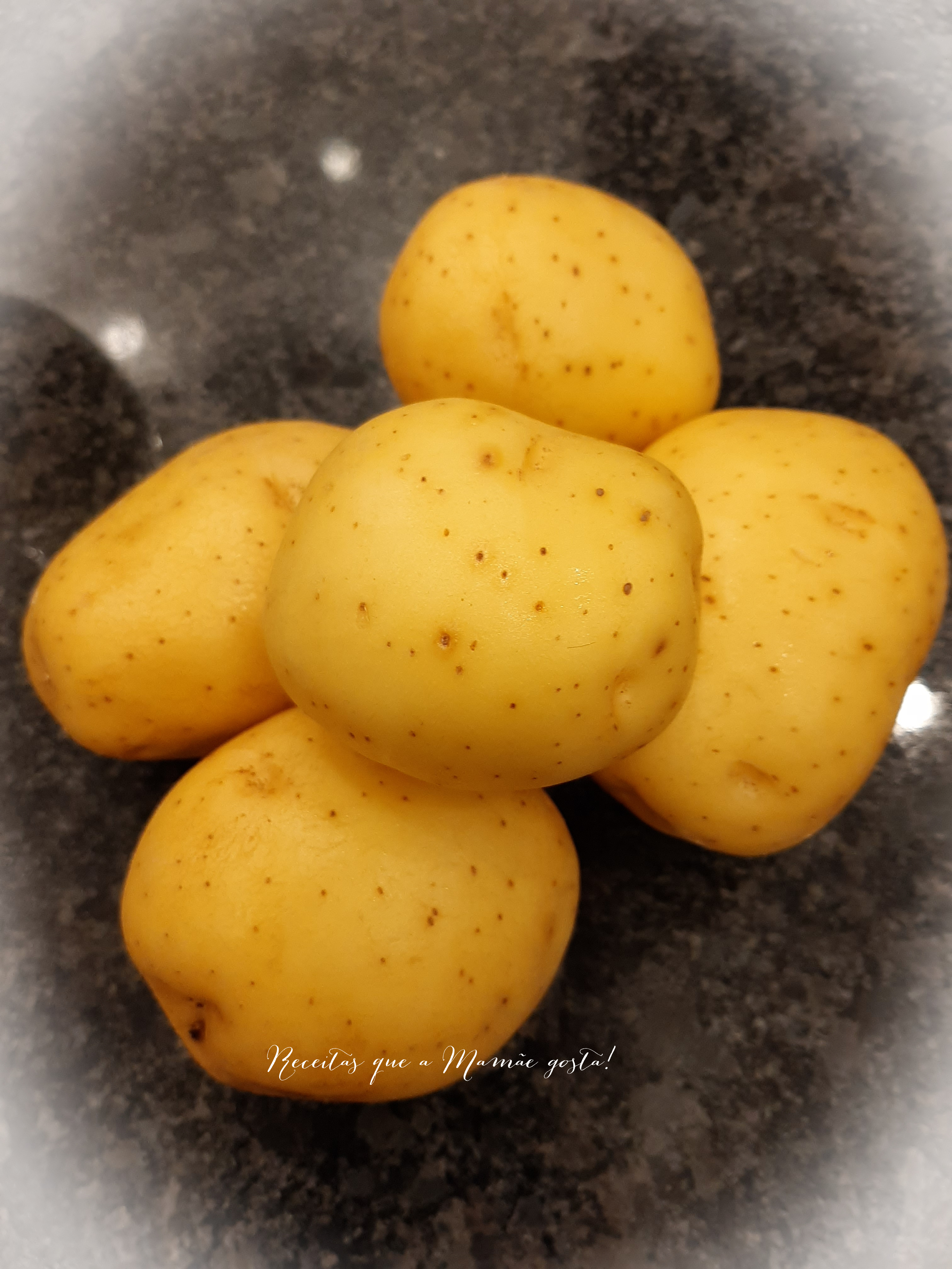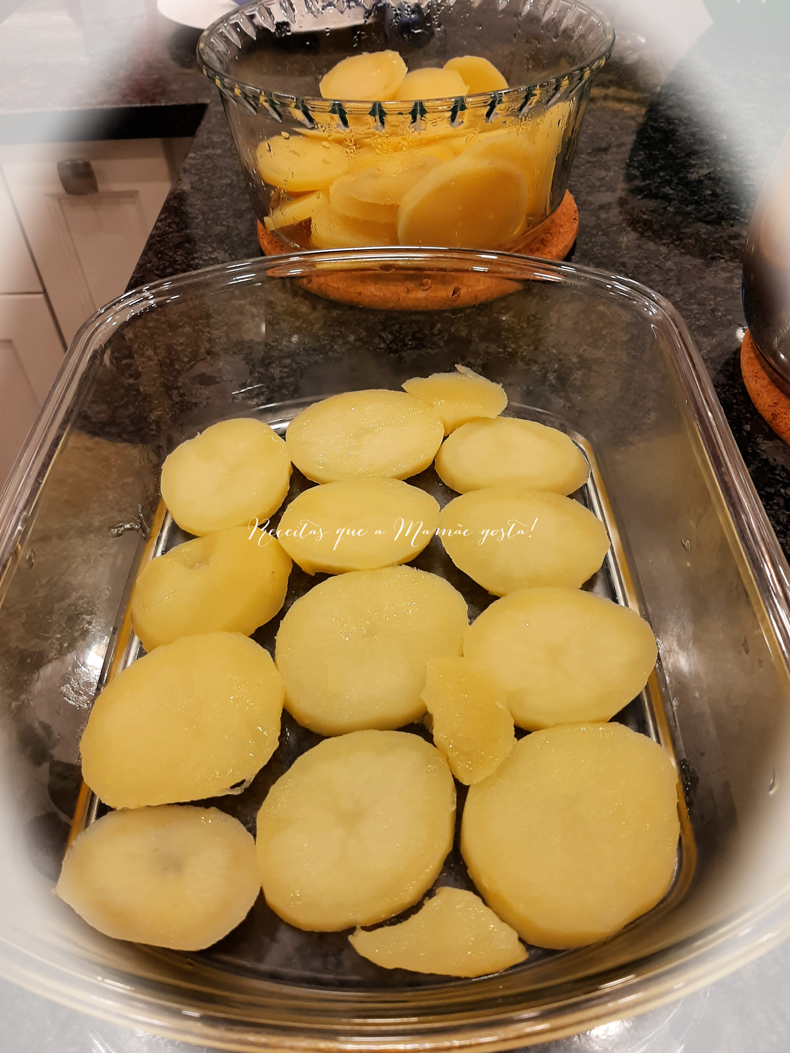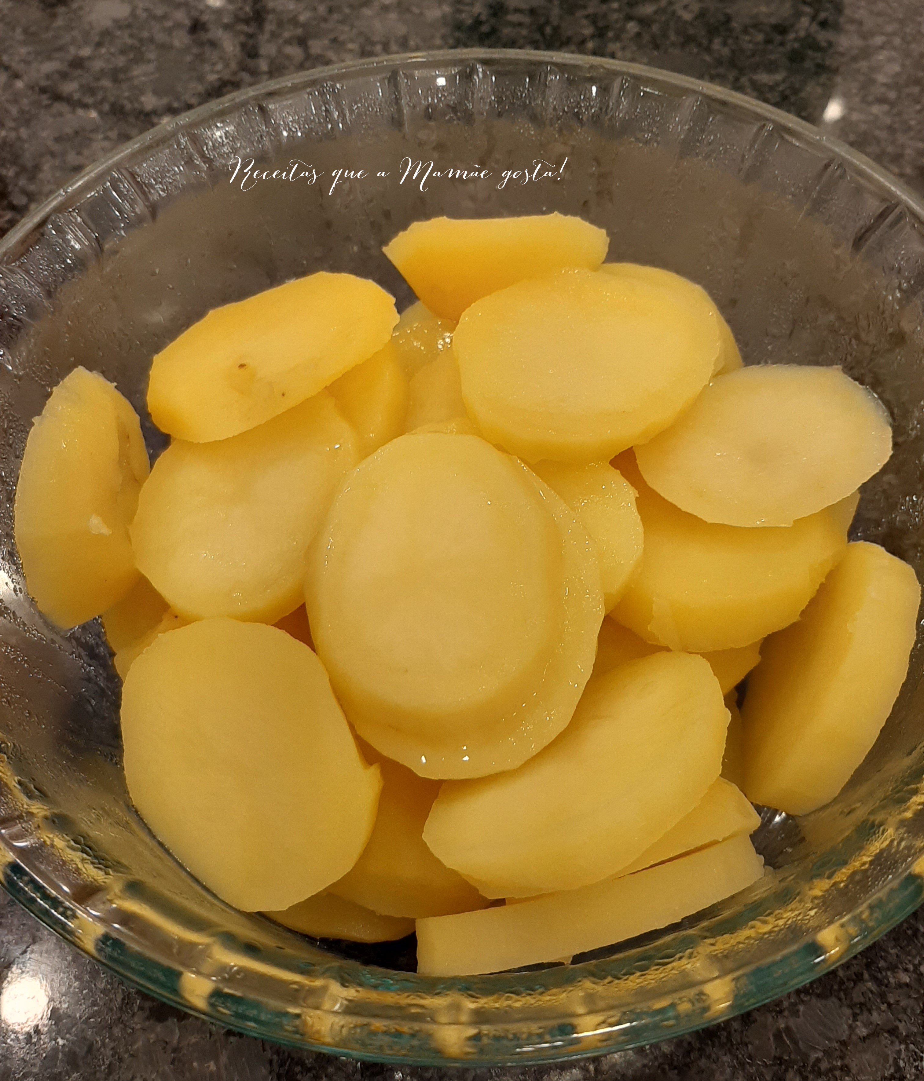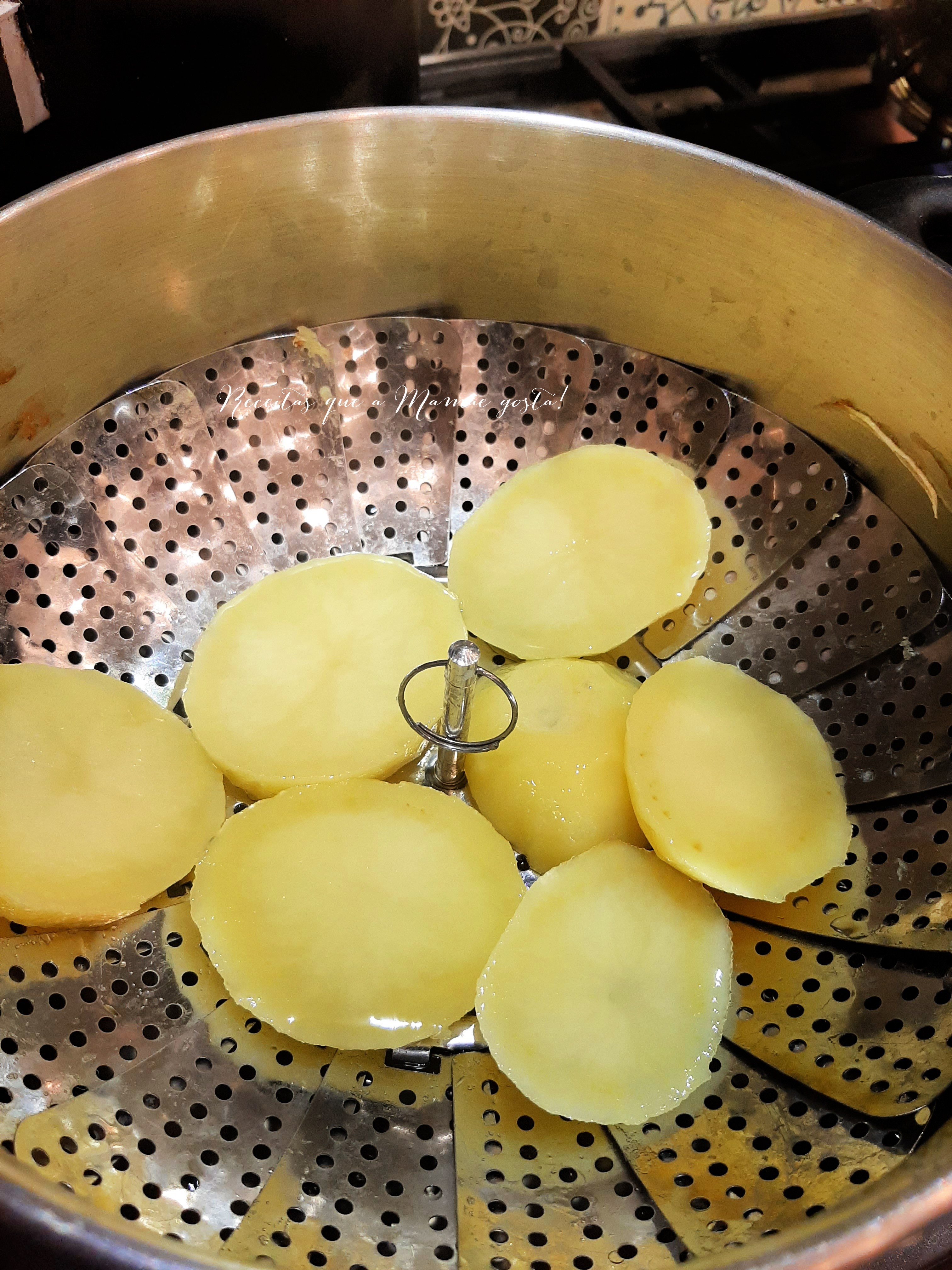 Descasque as batatas e corte-as em rodelas grossas. Cozinhe as rodelas no vapor. Reserve.