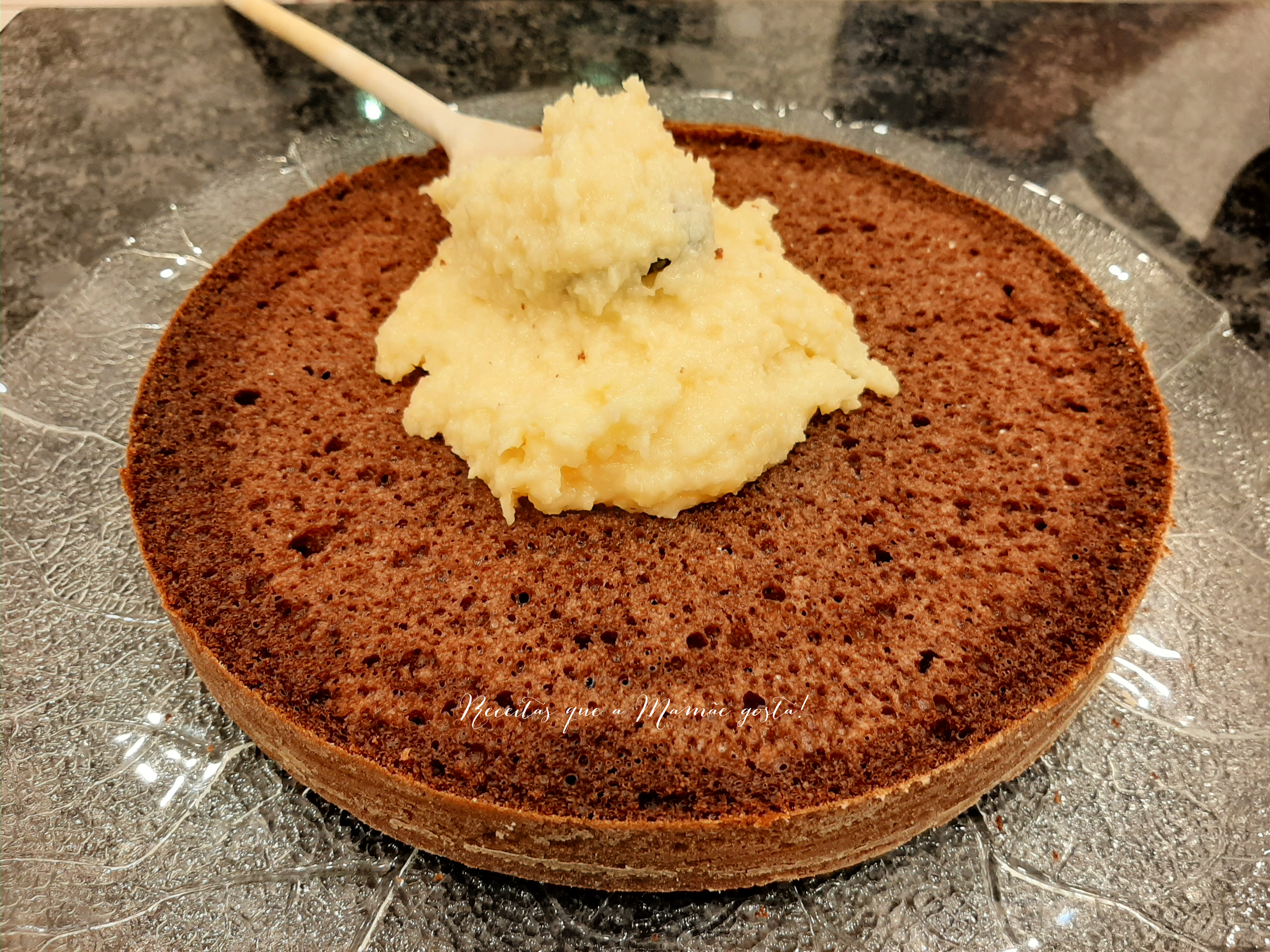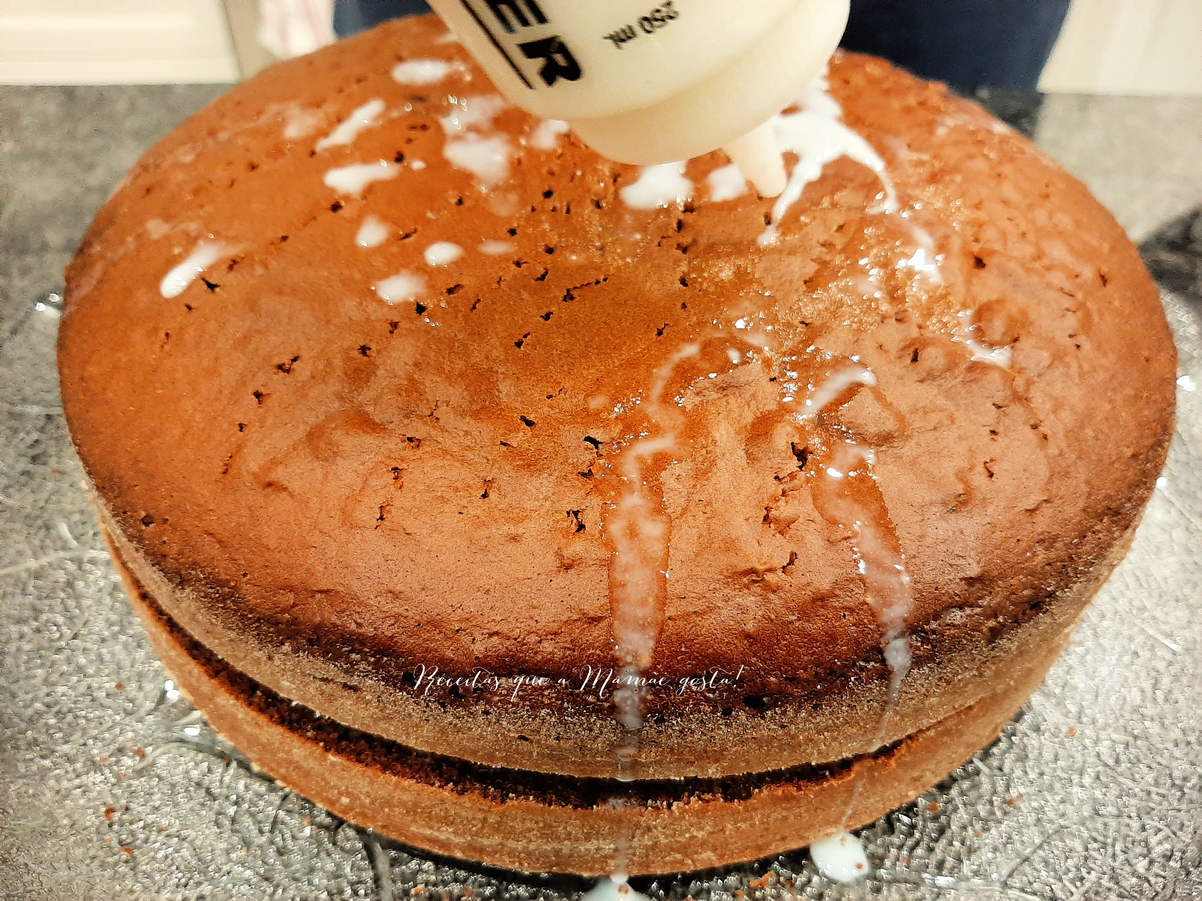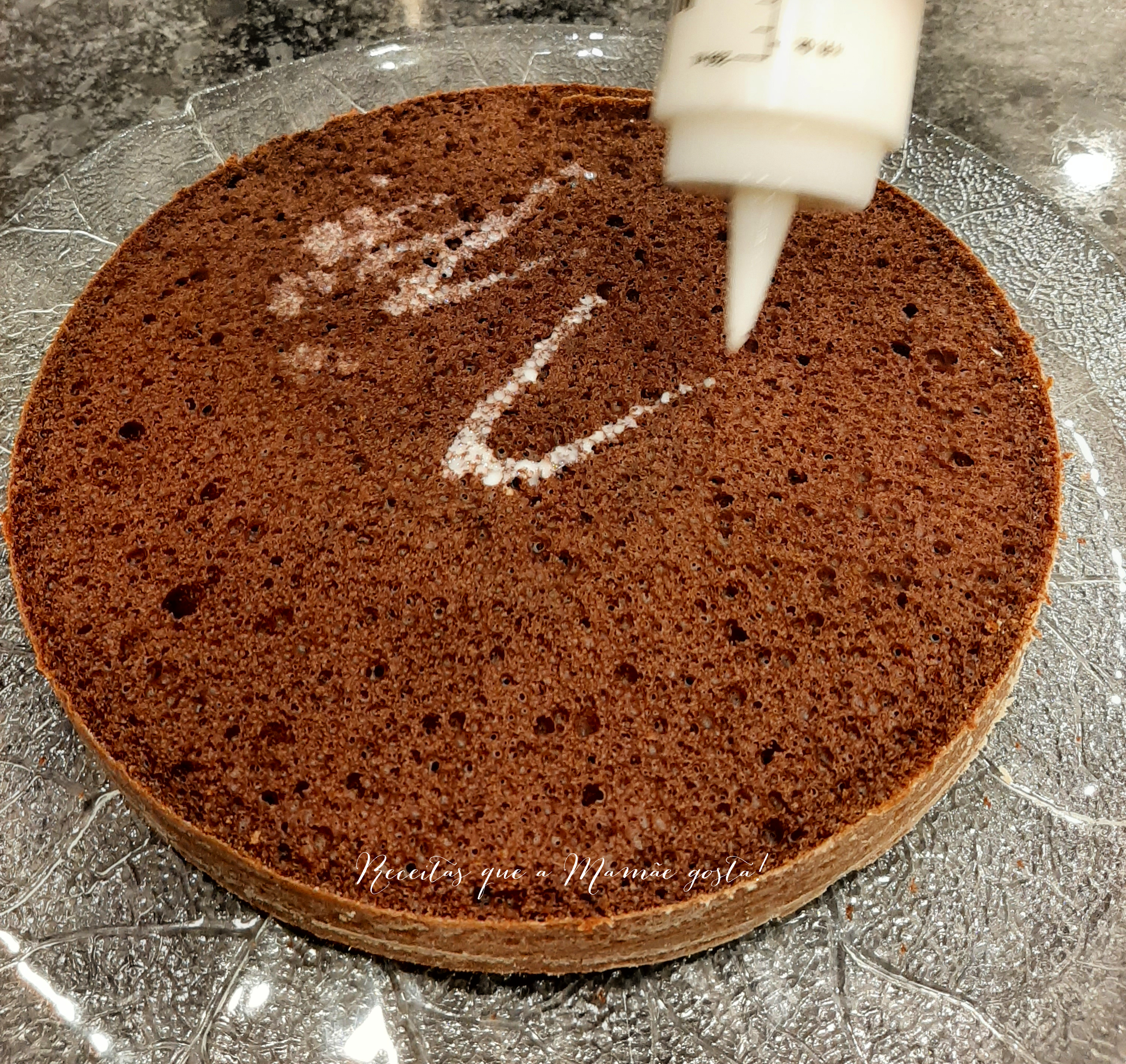Após molhar o bolo com a calda, coloque o recheio de coco sobre uma parte do bolo e esparrame. Coloque a outra parte do bolo sobre o recheio. Fure o topo do bolo com um garfo e esparrame mais da mistura da calda para ficar bem molhadinho.