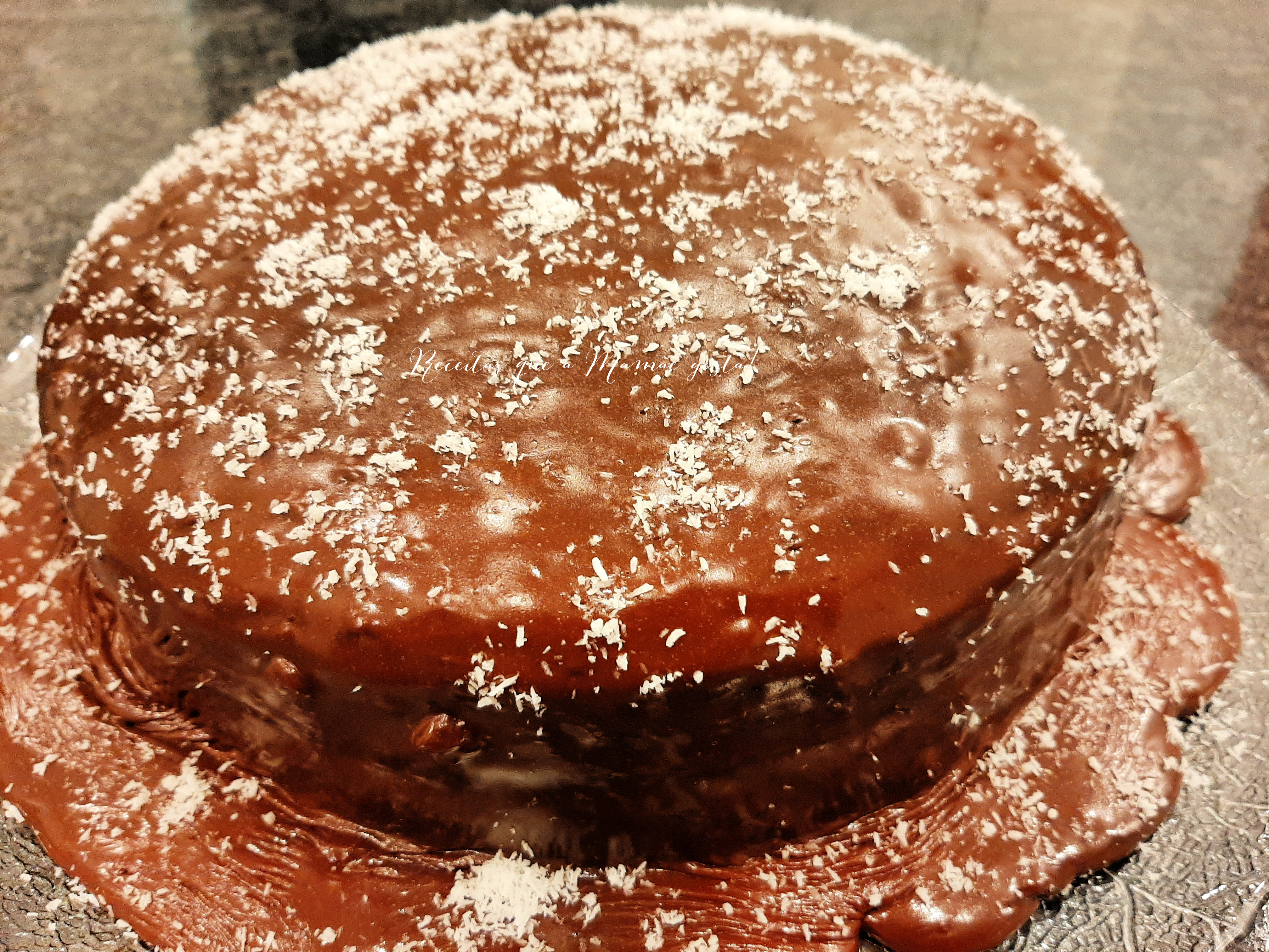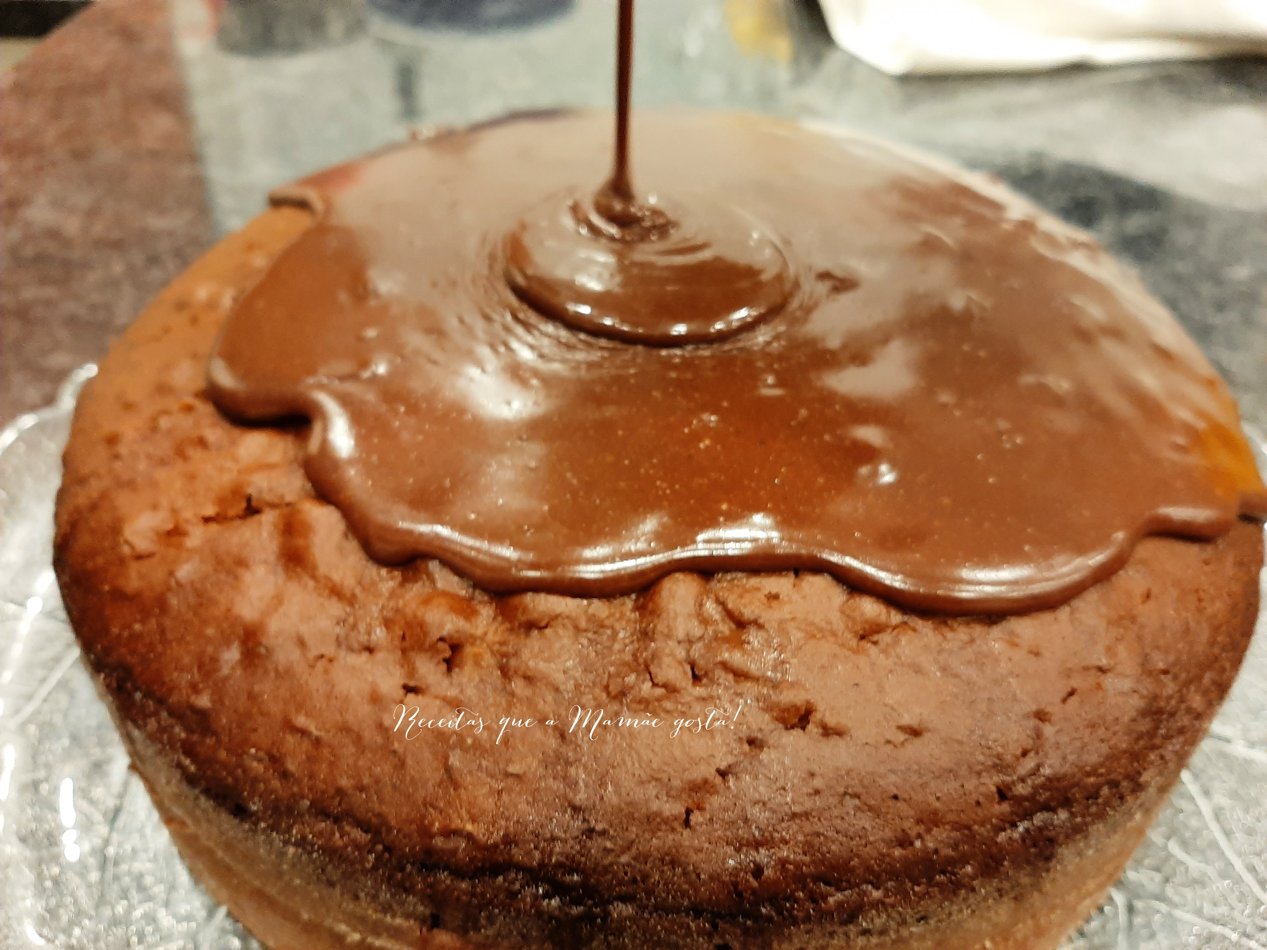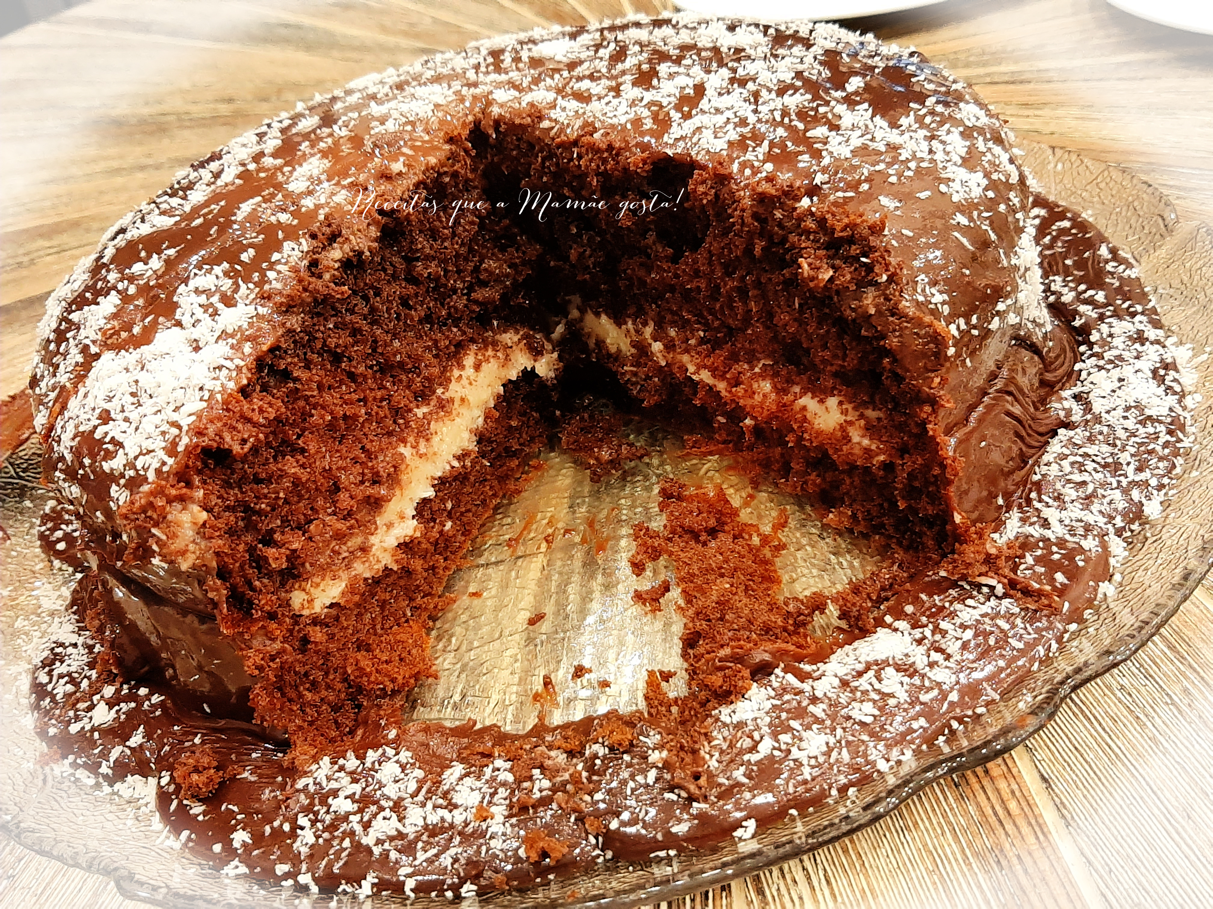 Esparrame essa cobertura de chocolate sobre o bolo e salpique coco ralado no topo.
