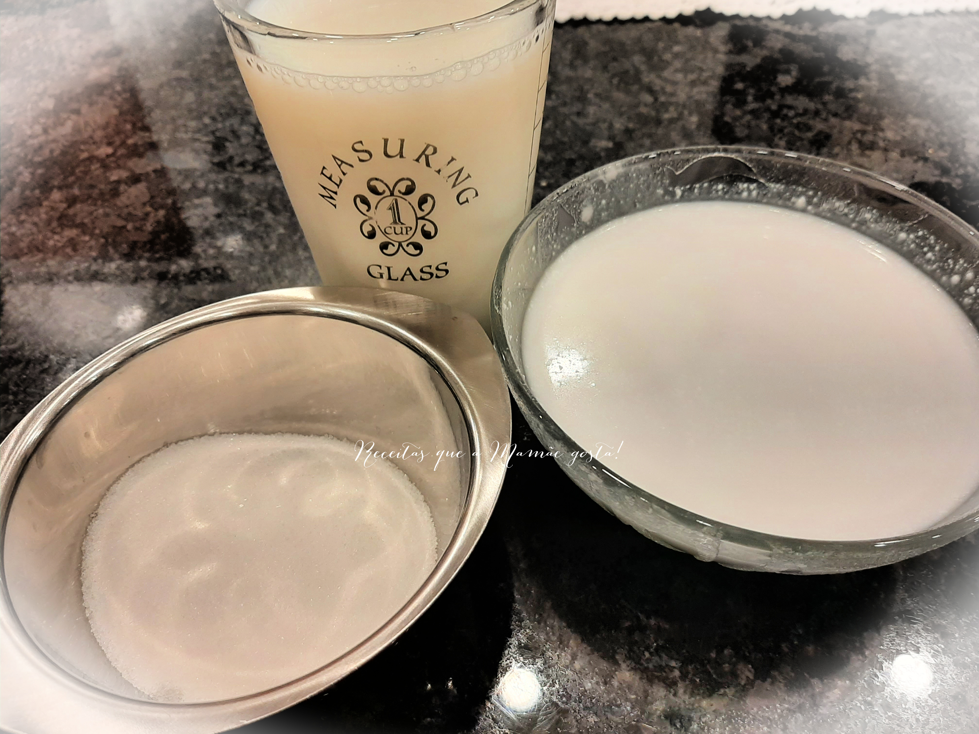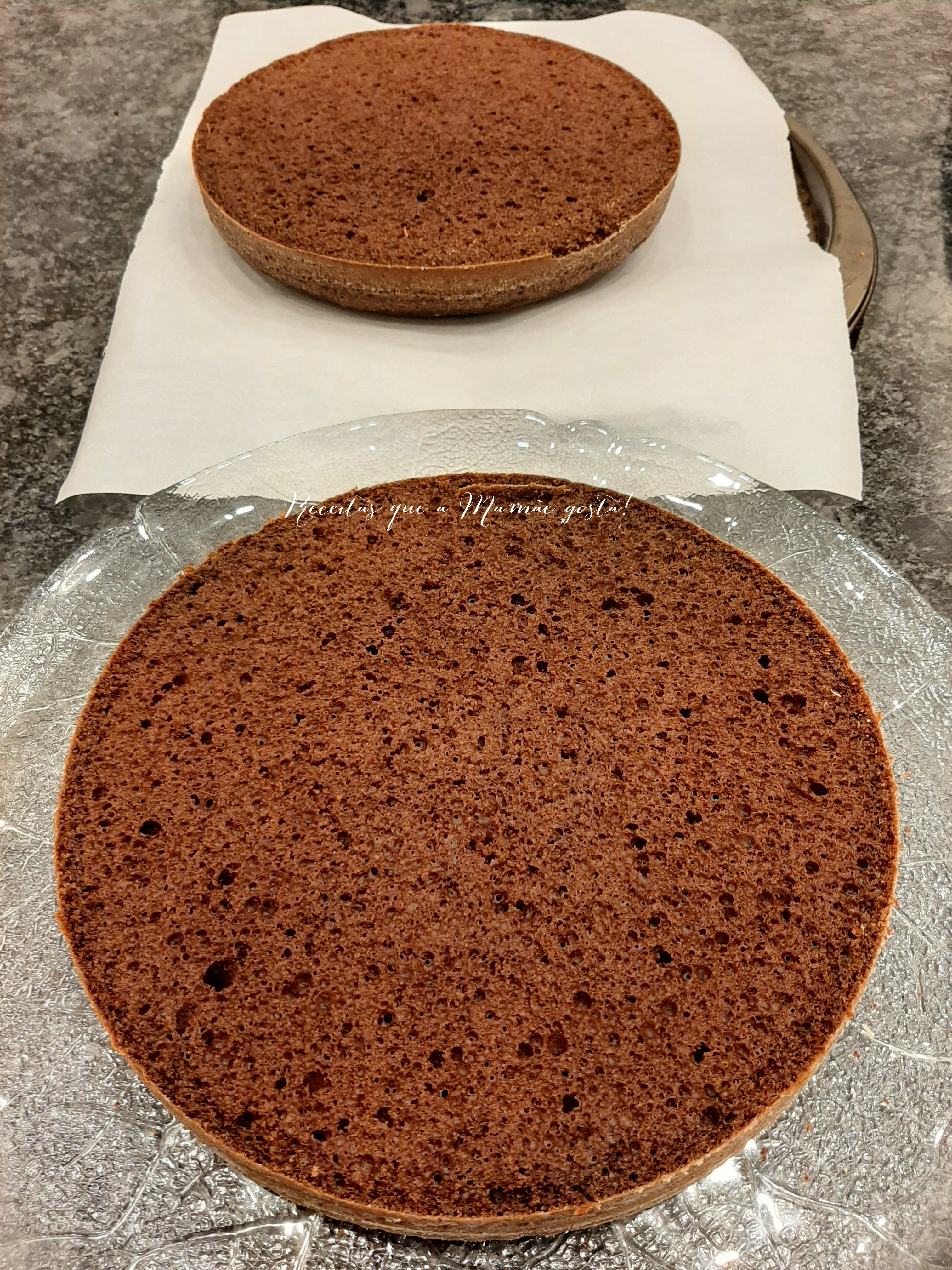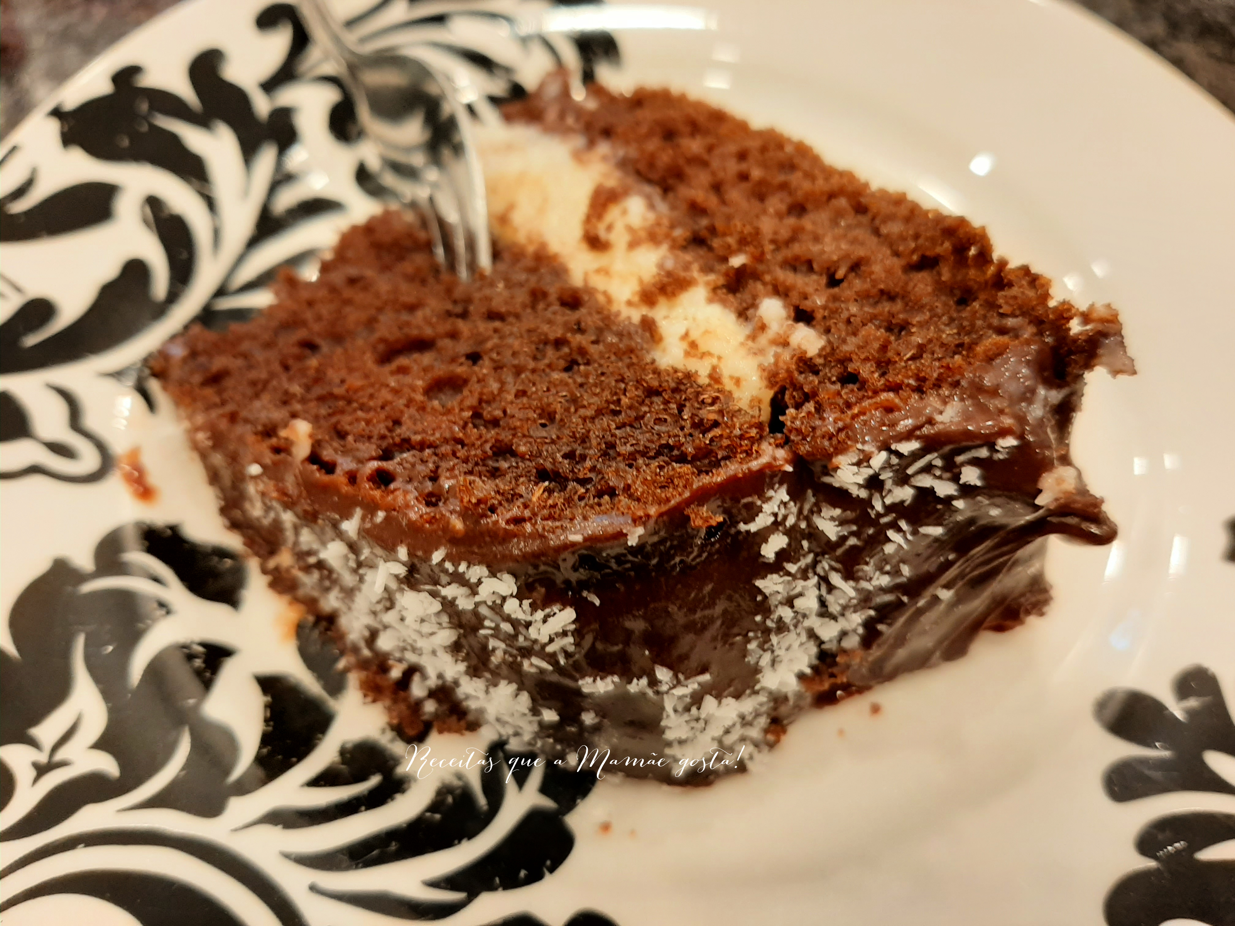 Prepare a calda misturando o leite de coco, o leite e o açúcar. Corte o bolo em duas partes, e molhe cada parte com a calda