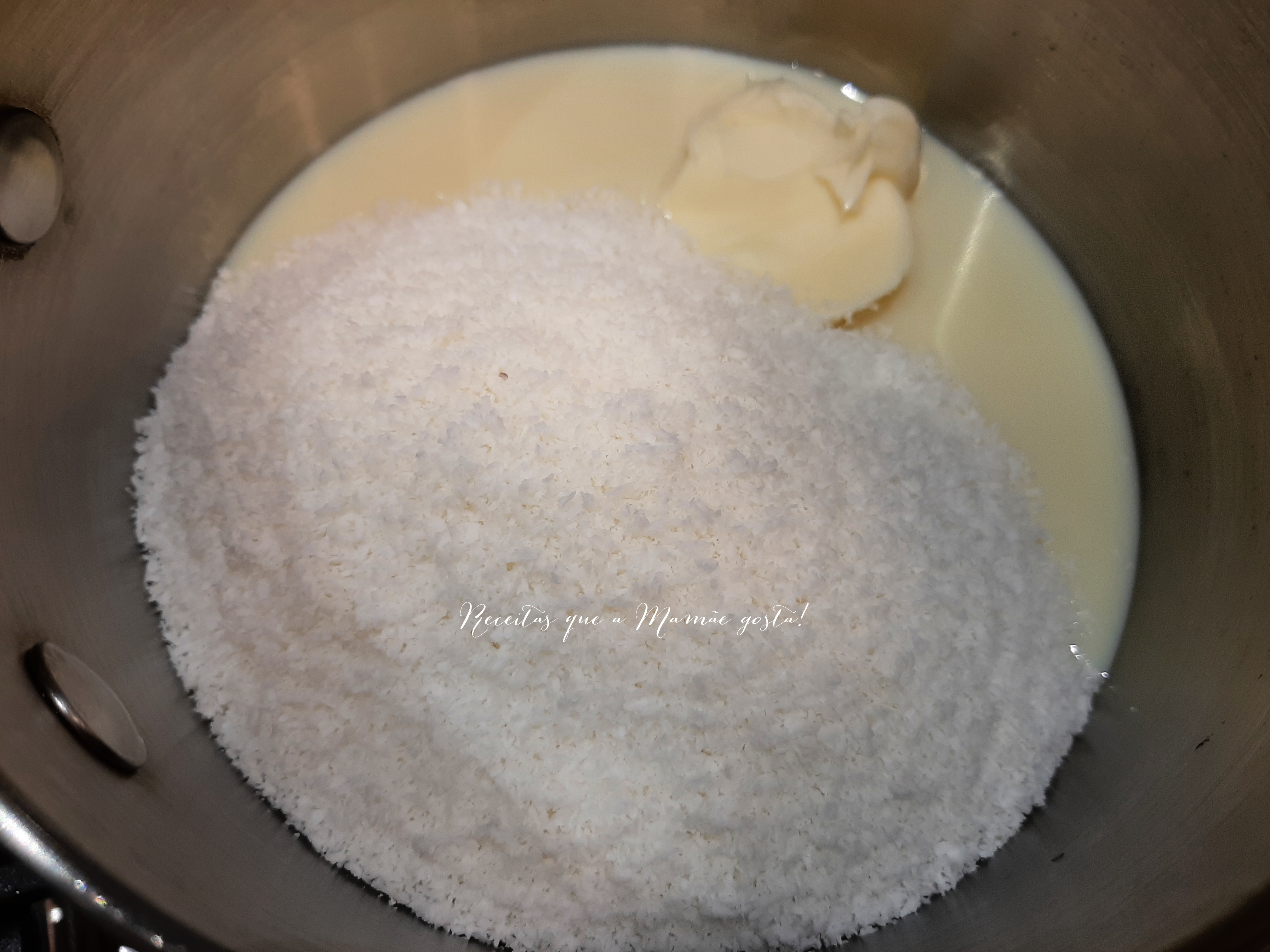 Prepare o recheio colocando o leite condensado, o coco e a margarina numa panela; misture e leve ao fogo médio-baixo, mexendo até que solte do fundo da panela. Reserve.
