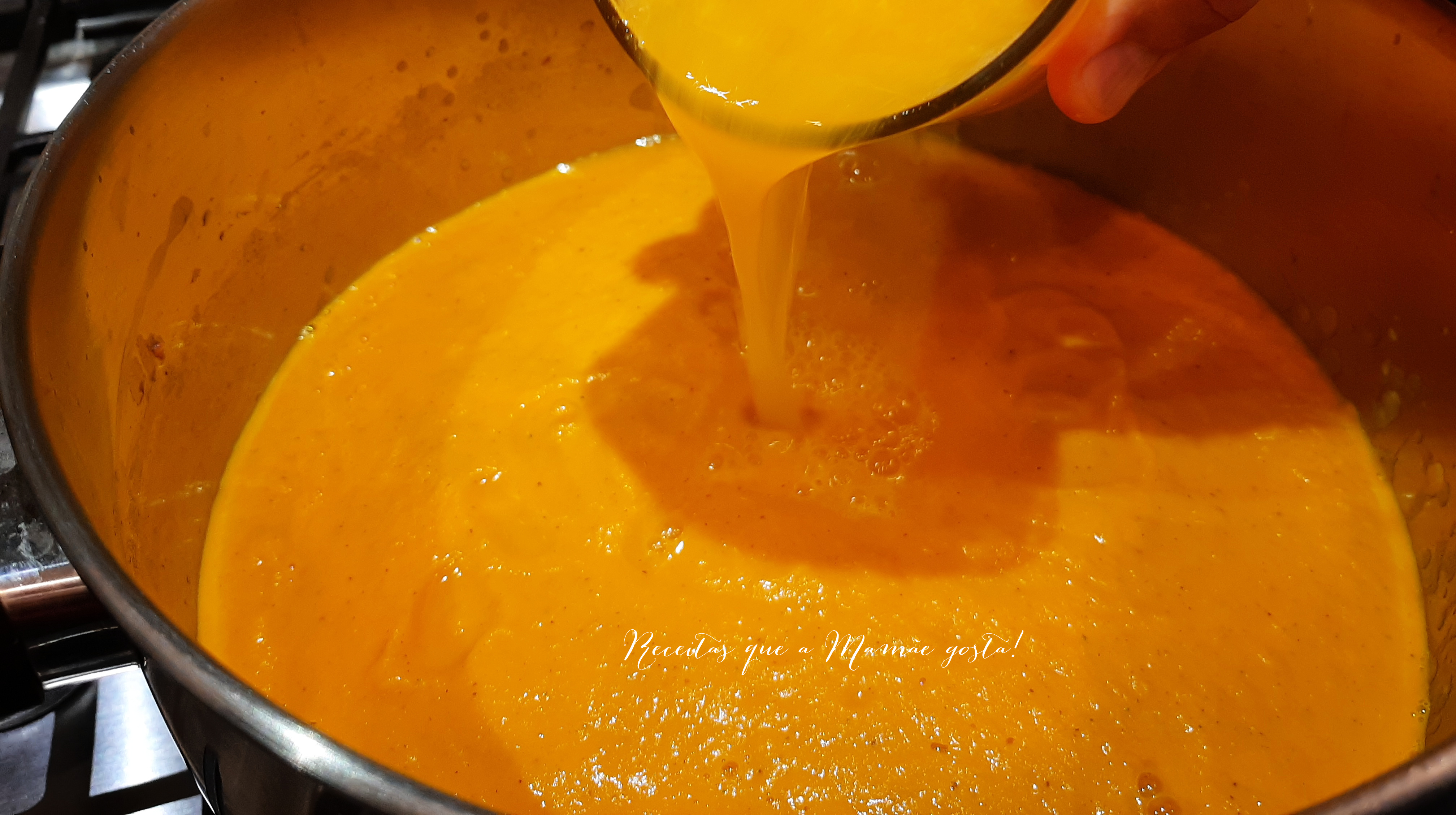 Transfira essa mistura do liquidificador para uma panela, adicione o suco da laranja e misture muito bem.