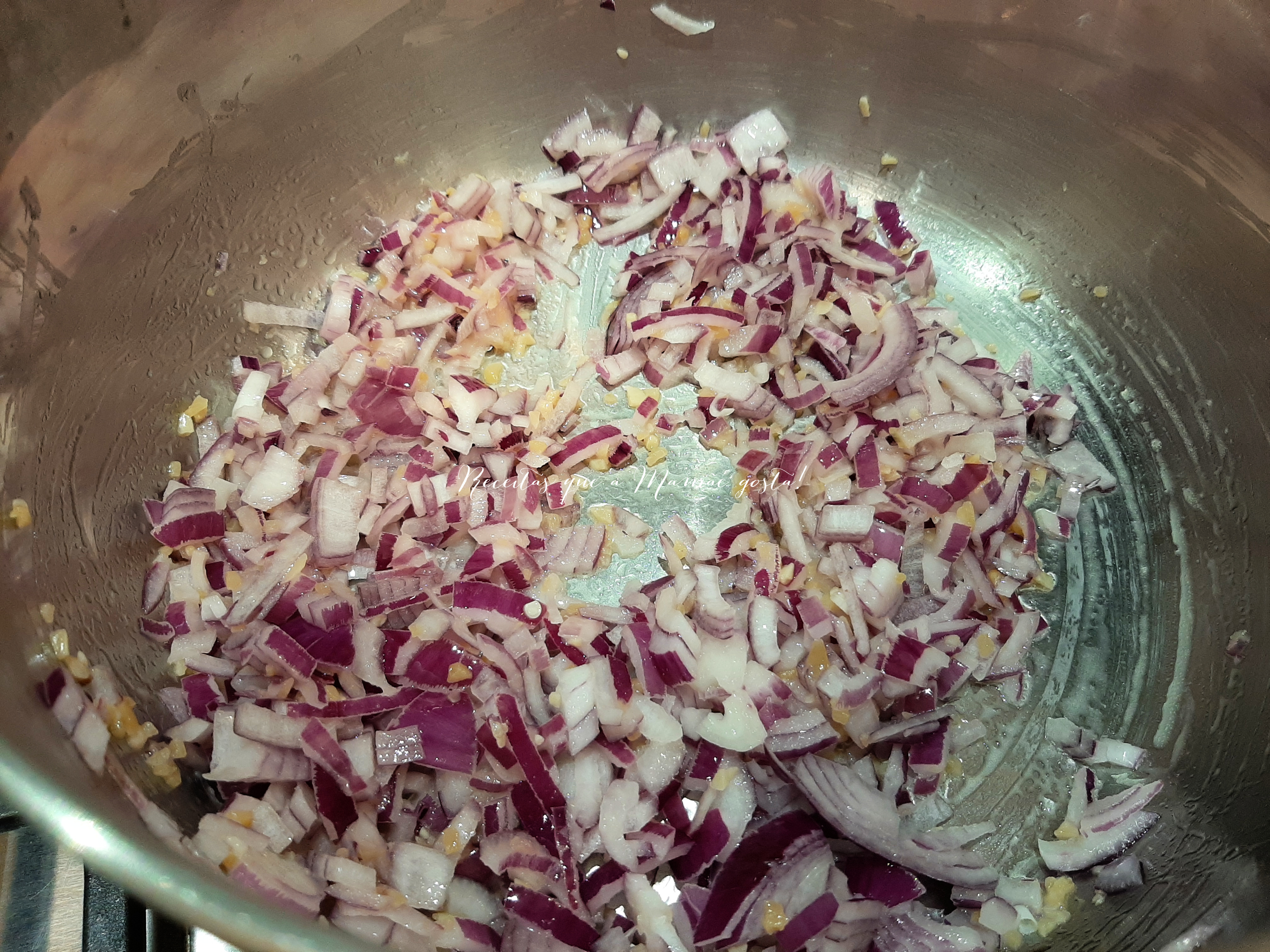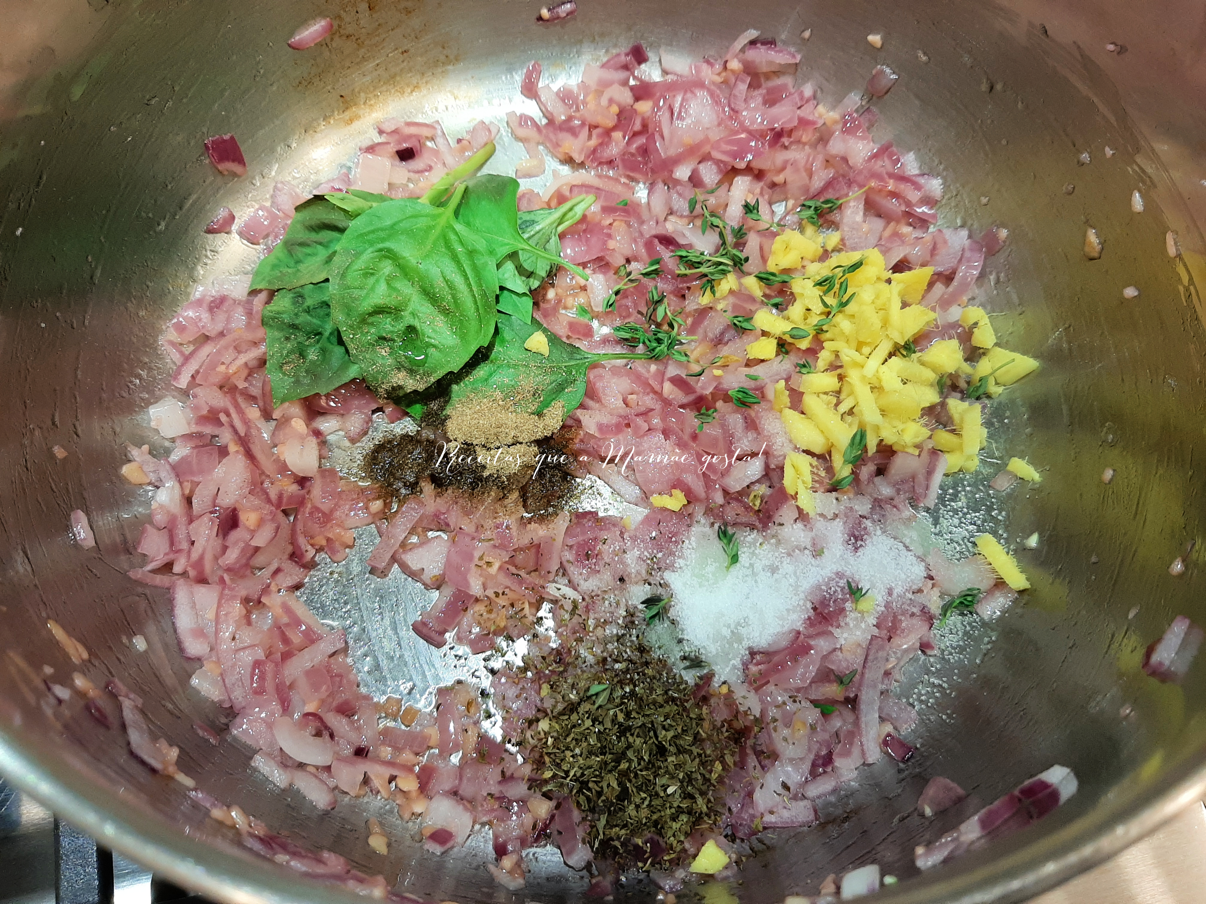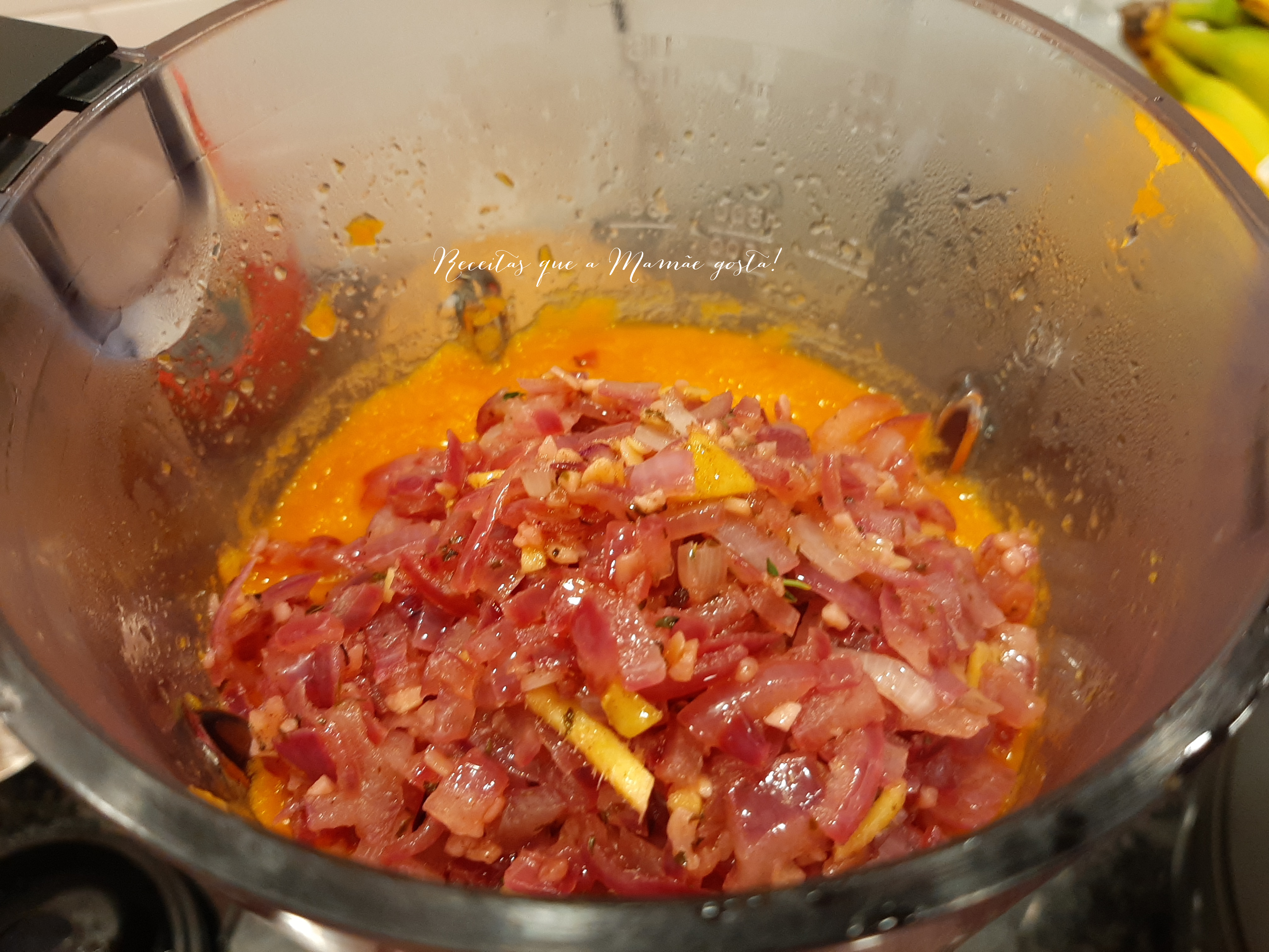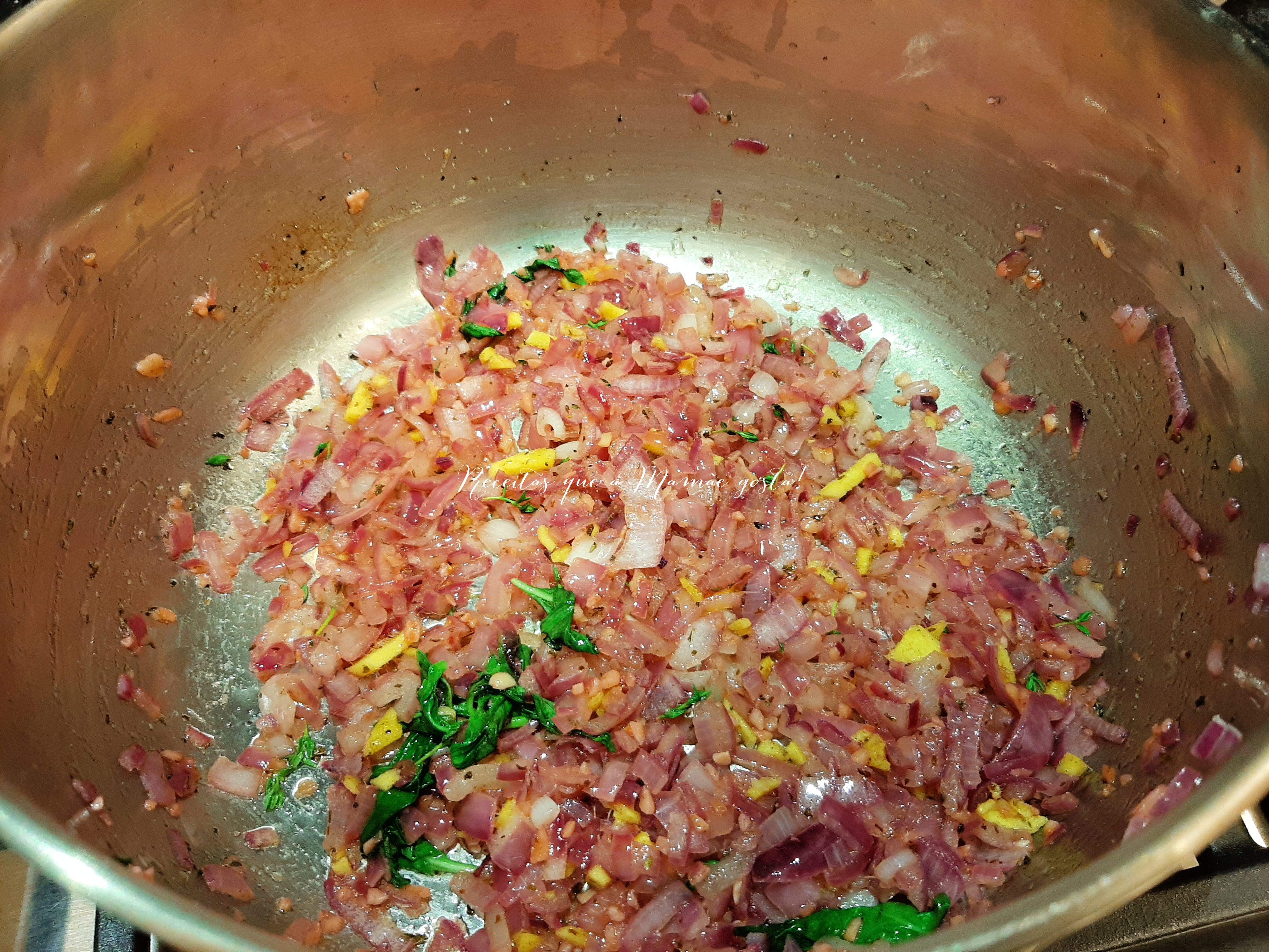 Numa outra panela, doure a cebola na manteiga por 5 minutos em fogo médio. Adicione o alho, o sal, o gengibre e temperos. Abaixe o fogo e deixe refogando por 8-10 minutos. Adicione o suco do limao.