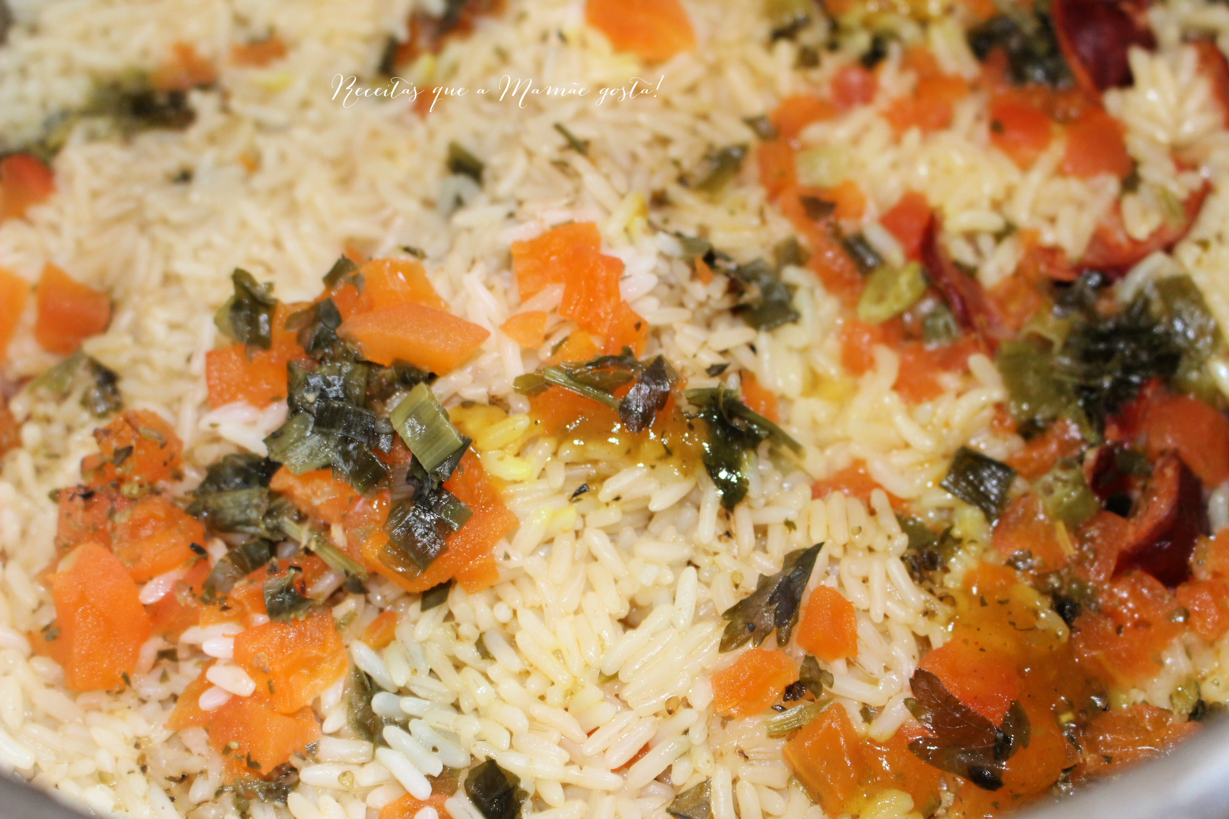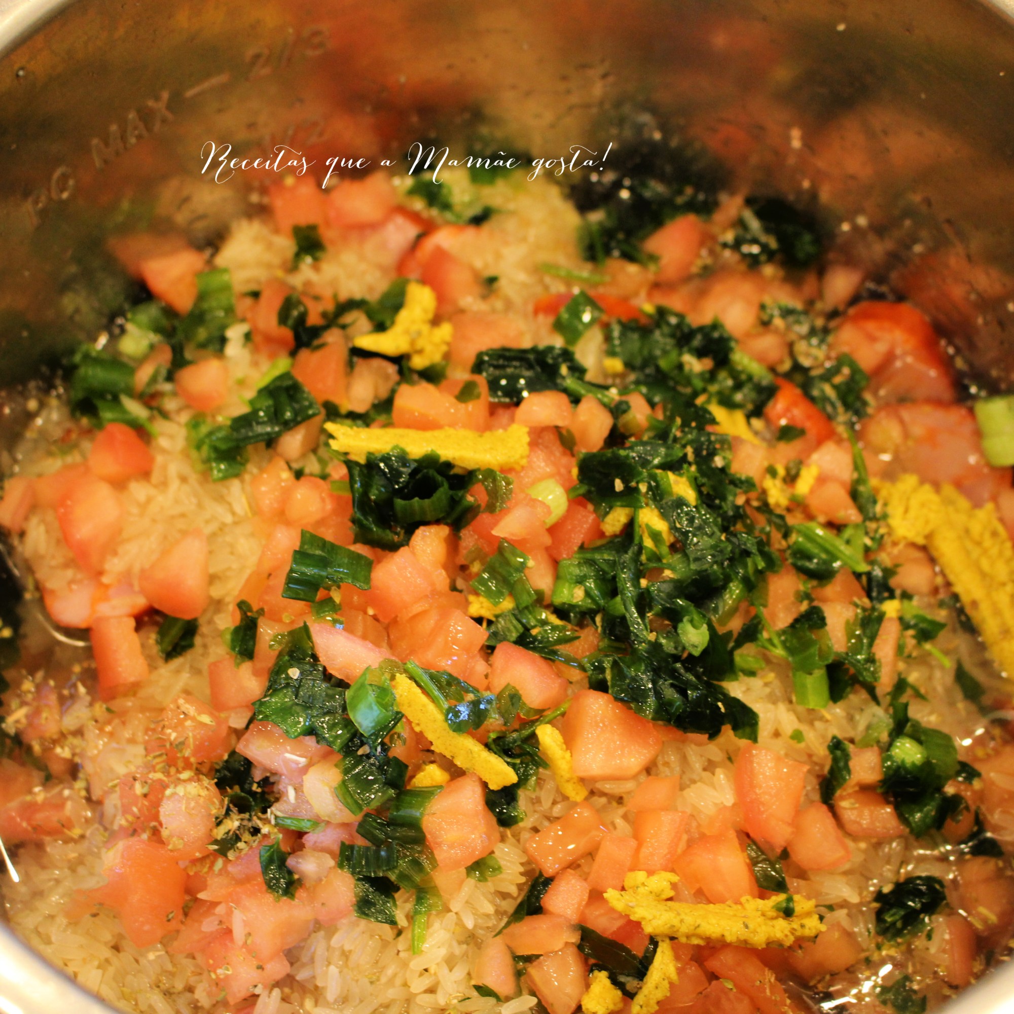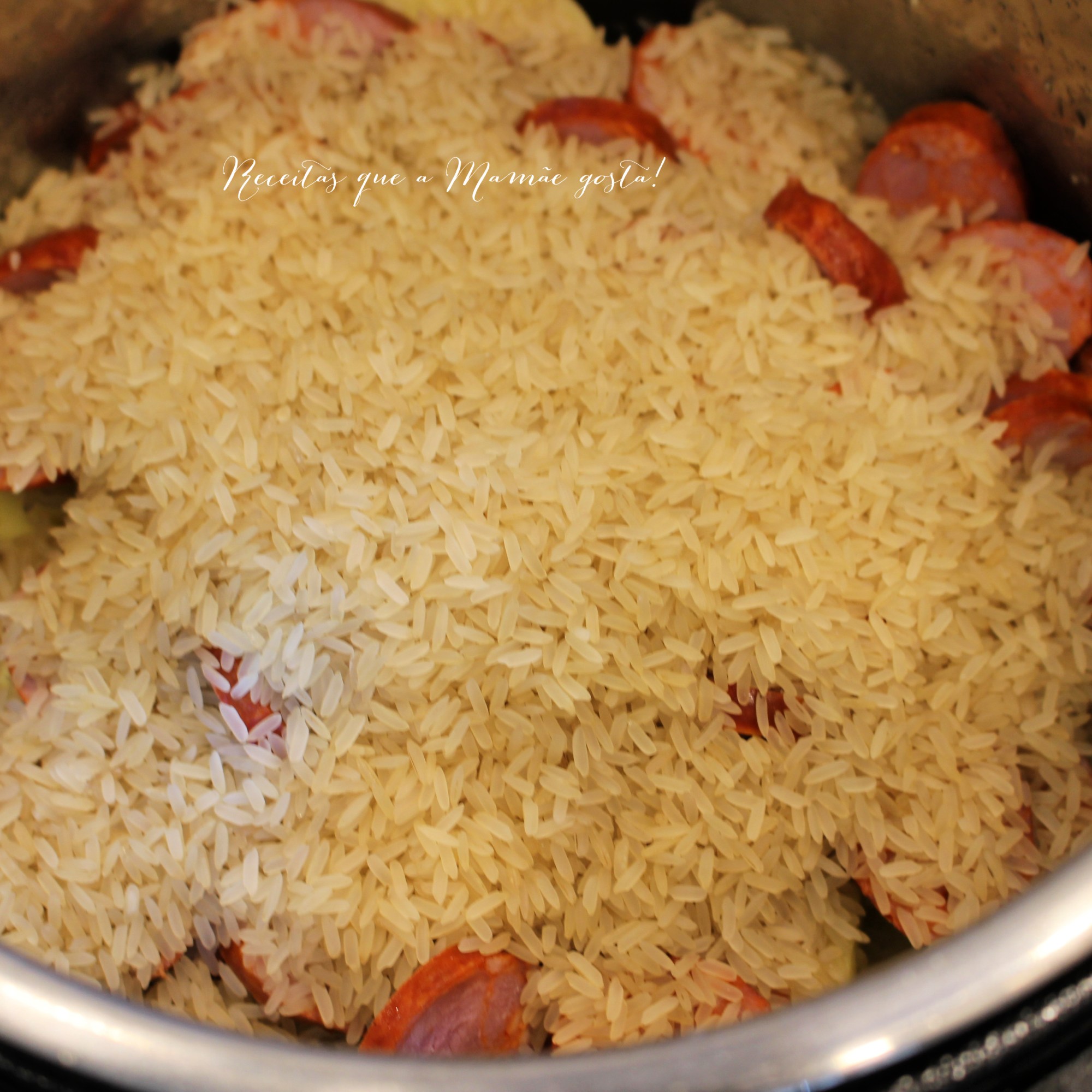 Batata, linguiça, arroz, tomate, temperos, caldo de galinha esfarelado, sal e por último a água fria.