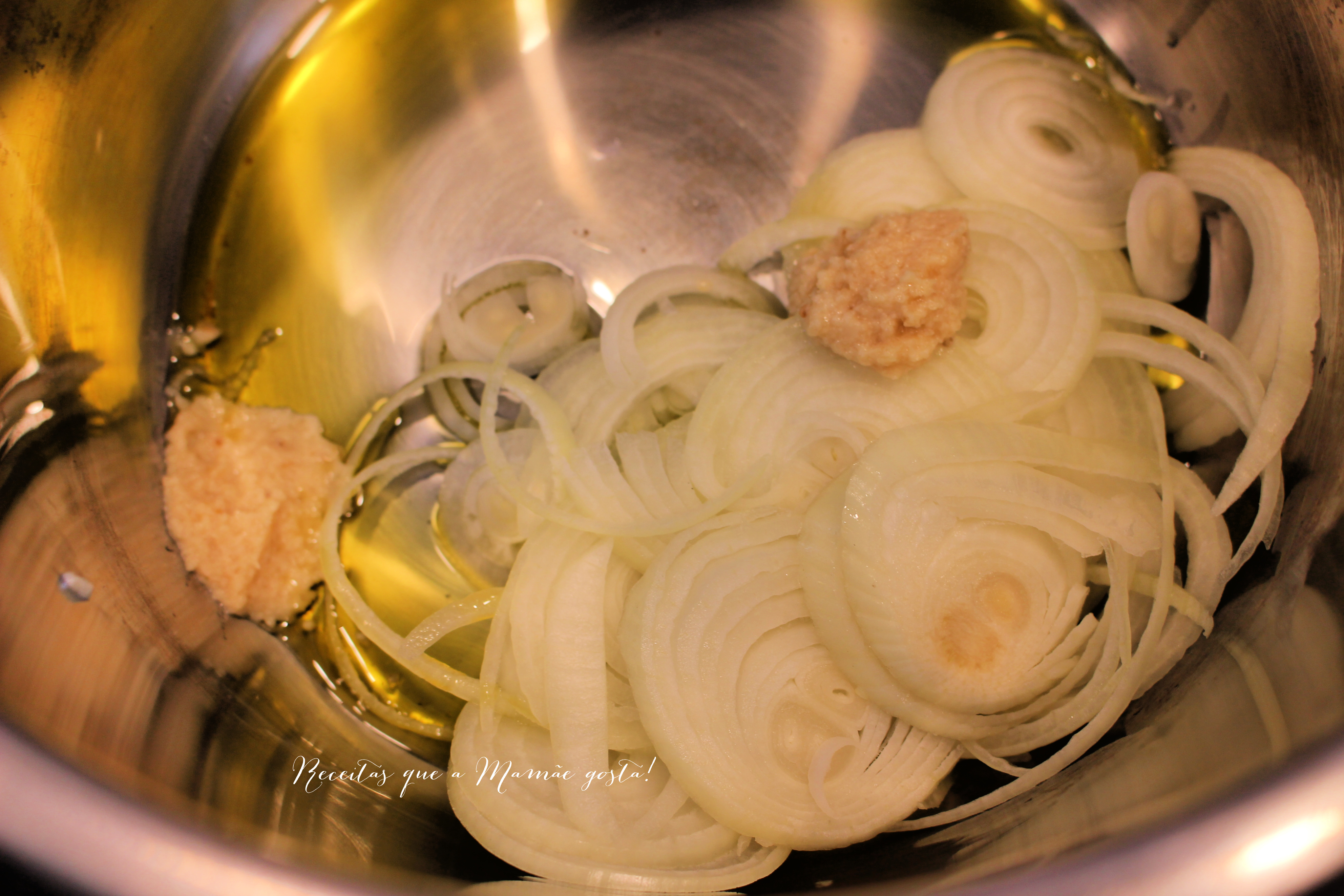 Coloque na panela de pressão o óleo, a cebola e o alho. Refogue até que a cebola fique transparente.